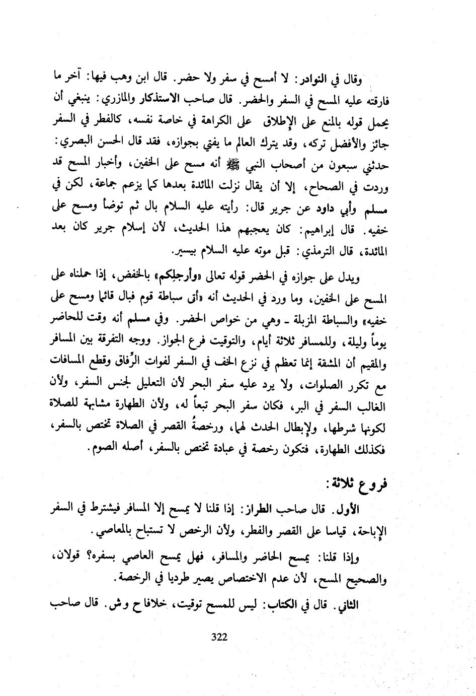 وَقَالَ فِي النَّوَادِرِ لَا أَمْسَحُ فِي سَفَرٍ وَلَا حَضَرٍ قَالَ ابْنُ وَهْبٍ فِيهَا آخِرُ مَا فَارَقْتُهُ عَلَيْهِ الْمَسْحُ فِي السَّفَرِ وَالْحَضَرِ قَالَ صَاحِبُ الِاسْتِذْكَارِ وَالْمَازِرِيُّ يَنْبَغِي أَنْ يُحْمَلَ قَوْلُهُ بِالْمَنْعِ عَلَى الْإِطْلَاقِ عَلَى الْكَرَاهَةِ فِي خَاصَّةِ نَفْسِهِ كَالْفِطْرِ فِي السَّفَرِ جَائِزٌ وَالْأَفْضَلُ تَرْكُهُ وَقَدْ يَتْرُكُ الْعَالِمُ مَا يُفْتِي بِجَوَازِهِ فَقَدْ قَالَ الْحَسَنُ الْبَصْرِيُّ حَدَّثَنِي سَبْعُونَ مِنْ أَصْحَاب النَّبِي - صَلَّى اللَّهُ عَلَيْهِ وَسَلَّم َ - أَنَّهُ مَسَحَ عَلَى الْخُفَّيْنِ وَأَخْبَارُ الْمَسْحِ قَدْ وَرَدَتْ فِي الصِّحَاحِ إِلَّا أَنْ يُقَالَ نَزَلَتِ الْمَائِدَةُ بَعْدَهَا كَمَا يَزْعُمُ جَمَاعَةٌ لَكِنْ فِي مُسْلِمٍ وَأَبِي دَاوُدَ عَنْ جَرِيرٍ قَالَ رَأَيْتُهُ عَلَيْهِ السَّلَامُ بَالَ ثُمَّ تَوَضَّأَ وَمَسَحَ عَلَى خُفَّيْهِ قَالَ إِبْرَاهِيمُ كَانَ يُعْجِبُهُمْ هَذَا الْحَدِيثُ لِأَنَّ إِسْلَامَ جَرِيرٍ كَانَ بَعْدَ الْمَائِدَةِ قَالَ التِّرْمِذِيُّ قَبْلَ مَوْتِهِ عَلَيْهِ السَّلَامُ بِيَسِيرٍ وَيَدُلُّ عَلَى جَوَازِهِ فِي الْحَضَرِ قَوْله تَعَالَى {وَأَرْجُلَكُمْ} بِالْخَفْضِ إِذَا حَمَلْنَاهُ عَلَى الْمَسْحِ عَلَى الْخُفَّيْنِ وَمَا وَرَدَ فِي الْحَدِيثِ أَنَّهُ