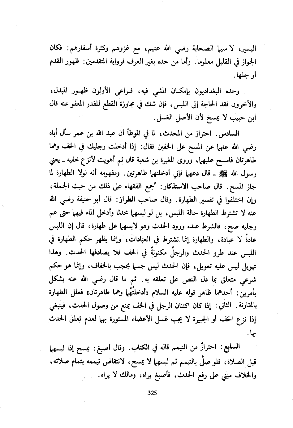 الْيَسِيرِ لَا سِيَّمَا الصَّحَابَةُ رَضِيَ اللَّهُ عَنْهُمْ مَعَ غَزْوِهِمْ وَكَثْرَةِ أَسْفَارِهِمْ فَكَانَ الْجَوَازُ فِي الْقَلِيلِ مَعْلُومًا وَأَمَّا مَنْ حَدَّهُ بِغَيْرِ الْعُرْفِ فَرِوَايَةُ الْمُتَقَدِّمِينَ ظُهُورُ الْقَدَمِ أَوْ جُلُّهَا وَحَدَّهُ الْبَغْدَادِيُّونَ بِإِمْكَانِ الْمَشْيِ فِيهِ فَرَاعَى الْأَوَّلُونَ ظُهُورَ الْمُبْدَلِ وَالْآخَرُونَ فَقْدَ الْحَاجَةِ إِلَى اللُّبْسِ فَإِنْ شَكَّ فِي مُجَاوَزَةِ الْقَطْعِ لِلْقَدْرِ الْمَعْفُوِّ عَنْهُ قَالَ ابْنُ حَبِيبٍ لَا يَمْسَحُ لِأَنَّ الْأَصْلَ الْغَسْلُ السَّادِسُ احْتِرَازٌ مِنَ الْمُحْدِثِ لِمَا فِي الْمُوَطَّأِ أَنَّ عَبْدَ اللَّهِ بْنَ عُمَرَ سَأَلَ أَبَاهُ رَضِيَ اللَّهُ عَنْهُمَا عَنِ الْمَسْحِ عَلَى الْخُفَّيْنِ فَقَالَ إِذَا أَدْخَلْتَ رِجْلَيْكَ فِي الْخُفِّ وَهُمَا طَاهِرَتَانِ فَامْسَحْ عَلَيْهِمَا وَرَوَى الْمُغِيرَةُ بْنُ شُعْبَةَ قَالَ ثُمَّ أَهَوَيْتُ لِأَنْزِعَ خُفَّيْهِ يَعْنِي رَسُول الله - صَلَّى اللَّهُ عَلَيْهِ وَسَلَّم َ - قَالَ دَعْهُمَا فَإِنِّي أَدْخَلْتُهُمَا طَاهِرَتَيْنِ وَمَفْهُومُهُ أَنَّهُ لَوْلَا الطَّهَارَةُ لَمَا جَازَ الْمَسْحُ قَالَ صَاحِبُ الِاسْتِذْكَارِ أَجْمَعَ الْفُقَهَاءُ عَلَى ذَلِكَ مِنْ حَيْثُ الْجُمْلَةِ وَإِنِ اخْتَلَفُوا فِي تَفْسِيرِ الطَّهَارَةِ وَقَالَ صَاحب الطّراز قَالَ أَبُو حنيفَة رَضِيَ اللَّهُ عَنْهُ لَا تُشْتَرَطُ الطَّهَارَةُ حَالَةَ اللُّبْسِ بَلْ لَوْ لَبِسَهُمَا مُحْدِثًا وَأَدْخَلَ الْمَاءَ فِيهِمَا حَتَّى عَمَّ رِجْلَيْهِ صَحَّ فَالشَّرْطُ عِنْدَهُ وُرُودُ الْحَدَثِ وَهُوَ لَابِسُهُمَا عَلَى طَهَارَةٍ قَالَ ابْن اللُّبْسَ عَادَةٌ لَا عِبَادَةٌ وَالطَّهَارَةُ إِنَّمَا تُشْتَرَطُ فِي الْعِبَادَاتِ وَإِنَّمَا يَظْهَرُ حُكْمُ الطَّهَارَةِ فِي اللُّبْسِ عِنْدَ طُرُوِّ الْحَدَثِ وَالرِّجْلُ مَكْنُونَةٌ فِي الْخُفِّ فَلَا يُصَادِفُهَا الْحَدَثُ وَهَذَا تَهْوِيلٌ لَيْسَ عَلَيْهِ تَعْوِيلٌ فَإِنَّ الْحَدَثَ لَيْسَ جِسْمًا يُحْجَبُ بِالْخِفَافِ وَإِنَّمَا هُوَ حُكْمٌ شَرْعِيٌّ مُتَعَلِّقٌ بِمَا دَلَّ النَّصُّ عَلَى تَعَلُّقِهِ بِهِ ثُمَّ قَالَ رَضِيَ اللَّهُ عَنْهُ يُشْكِلُ بِأَمْرَيْنِ أَحَدُهُمَا ظَاهِرُ قَوْلِهِ عَلَيْهِ السَّلَامُ