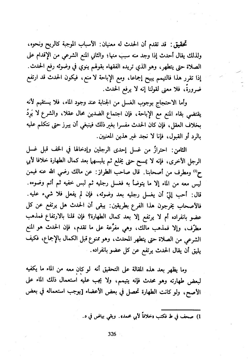 تَحْقِيقٌ قَدْ تَقَدَّمَ أَنَّ الْحَدَثَ لَهُ مَعْنَيَانِ الْأَسْبَابُ الْمُوجِبَةُ كَالرِّيحِ وَنَحْوِهِ وَلِذَلِكَ يُقَالُ أَحْدَثَ إِذَا وُجِدَ مِنْهُ سَبَبٌ مِنْهَا وَالثَّانِي الْمَنْعُ الشَّرْعِيُّ مِنَ الْإِقْدَامِ عَلَى الصَّلَاةِ حَتَّى يَتَطَهَّرَ وَهُوَ الَّذِي تُرِيدُهُ الْفُقَهَاءُ بِقَوْلِهِمْ يَنْوِي فِي وُضُوئِهِ رَفْعَ الْحَدَثِ إِذَا تَقَرَّرَ هَذَا فَالتَّيَمُّمُ يُبِيحُ إِجْمَاعًا وَمَعَ الْإِبَاحَةِ لَا مَنْعَ فَيَكُونُ الْحَدث قد ارْتَفع ضَرُورَة قلا مَعْنَى لِقَوْلِنَا إِنَّهُ لَا يَرْفَعُ الْحَدَثَ وَأَمَّا الِاحْتِجَاجُ بِوُجُوبِ الْغُسْلِ مِنَ الْجَنَابَةِ عِنْدَ وُجُودِ الْمَاءِ فَلَا يَسْتَقِيمُ لِأَنَّهُ يَقْتَضِي بَقَاءَ الْمَنْعِ مَعَ الْإِبَاحَةِ فَإِنَّ اجْتِمَاعَ الضِّدَّيْنِ مُحَالٌ عَقْلًا وَالشَّرْعُ لَا يَرِدُ بِخِلَافِ الْعَقْلِ فَإِنْ كَانَ الْحَدَثُ مُفَسَّرًا بِغَيْرِ ذَلِكَ فَيَنْبَغِي أَنْ يُبْرَزَ حَتَّى نَتَكَلَّمَ عَلَيْهِ بِالرَّدِّ أَوِ الْقَبُولِ فَإِنَّا لَا نَجِدُ غَيْرَ هَذَيْنِ الْمَعْنَيَيْنِ الثَّامِنُ احْتِرَازٌ مِنْ غَسْلِ إِحْدَى الرِّجْلَيْنِ وَإِدْخَالِهَا فِي الْخُفِّ قَبْلَ غَسْلِ الرِّجْلِ الْأُخْرَى فَإِنَّهُ لَا يَمْسَحُ حَتَّى يَخْلَعَ ثُمَّ يَلْبَسُهُمَا بَعْدَ كَمَالِ الطَّهَارَةِ خلافًا لأبي ح وَمُطَرِّفٍ مِنْ أَصْحَابِنَا قَالَ صَاحِبُ الطَّرَّازِ عَنْ مَالِكٍ رَضِيَ اللَّهُ عَنْهُ فِيمَنْ لَيْسَ مَعَهُ مِنَ الْمَاءِ إِلَّا مَا يَتَوَضَّأُ بِهِ فَغَسَلَ رِجْلَيْهِ ثُمَّ لَبِسَ خُفَّيْهِ ثُمَّ أَتَمَّ وُضُوءَهُ قَالَ أَحَبُّ إِلَيَّ أَنْ يَغْسِلَ رِجْلَيْهِ بَعْدَ وُضُوئِهِ فَإِنْ لَمْ يَفْعَلْ فَلَا شَيْءَ عَلَيْهِ فالأصحاب يخرجُون هَذَا الْفَرْع بطريقين يبْقى أَنَّ الْحَدَثَ هَلْ يَرْتَفِعُ عَنْ كُلِّ عُضْوٍ بِانْفِرَادِهِ أم لَا يرْتَفع إِلَّا بعد كَمَا الطَّهَارَةِ؟ فَإِنْ قُلْنَا بِالِارْتِفَاعِ فَمَذْهَبُ مُطَرِّفٍ وَإِلَّا فَمَذْهَبُ مَالِكٍ وَهِيَ مُفَرَّعَةٌ عَلَى مَا تَقَدَّمَ فَإِنَّ الْحَدَثَ هُوَ الْمَنْعُ الشَّرْعِيُّ مِنَ الصَّلَاةِ حَتَّى يَتَطَهَّرَ الْمُحْدِثُ وَهُوَ مَمْنُوعٌ قَبْلَ الْكَمَالِ بِالْإِجْمَاعِ فَكَيْفَ يَلِيقُ أَنْ يُقَالَ الْحَدَثُ يَرْتَفِعُ عَنْ كُلِّ عُضْوٍ بِانْفِرَادِهِ وَمَا يَظْهَرُ بَعْدَ هَذِهِ الْمَقَالَةِ عَلَى التَّحْقِيقِ أَنَّهُ لَوْ كَانَ مَعَهُ مِنَ الْمَاءِ مَا يَكْفِيهِ لِبَعْضِ طَهَارَتِهِ وَهُوَ مُحْدِثٌ فَإِنَّهُ يَتَيَمَّمُ وَلَا يَجِبُ عَلَيْهِ اسْتِعْمَالُ ذَلِكَ الْمَاءِ عَلَى الْأَصَحِّ وَلَوْ كَانَتِ الطَّهَارَةُ تَحْصُلُ فِي بَعْضِ الْأَعْضَاءِ يُوجَبُ اسْتِعْمَالُهُ فِي بعض