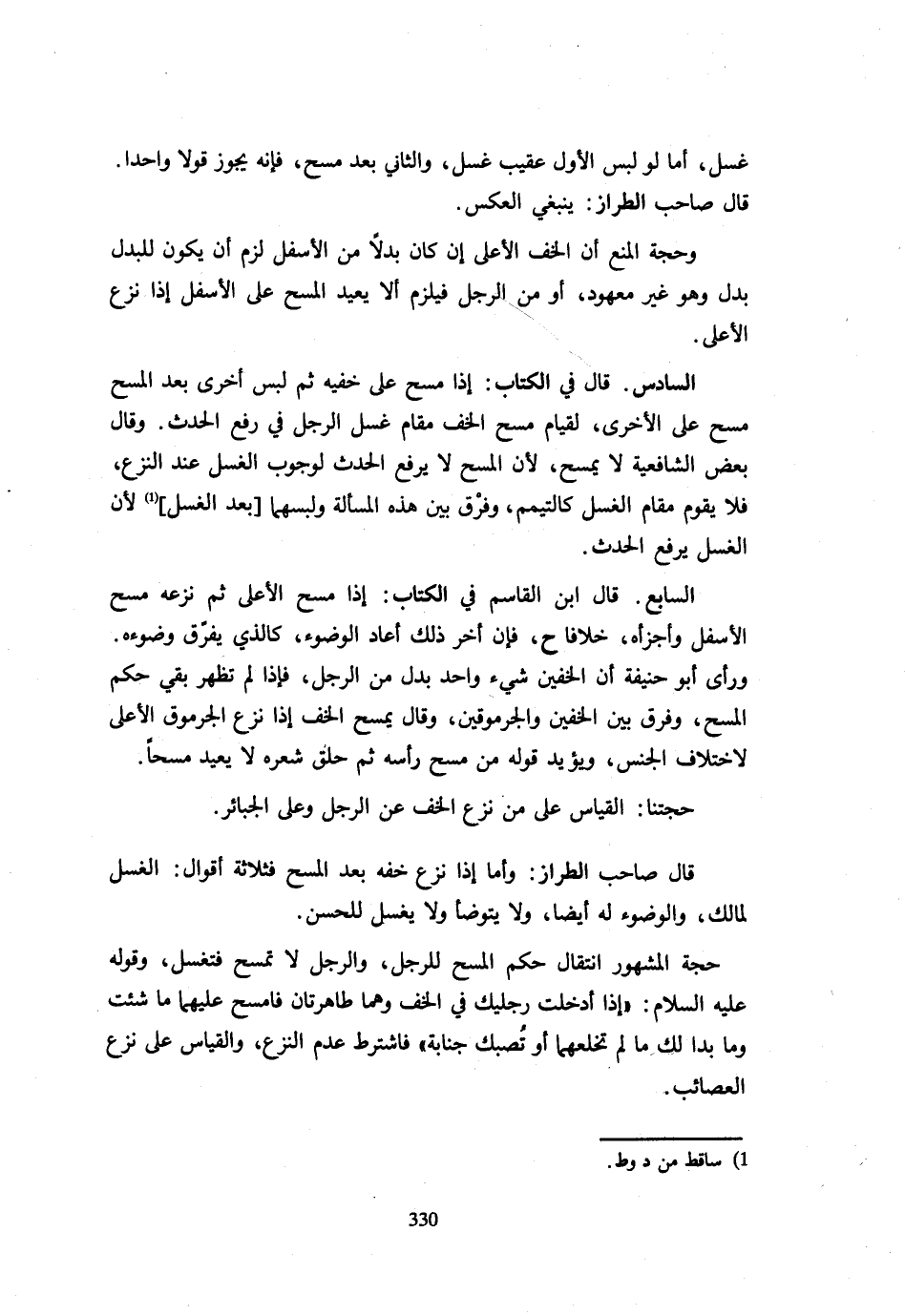 غَسْلٍ أَمَّا لَوْ لَبِسَ الْأَوَّلَ عُقَيْبَ غَسْلٍ وَالثَّانِيَ بَعْدَ مَسْحٍ فَإِنَّهُ يَجُوزُ قَوْلًا وَاحِدًا قَالَ صَاحِبُ الطَّرَّازِ يَنْبَغِي الْعَكْسُ وَحُجَّةُ الْمَنْعِ أَنَّ الْخُفَّ الْأَعْلَى إِنْ كَانَ بَدَلًا مِنَ الْأَسْفَلِ لَزِمَ أَنْ يَكُونَ لِلْبَدَلِ بَدَلٌ وَهُوَ غَيْرُ مَعْهُودٍ أَوْ مِنَ الرَّجُلِ فَيَلْزَمُ أَلَّا يُعِيدَ الْمَسْحَ عَلَى الْأَسْفَلِ إِذَا نَزَعَ الْأَعْلَى السَّادِسُ قَالَ فِي الْكِتَابِ إِذَا مَسَحَ عَلَى خُفَّيْهِ ثُمَّ لَبِسَ أُخْرَى بَعْدَ الْمَسْحِ مَسَحَ عَلَى الْأُخْرَى لِقِيَامِ مَسْحِ الْخُفِّ مَقَامَ غَسْلِ الرِّجْلِ فِي رَفْعِ الْحَدَثِ وَقَالَ بَعْضُ الشَّافِعِيَّةِ لَا يَمْسَحُ لِأَنَّ الْمَسْحَ لَا يَرْفَعُ الْحَدَثَ لِوُجُوبِ الْغَسْلِ عِنْدَ النَّزْعِ فَلَا يَقُومُ مَقَامَ الْغَسْلِ كَالتَّيَمُّمِ وَفَرَّقَ بَيْنَ هَذِهِ الْمَسْأَلَةِ وَلُبْسِهِمَا بَعْدَ الْغَسْلِ لِأَنَّ الْغَسْلَ يَرْفَعُ الْحَدَثَ السَّابِعُ قَالَ ابْنُ الْقَاسِمِ فِي الْكِتَابِ إِذَا مَسَحَ الْأَعْلَى ثُمَّ نَزَعَهُ مَسَحَ الْأَسْفَلَ وَأَجْزَأَهُ خِلَافًا ح فَإِنْ أَخَّرَ ذَلِكَ أَعَادَ الْوُضُوءَ كَالَّذِي يفرق وضوءه وَرَأى أَبُو حنيفَة أَنَّ الْخُفَّيْنِ شَيْءٌ وَاحِدٌ بَدَلٌ مِنَ الرِّجْلِ فَإِذَا لَمْ تَظْهَرْ بَقِيَ حُكْمُ الْمَسْحِ وَفَرَّقَ بَيْنَ الْخُفَّيْنِ وَالْجُرْمُوقَيْنِ وَقَالَ يَمْسَحُ الْخُفَّ إِذَا نَزَعَ الْجُرْمُوقَ الْأَعْلَى لِاخْتِلَافِ الْجِنْسِ وَيُؤَيِّدُ قَوْلَهُ مَنْ مَسَحَ رَأْسَهُ ثُمَّ حَلَقَ شَعْرَهُ لَا يُعِيدُ مَسْحًا حُجَّتُنَا الْقِيَاسُ عَلَى مَنْ نَزَعَ الْخُفَّ عَنِ الرِّجْلِ وَعَلَى الْجَبَائِرِ قَالَ صَاحِبُ الطَّرَّازِ وَأَمَّا نَزْعُ خُفِّهِ بَعْدَ الْمَسْحِ فَثَلَاثَةُ أَقْوَالٍ الْغَسْلُ لِمَالِكٍ وَالْوُضُوءُ لَهُ أَيْضًا وَلَا يَتَوَضَّأُ وَلَا يَغْسِلُ لِلْحُسْنِ حُجَّةُ الْمَشْهُورِ انْتِقَالُ حُكْمِ الْمَسْحِ لِلرِّجْلِ وَالرِّجْلُ لَا تُمْسَحُ فَتُغْسَلُ وَقَوْلُهُ عَلَيْهِ السَّلَامُ