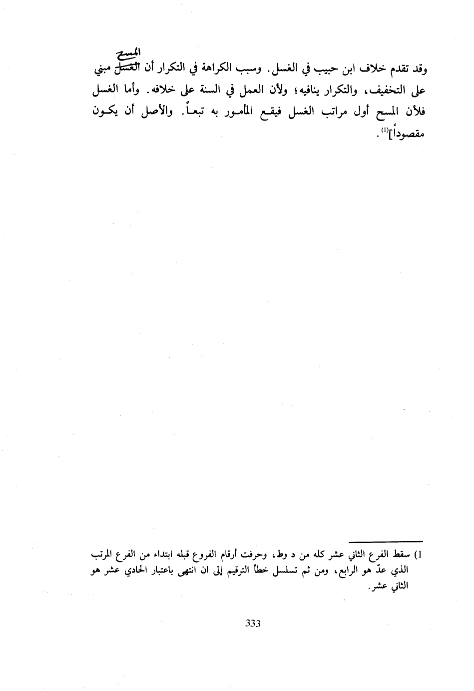 وَقَدْ تَقَدَّمَ خِلَافُ ابْنِ حَبِيبٍ فِي الْغَسْلِ وَسَبَبُ الْكَرَاهَةِ فِي التَّكْرَارِ أَنَّ الْغَسْلَ مَبْنِيٌّ عَلَى التَّخْفِيفِ وَالتَّكْرَارُ يُنَافِيهِ وَلِأَنَّ الْعَمَلَ فِي السُّنَّةِ عَلَى خِلَافِهِ وَأَمَّا الْغَسْلُ فَلِأَنَّ الْمَسْحَ أَوَّلُ مَرَاتِبِ الْغَسْلِ فَيَقَعُ الْمَأْمُورُ بِهِ تَبَعًا وَالْأَصْلُ أَنْ يَكُونَ مَقْصُودًا