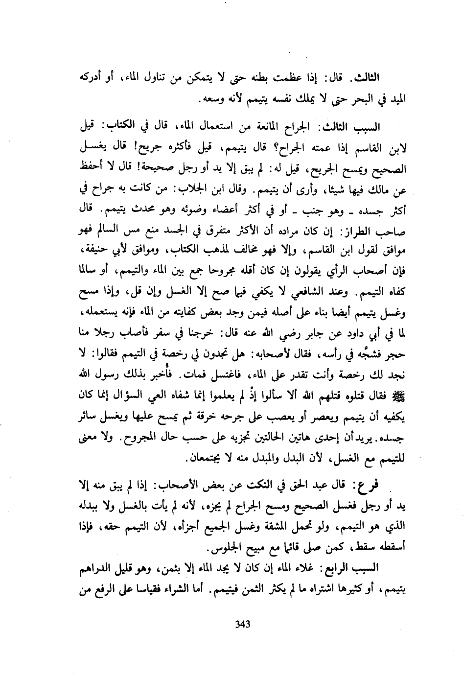 الثَّالِثُ قَالَ إِذَا عَظُمَتْ بَطْنُهُ حَتَّى لَا يَتَمَكَّنَ مِنْ تَنَاوُلِ الْمَاءِ أَوْ أَدْرَكَهُ الْمَيْدُ فِي الْبَحْرِ حَتَّى لَا يَمْلِكَ نَفْسَهُ يَتَيَمَّمُ لِأَنَّهُ وُسْعُهُ السَّبَبُ الثَّالِثُ الْجِرَاحُ الْمَانِعَةُ مِنَ اسْتِعْمَالِ الْمَاءِ قَالَ فِي الْكِتَابِ قِيلَ لِابْنِ الْقَاسِمِ إِذَا عَمَّتْهُ الْجِرَاحُ؟ قَالَ يَتَيَمَّمُ قِيلَ فَأَكْثَرُهُ جَرِيحٌ! قَالَ يَغْسِلُ الصَّحِيحَ وَيَمْسَحُ الْجَرِيحَ قِيلَ لَهُ لَمْ يَبْقَ إِلَّا يَدٌ أَوْ رِجْلٌ صَحِيحَةٌ قَالَ لَا أَحْفَظُ عَنْ مَالِكٍ فِيهَا شَيْئًا وَأَرَى أَنْ يَتَيَمَّمَ وَقَالَ ابْنُ الْجَلَّابِ مَنْ كَانَتْ بِهِ جِرَاحٌ فِي أَكْثَرِ جَسَدِهِ وَهُوَ جُنُبٌ أَوْ فِي أَكْثَرِ أَعْضَاءِ وُضُوئِهِ وَهُوَ مُحْدِثٌ يَتَيَمَّمُ قَالَ صَاحِبُ الطَّرَّازِ إِن كَانَ مُرَاده أَن الْأَكْثَر متفرق فِي الْجَسَدِ مَنَعَ مَسَّ السَّالِمِ فَهُوَ مُوَافِقٌ لِقَوْلِ ابْنِ الْقَاسِمِ وَإِلَّا فَهُوَ مُخَالِفٌ لِمَذْهَبِ الْكتاب وموافق لأبي حنيفَة فَإِنَّ أَصْحَابَ الرَّأْيِ يَقُولُونَ إِنْ كَانَ أَقَلُّهُ مَجْرُوحًا جَمَعَ بَيْنَ الْمَاءِ وَالتَّيَمُّمِ أَوْ سَالِمًا كَفاهُ التَّيَمُّم وَعند الشَّافِعِي لَا يَكْفِي فِيمَا صَحَّ إِلَّا الْغُسْلُ وَإِنْ قَلَّ وَإِذَا مَسَحَ وَغَسَلَ يَتَيَمَّمُ أَيْضًا بِنَاءً عَلَى أَصْلِهِ فِيمَنْ وَجَدَ بَعْضَ كِفَايَتِهِ مِنَ الْمَاءِ فَإِنَّهُ يَسْتَعْمِلُهُ لِمَا فِي أَبِي دَاوُدَ عَنْ جَابِرٍ رَضِيَ اللَّهُ عَنْهُ قَالَ خَرَجْنَا فِي سَفَرٍ فَأَصَابَ رَجُلًا مِنَّا حَجَرٌ فَشَجَّهُ فِي رَأْسِهِ فَقَالَ لِأَصْحَابِهِ هَلْ تَجِدُونَ لِي رُخْصَةً فِي التَّيَمُّمِ فَقَالُوا لَا نَجِدُ لَكَ رُخْصَةً وَأَنْتَ تَقْدِرُ عَلَى الْمَاءِ فَاغْتَسَلَ فَمَاتَ فَأُخْبِرَ بِذَلِكَ رَسُولُ اللَّهِ - صَلَّى اللَّهُ عَلَيْهِ وَسَلَّم َ - فَقَالَ قَتَلُوهُ قَتَلَهُمُ اللَّهُ أَلَا سَأَلُوا إِذْ لم يعلمُوا إِنَّمَا شفَاه الْعِيِّ السُّؤَالُ إِنَّمَا كَانَ يَكْفِيهِ أَنْ يَتَيَمَّمَ ويعصر أَوْ يَعْصِبَ عَلَى جُرْحِهِ خِرْقَةً ثُمَّ يَمْسَحَ عَلَيْهَا وَيَغْسِلَ سَائِرَ جَسَدِهِ يُرِيدُ أَنَّ إِحْدَى هَاتَيْنِ الْحَالَتَيْنِ تُجْزِئُهُ عَلَى حَسَبِ حَالِ الْمَجْرُوحِ وَلَا مَعْنَى لِلتَّيَمُّمِ مَعَ الْغَسْلِ لِأَنَّ الْبَدَلَ وَالْمُبْدَلَ مِنْهُ لَا يَجْتَمِعَانِ فَرْعٌ قَالَ عَبْدُ الْحَقِّ فِي النُّكَتِ عَنْ بَعْضِ الْأَصْحَابِ إِذَا لَمْ يَبْقَ مِنْهُ إِلَّا يَدٌ أَوْ رِجْلٌ فَغَسَلَ الصَّحِيحَ وَمَسَحَ الْجِرَاحَ لَمْ يُجْزِهِ لِأَنَّهُ لم يَأْتِ بِالْغسْلِ وَلَا يُبدلهُ الَّذِي هُوَ التَّيَمُّمُ وَلَوْ تَحَمَّلَ الْمَشَقَّةَ وَغَسَلَ الْجَمِيعَ أَجْزَأَهُ لِأَنَّ التَّيَمُّمَ حَقُّهُ فَإِذَا أَسْقَطَهُ سقط كمن صلى قَائِما مَعَ الْمُبِيح الْجُلُوسِ السَّبَبُ الرَّابِعُ غَلَاءُ الْمَاءِ إِنْ كَانَ لَا يَجِدُ الْمَاءَ إِلَّا بِثَمَنٍ وَهُوَ قَلِيلُ الدَّرَاهِمِ يَتَيَمَّمُ أَوْ كَثِيرُهَا اشْتَرَاهُ مَا لَمْ يَكْثُرِ الثَّمَنُ فَيَتَيَمَّمُ أَمَّا الشِّرَاءُ فَقِيَاسًا عَلَى الرّفْع من