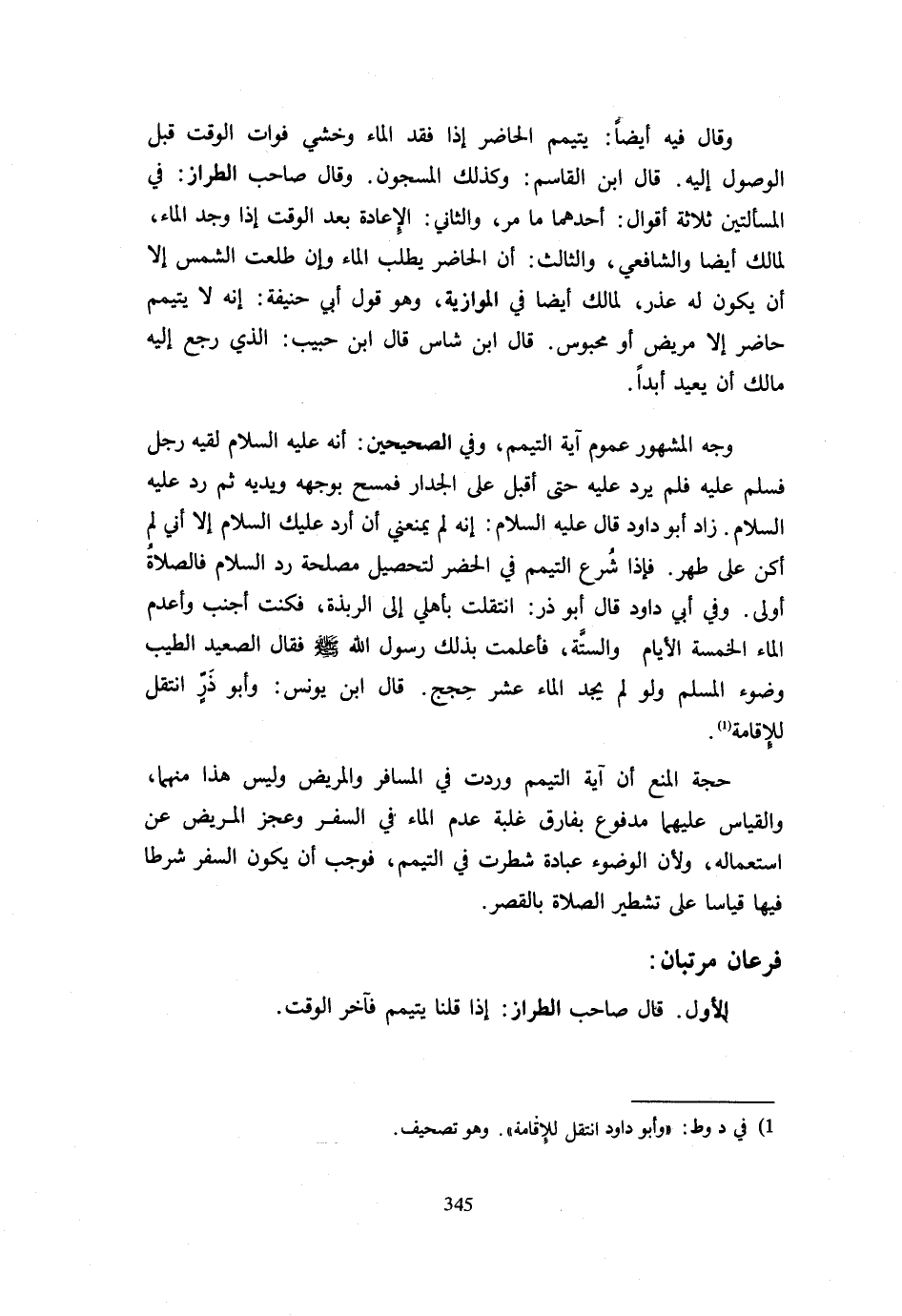 وَقَالَ فِيهِ أَيْضًا يَتَيَمَّمُ الْحَاضِرُ إِذَا فَقَدَ الْمَاءَ وَخَشِيَ فَوَاتَ الْوَقْتِ قَبْلَ الْوُصُولِ إِلَيْهِ قَالَ ابْنُ الْقَاسِمِ وَكَذَلِكَ الْمَسْجُونُ وَقَالَ صَاحِبُ الطَّرَّازِ فِي الْمَسْأَلَتَيْنِ ثَلَاثَةُ أَقْوَالٍ أَحَدُهُمَا مَا مَرَّ وَالثَّانِي الْإِعَادَةُ بَعْدَ الْوَقْتِ إِذَا وَجَدَ المَاء لمَالِك أَيْضا الشَّافِعِي وَالثَّالِثُ أَنَّ الْحَاضِرَ يَطْلُبُ الْمَاءَ وَإِنْ طَلَعَتِ الشَّمْس إِلَّا أَن يكون لَهُ عذر لمَالِك أَيْضا فِي الْمُوازِية وَهُوَ قَول أبي حنيفَة إِنَّهُ لَا يَتَيَمَّمُ حَاضِرٌ إِلَّا مَرِيضٌ أَوْ مَحْبُوسٌ قَالَ ابْنُ شَاسٍ قَالَ ابْنُ حَبِيبٍ الَّذِي رَجَعَ إِلَيْهِ مَالك أَن يعبد أَبَدًا وَجْهُ الْمَشْهُورِ عُمُومُ آيَةِ التَّيَمُّمِ وَفِي الصَّحِيحَيْنِ أَنَّهُ عَلَيْهِ السَّلَامُ لَقِيَهُ رَجُلٌ فَسَلَّمَ عَلَيْهِ فَلَمْ يَرُدَّ عَلَيْهِ حَتَّى أَقْبَلَ عَلَى الْجِدَارِ فَمَسَحَ بِوَجْهِهِ وَيَدِهِ ثُمَّ رَدَّ عَلَيْهِ السَّلَامُ زَادَ أَبُو دَاوُدَ قَالَ عَلَيْهِ السَّلَامُ إِنَّهُ لَمْ يَمْنَعْنِي أَنْ أَرُدَّ عَلَيْكَ السَّلَامَ إِلَّا أَنِّي لَمْ أَكُنْ عَلَى طُهْرٍ فَإِذَا شُرِعَ التَّيَمُّمُ فِي الْحَضَرِ لِتَحْصِيلِ مَصْلَحَةِ رَدِّ السَّلَامِ فَالصَّلَاةُ أَوْلَى وَفِي أَبِي دَاوُدَ قَالَ أَبُو ذَرٍّ انْتَقَلْتُ بِأَهْلِي إِلَى الرَّبَذَةِ فَكُنْتُ أُجْنِبُ وَأُعْدَمُ الْمَاءَ الْخَمْسَةَ الْأَيَّامِ وَالسِّتَّةَ فَأَعْلَمْتُ بذلك رَسُول الله - صَلَّى اللَّهُ عَلَيْهِ وَسَلَّم َ - فَقَالَ الصَّعِيدُ الطَّيِّبُ وُضُوءُ الْمُسْلِمِ وَلَوْ لَمْ يَجِدِ الْمَاءَ عَشْرَ حِجَجٍ قَالَ ابْنُ يُونُسَ وَأَبُو ذَرٍّ انْتَقَلَ لِلْإِقَامَةِ حُجَّةُ الْمَنْعِ أَنَّ آيَةَ التَّيَمُّمِ وَرَدَتْ فِي الْمُسَافِرِ وَالْمَرِيضِ وَلَيْسَ هَذَا مِنْهُمَا وَالْقِيَاسُ عَلَيْهِمَا مَدْفُوعٌ بِفَارِقِ غَلَبَةِ عَدَمِ الْمَاءِ فِي السَّفَرِ وَعَجْزِ الْمَرِيضِ عَنِ اسْتِعْمَالِهِ وَلِأَنَّ الْوُضُوءَ عِبَادَةٌ شُطِرَتْ فِي التَّيَمُّمِ فَوَجَبَ أَنْ يَكُونَ السَّفَرُ شَرْطًا فِيهَا قِيَاسًا عَلَى تَشْطِيرِ الصَّلَاةِ بِالْقَصْرِ فَرْعَانِ مُرَتَّبَانِ الْأَوَّلُ قَالَ صَاحِبُ الطَّرَّازِ إِذَا قُلْنَا يَتَيَمَّمُ فَآخِرَ الْوَقْت