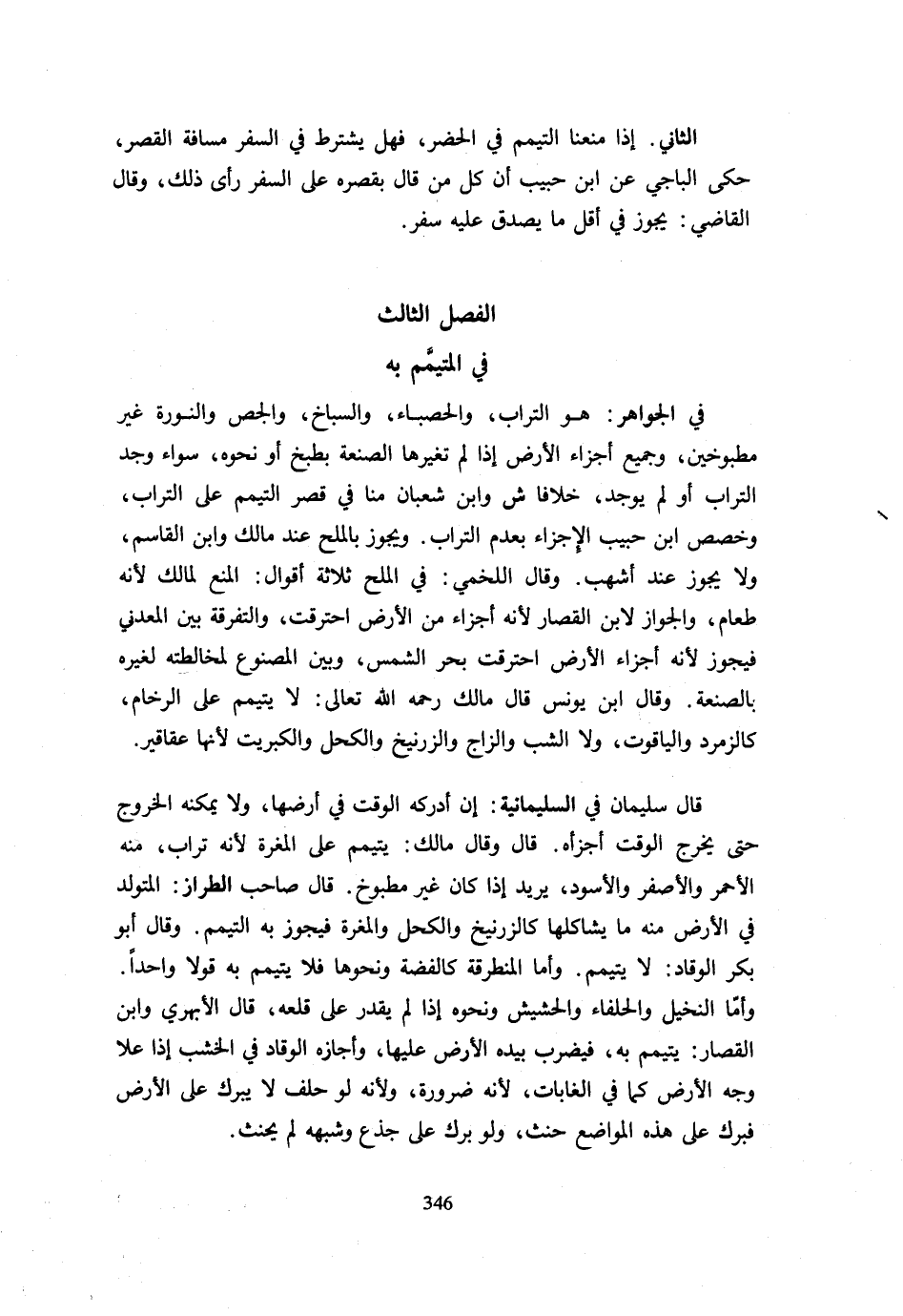 الثَّانِي إِذَا مَنَعْنَا التَّيَمُّمَ فِي الْحَضَرِ فَهَلْ يُشْتَرَطُ فِي السَّفَرِ مَسَافَةُ الْقَصْرِ حَكَى الْبَاجِيُّ عَنِ ابْنِ حَبِيبٍ أَنَّ كُلَّ مَنْ قَالَ بِقَصْرِهِ عَلَى السَّفَرِ رَأَى ذَلِكَ وَقَالَ الْقَاضِي يَجُوزُ فِي أَقَلِّ مَا يَصْدُقُ عَلَيْهِ سَفَرٌ