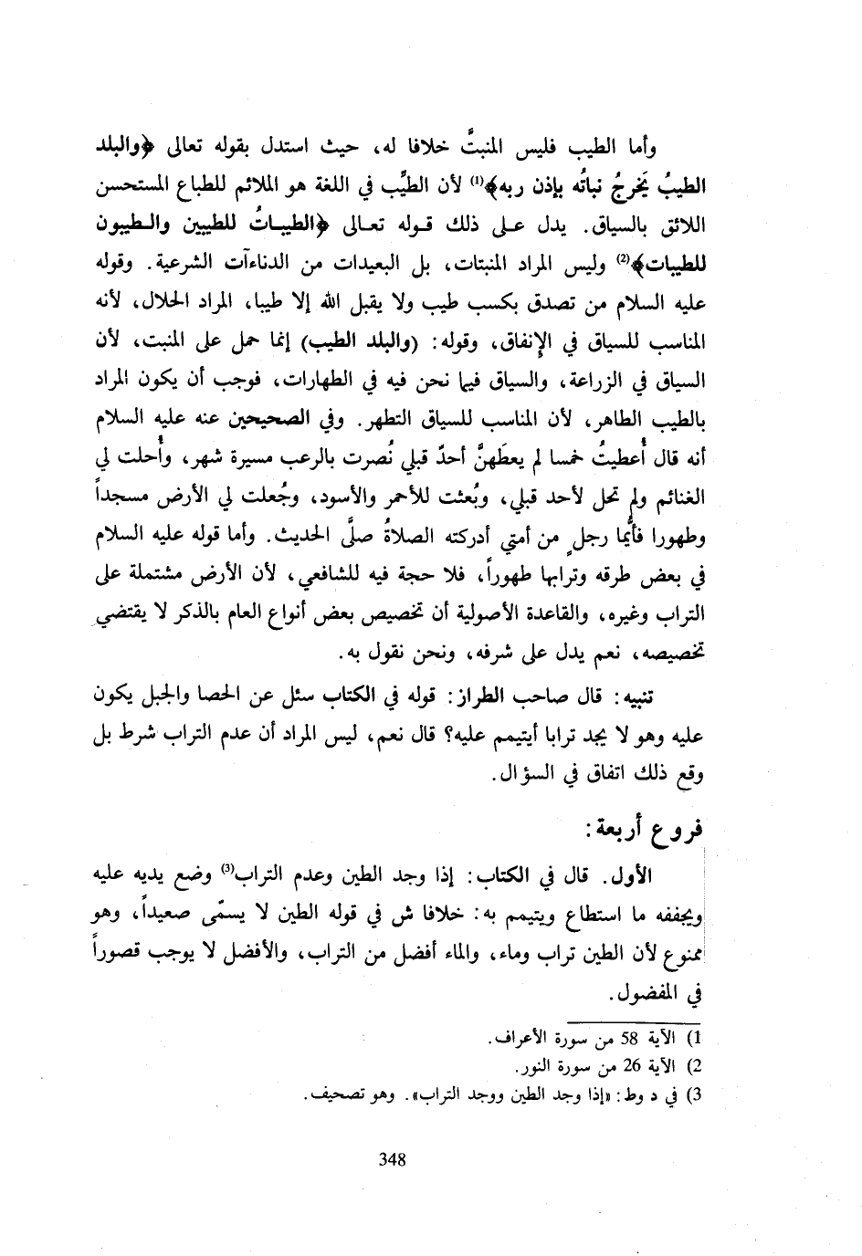 وَأَمَّا الطَّيِّبُ فَلَيْسَ الْمُنْبَتَّ خِلَافًا لَهُ حَيْثُ اسْتُدِلَّ بِقَوْلِهِ تَعَالَى {وَالْبَلَدُ الطَّيِّبُ يَخْرُجُ نَبَاتُهُ بِإِذن ربه} لِأَنَّ الطَّيِّبَ فِي اللُّغَةِ هُوَ الْمُلَائِمُ لِلطِّبَاعِ المستحسن اللَّائِقُ بِالسِّيَاقِ يَدُلُّ عَلَى ذَلِكَ قَوْله تَعَالَى {الطَّيِّبَات للطيبين والطيبون للطيبات} وَلَيْسَ الْمُرَادُ الْمُنْبَتَّاتِ بَلِ الْبَعِيدَاتِ مِنَ الدَّنَاءَاتِ الشَّرْعِيَّةِ وَقَوْلُهُ عَلَيْهِ السَّلَامُ مَنْ تَصَدَّقَ بِكَسْبٍ طَيِّبٍ وَلَا يَقْبَلُ اللَّهُ إِلَّا طَيِّبًا الْمُرَادُ الْحَلَالُ لِأَنَّهُ الْمُنَاسِبُ لِلسِّيَاقِ فِي الْإِنْفَاقِ وَقَوْلُهُ والبلد الطّيب إِنَّمَا حُمِلَ عَلَى الْمُنْبِتِ لِأَنَّ السِّيَاقَ فِي الزِّرَاعَةِ وَالسِّيَاقُ فِيمَا نَحْنُ فِيهِ فِي الطَّهَارَاتِ فَوَجَبَ أَنْ يَكُونَ الْمُرَادُ بِالطَّيِّبِ الطَّاهِرَ لِأَنَّ الْمُنَاسِبَ لِلسِّيَاقِ التَّطَهُّرُ وَفِي الصَّحِيحَيْنِ عَنْهُ عَلَيْهِ السَّلَامُ أَنَّهُ قَالَ أُعْطِيتُ خَمْسًا لَمْ يُعْطَهُنَّ أحد قبلي نصرت بِالرُّعْبِ مسيرَة شهروأحلت لِيَ الْغَنَائِمُ وَلَمْ تَحِلَّ لِأَحَدٍ قَبْلِي وَبُعِثْتُ لِلْأَحْمَرِ وَالْأَسْوَدِ وَجُعِلَتْ لِيَ الْأَرْضُ مَسْجِدًا وَطَهُورًا فَأَيُّمَا رَجُلٍ مِنْ أُمَّتِي أَدْرَكَتْهُ الصَّلَاةُ صَلَّى الْحَدِيثَ وَأَمَّا قَوْلُهُ عَلَيْهِ السَّلَامُ فِي بَعْضِ طُرُقِهِ وَتُرَابُهَا طَهُورًا فَلَا حُجَّةَ فِيهِ لِلشَّافِعِيِّ لِأَنَّ الْأَرْضَ مُشْتَمِلَةٌ عَلَى التُّرَابِ وَغَيْرِهِ وَالْقَاعِدَةُ الْأُصُولِيَّةُ أَنَّ تَخْصِيصَ بَعْضِ أَنْوَاعِ الْعَامِ بِالذِّكْرِ لَا يَقْتَضِي تَخْصِيصَهُ نَعَمْ يَدُلُّ عَلَى شَرَفِهِ وَنَحْنُ نَقُولُ بِهِ تَنْبِيهٌ قَالَ صَاحِبُ الطَّرَّازِ قَوْلُهُ فِي الْكِتَابِ سُئِلَ عَنِ الْحَصَا وَالْجَبَلُ يَكُونُ عَلَيْهِ وَهُوَ لَا يَجِدُ تُرَابًا أَيَتَيَمَّمُ عَلَيْهِ؟ قَالَ نَعَمْ لَيْسَ الْمُرَادُ أَنَّ عَدَمَ التُّرَابِ شَرْطٌ بَلْ وَقَعَ ذَلِكَ اتِّفَاقٌ فِي السُّؤَال فروع أَرْبَعَة الأول قَالَ فِي الْكِتَابِ إِذَا وَجَدَ الطِّينَ وَعَدِمَ التُّرَابَ وَضَعَ يَدَيْهِ عَلَيْهِ وَيُجَفِّفُهُ مَا اسْتَطَاعَ وَيَتَيَمَّمُ بِهِ خِلَافًا ش فِي قَوْلِهِ الطِّينُ لَا يُسَمَّى صَعِيدًا وَهُوَ مَمْنُوعٌ لِأَنَّ الطِّينَ تُرَابٌ وَمَاءٌ وَالْمَاءُ أَفْضَلُ مِنَ التُّرَابِ وَالْأَفْضَلُ لَا يُوجِبُ قُصُورًا فِي الْمَفْضُولِ