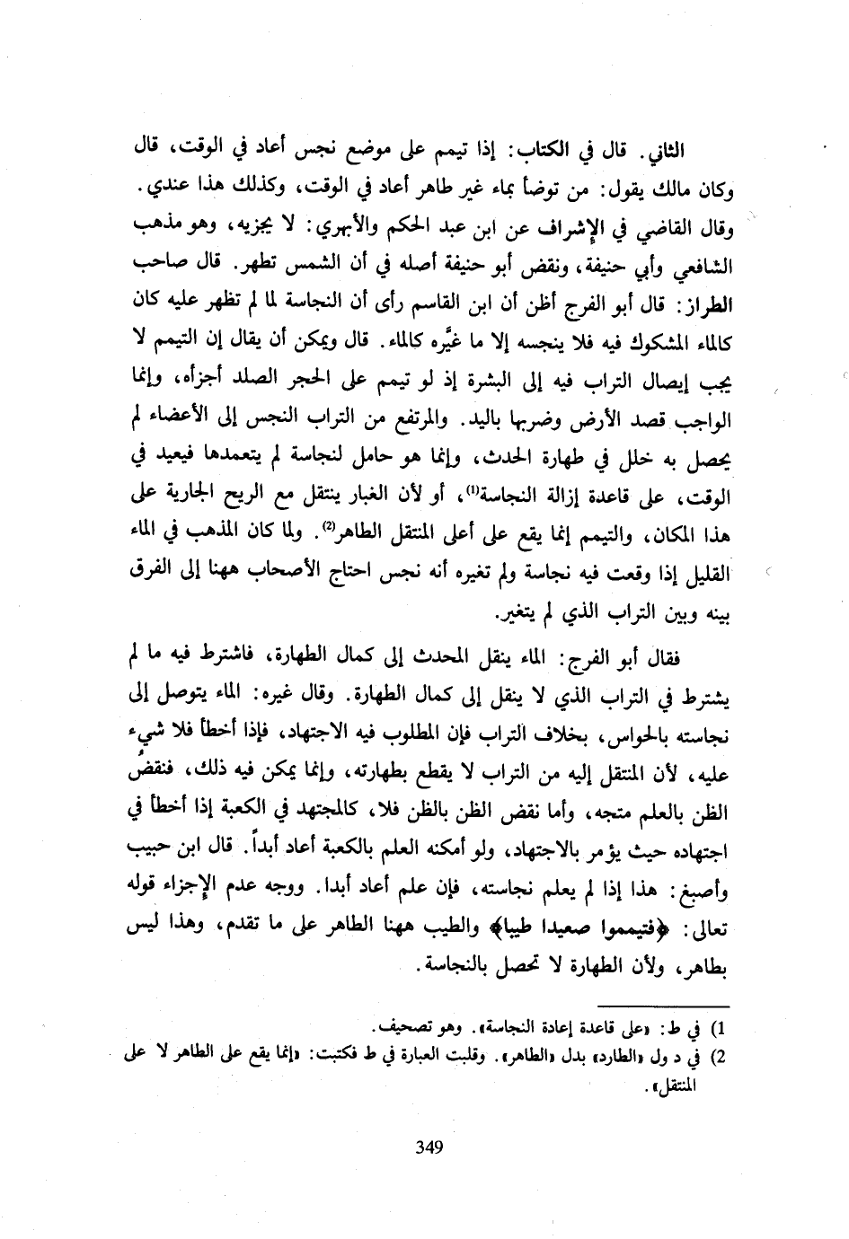 الثَّانِي قَالَ فِي الْكِتَابِ إِذَا تَيَمَّمَ عَلَى مَوْضِعٍ نَجِسٍ أَعَادَ فِي الْوَقْتِ قَالَ وَكَانَ مَالِكٌ يَقُولُ مَنْ تَوَضَّأَ بِمَاءٍ غَيْرِ طَاهِرٍ أَعَادَ فِي الْوَقْتِ وَكَذَلِكَ هَذَا عِنْدِي وَقَالَ الْقَاضِي فِي الْإِشْرَافِ عَنِ ابْنِ عَبْدِ الْحَكَمِ والأبهري لَا يجْزِيه وَهُوَ مَذْهَب الشَّافِعِي وَأبي حنيفَة وَنقض أَبُو حنيفَة أَصْلَهُ فِي أَنَّ الشَّمْسَ تُطَهِّرُ قَالَ صَاحِبُ الطَّرَّازِ قَالَ أَبُو الْفَرَجِ أَظُنُّ أَنَّ ابْنَ الْقَاسِمِ رَأَى أَنَّ النَّجَاسَةَ لَمَّا لَمْ تَظْهَرْ عَلَيْهِ كَانَ كَالْمَاءِ الْمَشْكُوكِ فِيهِ فَلَا يُنَجِّسُهُ إِلَّا مَا غَيَّرَهُ كَالْمَاءِ قَالَ وَيُمْكِنُ أَنْ يُقَالَ إِنَّ التَّيَمُّمَ لَا يَجِبُ إِيصَالُ التُّرَابِ فِيهِ إِلَى الْبَشَرَةِ إِذْ لَوْ تَيَمَّمَ عَلَى الْحَجَرِ الصَّلْدِ أَجْزَأَهُ وَإِنَّمَا الْوَاجِبُ قَصْدُ الْأَرْضِ وَضَرْبُهَا بِالْيَدِ وَالْمُرْتَفِعُ مِنَ التُّرَابِ النَّجِسِ إِلَى الْأَعْضَاءِ لَمْ يَحْصُلْ بِهِ خَلَلٌ فِي طَهَارَةِ الْحَدَثِ وَإِنَّمَا هُوَ حَامِلٌ لِنَجَاسَةٍ لَمْ يَتَعَمَّدْهَا فَيُعِيدُ فِي الْوَقْتِ عَلَى قَاعِدَةِ إِزَالَةِ النَّجَاسَةِ أَوْ لِأَنَّ الْغُبَارَ يَنْتَقِلُ مَعَ الرِّيحِ الْجَارِيَةِ عَلَى هَذَا الْمَكَانِ وَالتَّيَمُّمُ إِنَّمَا يَقَعُ عَلَى أَعْلَى الْمُنْتَقِلِ الطَّاهِرِ وَلَمَّا كَانَ الْمَذْهَبُ فِي الْمَاءِ الْقَلِيلِ إِذَا وَقَعَتْ فِيهِ نَجَاسَةٌ وَلَمْ تغيره أَنه نجس احْتَاجَ الْأَصْحَاب هَهُنَا إِلَى الْفَرْقِ بَيْنَهُ وَبَيْنَ التُّرَابِ الَّذِي لَمْ يَتَغَيَّرْ فَقَالَ أَبُو الْفَرَجِ الْمَاءُ يَنْقُلُ الْمُحْدِثَ إِلَى كَمَالِ الطَّهَارَةِ فَاشْتُرِطَ فِيهِ مَا لَمْ يُشْتَرَطْ فِي التُّرَابِ الَّذِي لَا يَنْقُلُ إِلَى كَمَالِ الطَّهَارَةِ وَقَالَ غَيْرُهُ الْمَاءُ يُتَوَصَّلُ إِلَى نَجَاسَتِهِ بِالْحَوَاسِّ بِخِلَافِ التُّرَابِ فَإِنَّ الْمَطْلُوبَ فِيهِ الِاجْتِهَادُ فَإِذَا أَخْطَأَ فَلَا شَيْءَ عَلَيْهِ لِأَنَّ الْمُنْتَقِلَ إِلَيْهِ مِنَ التُّرَابِ لَا يَقْطَعُ بِطَهَارَتِهِ وَإِنَّمَا يُمْكِنُ فِيهِ ذَلِكَ فَنَقْضُ الظَّنِّ بِالْعِلْمِ مُتَّجِهٌ وَأَمَّا نَقْضُ الظَّنِّ بِالظَّنِّ فَلَا كَالْمُجْتَهِدِ فِي الْكَعْبَةِ إِذَا أَخْطَأَ فِي اجْتِهَادِهِ حَيْثُ يُؤْمَرُ بِالِاجْتِهَادِ وَلَوْ أَمْكَنَهُ الْعِلْمُ بِالْكَعْبَةِ أَعَادَ أَبَدًا قَالَ ابْنُ حَبِيبٍ وَأَصْبَغُ هَذَا إِذَا لَمْ يَعْلَمْ نَجَاسَتَهُ فَإِنْ عَلِمَ أَعَادَ أَبَدًا وَوَجْهُ عَدَمِ الْإِجْزَاءِ قَوْله تَعَالَى {فَتَيَمَّمُوا صَعِيدًا طيبا} وَالطّيب هَهُنَا الطَّاهِرُ عَلَى مَا تَقَدَّمَ وَهَذَا لَيْسَ بِطَاهِرٍ وَلِأَنَّ الطَّهَارَةَ لَا تَحْصُلُ بِالنَّجَاسَةِ