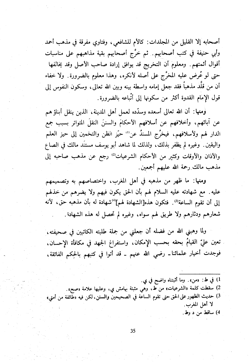 أَصْحَابُهُ إِلَّا الْقَلِيلَ مِنَ الْمُجَلَّدَاتِ كَالْأُمِّ لِلشَّافِعِيِّ وَفَتَاوَى مُفَرَّقَةٍ فِي مَذْهَبِ أَحْمَدَ وَأَبِي حَنِيفَةَ فِي كُتُبِ أَصْحَابِهِمْ ثُمَّ خَرَّجَ أَصْحَابُهُمْ بَقِيَّةَ مَذَاهِبِهِمْ عَلَى مُنَاسَبَاتِ أَقْوَالِ أَئِمَّتِهِمْ وَمَعْلُومٌ أَنَّ التَّخْرِيجَ قَدْ يُوَافِقُ إِرَادَةَ صَاحِبِ الْأَصْلِ وَقَدْ يُخَالِفُهَا حَتَّى لَوْ عُرِضَ عَلَيْهِ الْمُخَرَّجُ عَلَى أَصْلِهِ لَأَنْكَرَهُ وَهَذَا مَعْلُومٌ بِالضَّرُورَةِ وَلَا خَفَاءَ أَنَّ مَنْ قَلَّدَ مَذْهَبًا فَقَدْ جَعَلَ إِمَامَهُ وَاسِطَةً بَيْنَهُ وَبَيْنَ اللَّهِ تَعَالَى وَسُكُونُ النُّفُوسِ إِلَى قَوْلِ الْإِمَامِ الْقُدْوَةِ أَكْثَرُ مِنْ سُكُونِهَا إِلَى أَتْبَاعِهِ بِالضَّرُورَةِ وَمِنْهَا أَنَّ اللَّهَ تَعَالَى أَسْعَدَهُ وَسَدَّدَهُ لِعَمَلِ أَهْلِ الْمَدِينَةِ الَّذِينَ يَنْقُلُ أَبْنَاؤُهُمْ عَنْ آبَائِهِمْ وَأَخْلَافُهُمْ عَنْ أَسْلَافِهِمُ الْأَحْكَامَ وَالسُّنَنَ النَّقْلَ الْمُتَوَاتِرَ بِسَبَبِ جَمْعِ الدَّارِ لَهُمْ ولأسلافهم فَيخرج الْمسند عَنْ حَيِّزِ الظَّنِّ وَالتَّخْمِينِ إِلَى حِيزِ الْعِلْمِ وَالْيَقِينِ وَغَيْرُهُ لَمْ يَظْفَرْ بِذَلِكَ وَلِذَلِكَ لَمَّا شَاهَدَ أَبُو يُوسُفَ مُسْتَنَدَ مَالِكٍ فِي الصَّاعِ وَالْأَذَانِ وَالْأَوْقَاتِ وَكَثِيرٍ مِنَ الْأَحْكَامِ الشَّرْعِيَّاتِ رَجَعَ عَنْ مَذْهَبِ صَاحِبِهِ إِلَى مَذْهَبِ مَالِكٍ رَحْمَةُ اللَّهِ عَلَيْهِمْ أَجْمَعِينَ وَمِنْهَا مَا ظَهَرَ مِنْ مَذْهَبِهِ فِي أَهْلِ الْمَغْرِبِ وَاخْتِصَاصِهِمْ بِهِ وَتَصْمِيمِهِمْ عَلَيْهِ مَعَ شَهَادَتِهِ عَلَيْهِ السَّلَامُ لَهُمْ بِأَنَّ الْحَقَّ يَكُونُ فِيهِمْ وَلَا يَضُرُّهُمْ مَنْ خَذَلَهُمْ إِلَى أَنْ تَقُومَ السَّاعَةُ فَتَكُونُ هَذِهِ الشَّهَادَةُ لَهُمْ شَهَادَةً لَهُ بِأَنَّ مَذْهَبَهُ حَقٌّ لِأَنَّهُ شِعَارُهُمْ وَدِثَارُهُمْ وَلَا طَرِيقَ لَهُمْ سِوَاهُ وَغَيْرُهُ لَمْ تَحْصُلْ لَهُ هَذِهِ الشَّهَادَةُ وَلَمَّا وَهَبَنِي اللَّهُ مِنْ فَضْلِهِ أَنْ جَعَلَنِي مِنْ جُمْلَةِ طلبته الْكَاتِبين فِي صَحِيفَتِهِ تَعَيَّنَ عَلَيَّ الْقِيَامُ بِحَقِّهِ بِحَسَبِ الْإِمْكَانِ وَاسْتِفْرَاغِ الْجُهْدِ فِي مُكَافَأَةِ الْإِحْسَانِ فَوَجَدْتُ أَخْيَارَ عُلَمَائِنَا رَضِيَ اللَّهُ عَنْهُمْ قَدْ أَتَوْا فِي كُتُبِهِمْ بِالْحِكَمِ الْفَائِقَةِ