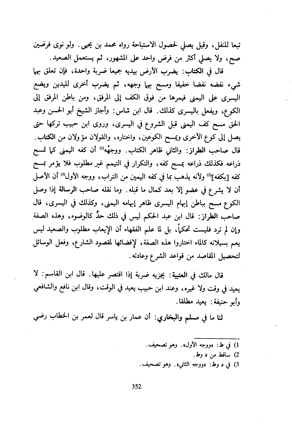 تَبَعًا لِلنَّفْلِ وَقِيلَ يُصَلِّي لِحُصُولِ الِاسْتِبَاحَةِ رَوَاهُ مُحَمَّدُ بْنُ يَحْيَى وَلَوْ نَوَى فَرْضَيْنِ صَحَّ وَلَا يُصَلِّي أَكْثَرَ مِنْ فَرْضٍ وَاحِدٍ عَلَى الْمَشْهُورِ ثُمَّ يَسْتَعْمِلُ الصَّعِيدَ قَالَ فِي الْكِتَابِ يَضْرِبُ الْأَرْضَ بِيَدَيْهِ جَمِيعًا ضَرْبَةً وَاحِدَةً فَإِنْ تَعَلَّقَ بِهِمَا شَيْءٌ نَفَضَهُ نَفْضًا خَفِيفًا وَمَسَحَ بهما وَجهه ثمَّ يضْرب أُخْرَى لِلْيَدَيْنِ وَيَضَعُ الْيُسْرَى عَلَى الْيُمْنَى فَيُمِرُّهَا مِنْ فَوْقِ الْكَفِّ إِلَى الْمِرْفَقِ وَمِنْ بَاطِنِ الْمِرْفَقِ إِلَى الْكُوعِ وَيَفْعَلُ بِالْيُسْرَى كَذَلِكَ قَالَ ابْنُ شَاسٍ وَأَجَازَ الشَّيْخُ أَبُو الْحَسَنِ وَعَبْدُ الْحَقِّ مَسْحَ كَفِّ الْيُمْنَى قَبْلَ الشُّرُوعِ فِي الْيُسْرَى وَرَوَى ابْنُ حَبِيبٍ تَرْكَهَا حَتَّى يَصِلَ كُوعَ الْأُخْرَى وَيَمْسَحَ الْكُوعَيْنِ وَاخْتَارَهُ وَالْقَوْلَانِ مُؤَوَّلَانِ مِنَ الْكِتَابِ قَالَ صَاحِبُ الطَّرَّازِ وَالثَّانِي ظَاهِرُ الْكِتَابِ وَوَجْهُهُ أَنَّ كَفَّهُ الْيُمْنَى كَمَا تَمْسَحُ ذِرَاعَهُ فَكَذَلِكَ ذِرَاعُهُ يَمْسَحُ كَفَّهُ وَالتَّكْرَارُ فِي التَّيَمُّمِ غَيْرُ مَطْلُوبٍ فَلَا يُؤْمَرُ بِمَسْحِ كَفِّهِ بكفه وَلِأَنَّهُ يَذْهَبُ بِمَا فِي كَفِّهِ الْيَمِينِ مِنَ التُّرَاب وَوجه الأول أَن الأَصْل أَن لَا يَشْرَعَ فِي عُضْوٍ إِلَّا بَعْدَ كَمَالِ مَا قَبْلَهُ وَمَا نَقَلَهُ صَاحِبُ الرِّسَالَةِ إِذَا وَصَلَ الْكُوعَ مَسَحَ بِبَاطِنِ إِبْهَامِ الْيُسْرَى ظَاهِرَ إِبْهَامِهِ الْيُمْنَى وَكَذَلِكَ فِي الْيُسْرَى قَالَ صَاحِبُ الطَّرَّازِ قَالَ ابْنُ عَبْدِ الْحَكَمِ لَيْسَ فِي ذَلِكَ حَدٌّ كَالْوُضُوءِ وَهَذِهِ الصِّفَةُ وَإِنْ لَمْ تَرِدْ فَلَيْسَتْ تَحَكُّمًا بَلْ لَمَّا عَلِمَ الْفُقَهَاءُ أَنَّ الْإِيعَابَ مَطْلُوبٌ وَالصَّعِيدُ لَيْسَ يَعُمُّ بِسَيَلَانِهِ كَالْمَاءِ اخْتَارُوا هَذِهِ الصِّفَةَ لِإِفْضَائِهَا لِمَقْصُودِ الشَّارِعِ وَفِعْلُ الْوَسَائِلِ لِتَحْصِيلِ الْمَقَاصِدِ مِنْ قَوَاعِدِ الشَّرْعِ وَعَادَتِهِ قَالَ مَالك فِي العتيبة يجْزِيه ضَرْبَة إِذَا اقْتَصَرَ عَلَيْهَا قَالَ ابْنُ الْقَاسِمِ لَا يُعِيدُ فِي وَقْتٍ وَلَا غَيْرِهِ وَعِنْدَ ابْنِ حَبِيبٍ يُعِيدُ فِي الْوَقْتِ وَقَالَ ابْنُ نَافِعٍ وَالشَّافِعِيّ وَأَبُو حنيفَة يُعِيدُ مُطْلَقًا لَنَا مَا فِي مُسْلِمٍ وَالْبُخَارِيِّ أَنَّ عَمَّارَ بْنَ يَاسِرٍ قَالَ لِعُمَرَ بْنِ الْخطاب رَضِي