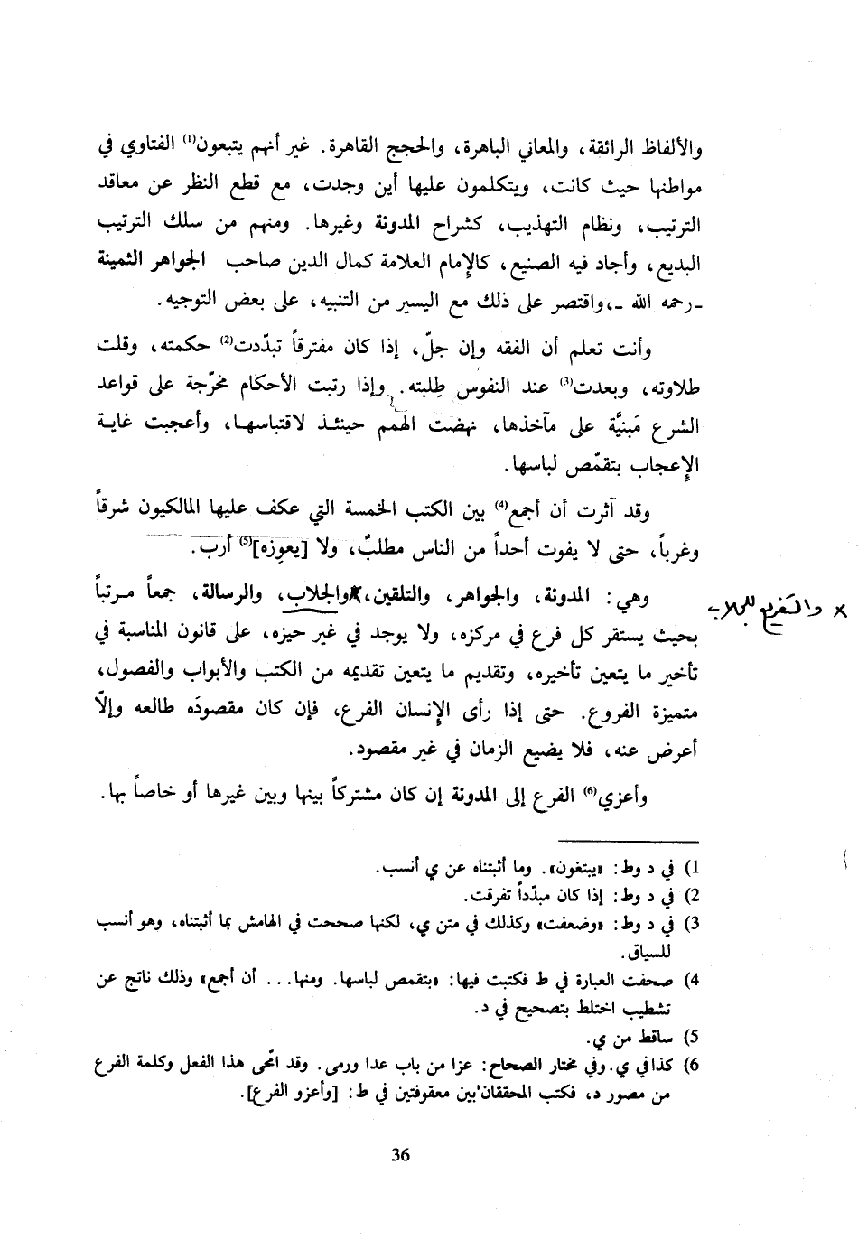 وَالْأَلْفَاظِ الرَّائِقَةِ وَالْمَعَانِي الْبَاهِرَةِ وَالْحُجَجِ الْقَاهِرَةِ غَيْرَ أَنَّهُمْ يَتَّبِعُونَ الْفَتَاوَى فِي مَوَاطِنِهَا حَيْثُ كَانَتْ وَيَتَكَلَّمُونَ عَلَيْهَا أَيْنَ وُجِدَتْ مَعَ قَطْعِ النَّظَرِ عَنْ مَعَاقِدِ التَّرْتِيبِ وَنِظَامِ التَّهْذِيبِ كَشُرَّاحِ الْمُدَوَّنَةِ وَغَيْرِهَا وَمِنْهُمْ مَنْ سَلَكَ التَّرْتِيبَ الْبَدِيعَ وَأَجَادَ فِيهِ الصَّنِيعَ كَالْإِمَامِ الْعَلَّامَةِ كَمَالِ الدِّينِ صَاحِبِ الْجَوَاهِرِ الثَّمِينَةِ رَحِمَهُ اللَّهُ وَاقْتَصَرَ عَلَى ذَلِكَ مَعَ الْيَسِيرِ مِنَ التَّنْبِيهِ عَلَى بَعْضِ التَّوْجِيهِ وَأَنْتَ تَعْلَمُ أَنَّ الْفِقْهَ وَإِنْ جَلَّ إِذَا كَانَ مفترقا تبددت حكمته وَقلت طلاوته وبعدت عِنْدَ النُّفُوسِ طِلْبَتُهُ وَإِذَا رُتِّبَتِ الْأَحْكَامُ مُخَرَّجَةً عَلَى قَوَاعِدِ الشَّرْعِ مَبْنِيَّةً عَلَى مَآخِذِهَا نَهَضَتِ الْهِمَمُ حِينَئِذٍ لِاقْتِبَاسِهَا وَأُعْجِبَتْ غَايَةَ الْإِعْجَابِ بِتَقَمُّصِ لِبَاسِهَا وَقَدْ آثَرْتُ أَنْ أَجْمَعَ بَيْنَ الْكُتُبِ الْخَمْسَةِ الَّتِي عَكَفَ عَلَيْهَا الْمَالِكِيُّونَ شَرْقًا وَغَرْبًا حَتَّى لَا يَفُوتَ أَحَدًا مِنَ النَّاسِ مَطْلَبٌ وَلَا يُعْوِزُهُ أَرَبٌ وَهِيَ الْمُدَوَّنَةُ وَالْجَوَاهِرُ وَالتَّلْقِينُ والجلاب وَالرِّسَالَةُ جَمْعًا مُرَتَّبًا بِحَيْثُ يَسْتَقِرُّ كُلُّ فَرْعٍ فِي مركزه وَلَا يُوجد فِي غَيره حَيِّزِهِ عَلَى قَانُونِ الْمُنَاسَبَةِ فِي تَأْخِيرِ مَا يَتَعَيَّنُ تَأْخِيرُهُ وَتَقْدِيمِ مَا يَتَعَيَّنُ تَقْدِيمُهُ مِنَ الْكُتُبِ وَالْأَبْوَابِ وَالْفُصُولِ مُتَمَيِّزَةَ الْفُرُوع حَتَّى إِذَا رَأَى الْإِنْسَانُ الْفَرْعَ فَإِنْ كَانَ مَقْصُودُهُ طَالَعَهُ وَإِلَّا أَعْرَضَ عَنْهُ فَلَا يُضَيِّعُ الزَّمَانَ فِي غير مَقْصُوده وَأَعْزِي الْفَرْعَ إِلَى الْمُدَوَّنَةِ إِنْ كَانَ مُشْتَرَكًا بَيْنَهَا وَبَيْنَ غَيْرِهَا أَوْ خَاصًّا بِهَا