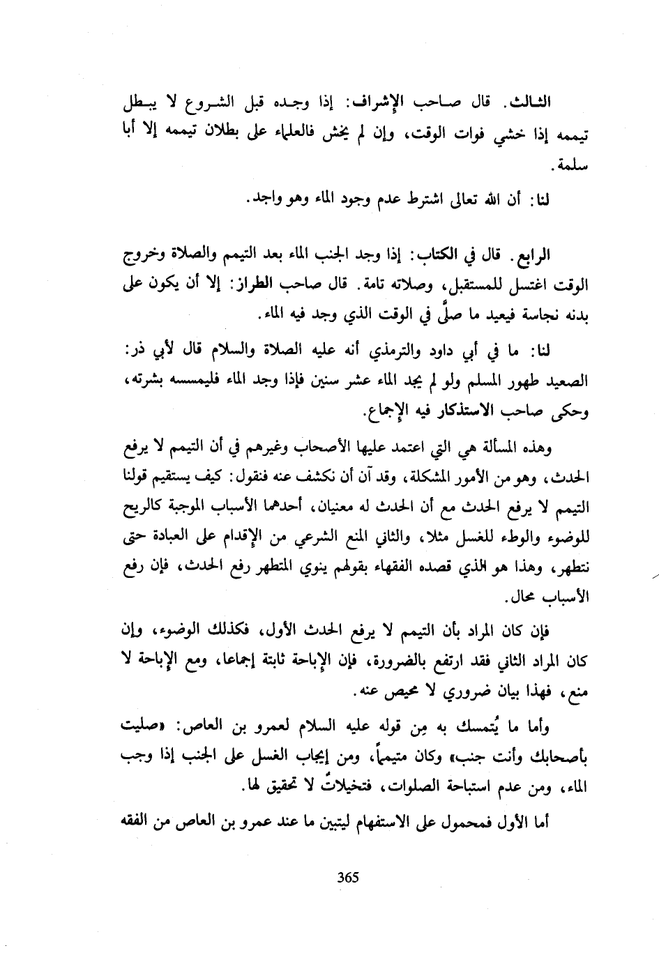 وَهَذِهِ الْمَسْأَلَةُ هِيَ الَّتِي اعْتَمَدَ عَلَيْهَا الْأَصْحَابُ وَغَيْرُهُمْ فِي أَنَّ التَّيَمُّمَ لَا يَرْفَعُ الْحَدَثَ وَهُوَ مِنَ الْأُمُورِ الْمُشْكِلَةِ وَقَدْ آنَ أَنْ نَكْشِفَ عَنْهُ فَنَقُولَ كَيْفَ يَسْتَقِيمُ قَوْلُنَا التَّيَمُّمُ لَا يَرْفَعُ الْحَدَثَ مَعَ أَنَّ الْحَدَثَ لَهُ مَعْنَيَانِ أَحَدُهُمَا الْأَسْبَابُ الْمُوجِبَةُ كَالرِّيحِ لِلْوُضُوءِ وَالْوَطْءِ لِلْغُسْلِ مَثَلًا وَالثَّانِي الْمَنْعُ الشَّرْعِيُّ مِنَ الْإِقْدَامِ عَلَى الْعِبَادَةِ حَتَّى نَتَطَهَّرَ وَهَذَا هُوَ الَّذِي قَصَدَهُ الْفُقَهَاءُ بِقَوْلِهِمْ يَنْوِي الْمُتَطَهِّرُ رَفْعَ الْحَدَثِ فَإِنَّ رَفْعَ الْأَسْبَابِ مُحَالٌ. فَإِنْ كَانَ الْمُرَادُ بِأَنَّ التَّيَمُّمَ لَا يَرْفَعُ الْحَدَثَ الْأَوَّلَ فَكَذَلِكَ الْوُضُوءُ وَإِنْ كَانَ الْمُرَادُ الثَّانِي فَقَدِ ارْتَفَعَ بِالضَّرُورَةِ فَإِنَّ الْإِبَاحَةَ ثَابِتَةٌ إِجْمَاعًا وَمَعَ الْإِبَاحَةِ لَا مَنْعَ فَهَذَا بَيَانٌ ضَرُورِيٌّ لَا مَحِيصَ عَنْهُ. وَأَمَّا مَا يُتَمَسَّكُ بِهِ مِنْ قَوْلِهِ عَلَيْهِ السَّلَامُ لِعَمْرِو بْنِ الْعَاصِ