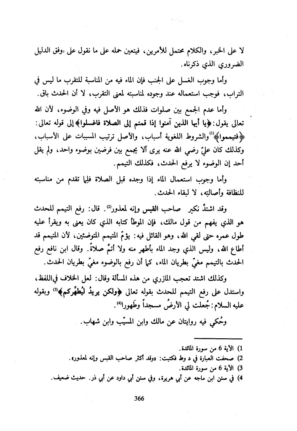 لَا عَلَى الْخَبَرِ وَالْكَلَامُ مُحْتَمِلٌ لِلْأَمْرَيْنِ فَيَتَعَيَّنُ حَمْلُهُ عَلَى مَا نَقُولُ عَلَى وَفْقِ الدَّلِيلِ الضَّرُورِيِّ الَّذِي ذَكَرْنَاهُ. وَأَمَّا وُجُوبُ الْغُسْلِ عَلَى الْجُنُبِ فَإِنَّ الْمَاءَ فِيهِ مِنَ الْمُنَاسَبَةِ لِلتَّقَرُّبِ مَا لَيْسَ فِي التُّرَابِ فَوَجَبَ اسْتِعْمَالُهُ عِنْدَ وُجُودِهِ لِمُنَاسَبَتِهِ لِمَعْنَى التَّقَرُّبِ لَا أَنَّ الْحَدَثَ بَاقٍ. وَأَمَّا عَدَمُ الْجَمْعِ بَيْنَ صَلَوَاتٍ فَذَلِكَ هُوَ الْأَصْلُ فِيهِ وَفِي الْوُضُوءِ لِأَنَّ اللَّهَ تَعَالَى يَقُولُ {يَا أَيُّهَا الَّذِينَ آمَنُوا إِذَا قُمْتُم إِلَى الصَّلَاة فَاغْسِلُوا} إِلَى قَوْله تَعَالَى {فَتَيَمَّمُوا} وَالشُّرُوطُ اللُّغَوِيَّةُ أَسْبَابٌ وَالْأَصْلُ تَرْتِيبُ الْمُسَبَّبَاتُ عَلَى الْأَسْبَابِ وَكَذَلِكَ كَانَ عَلِيٌّ رَضِيَ اللَّهُ عَنْهُ يَرَى أَلَّا يَجْمَعَ بَيْنَ فَرْضَيْنِ بِوُضُوءٍ وَاحِدٍ وَلَمْ يَقُلْ أَحَدٌ إِنَّ الْوُضُوءَ لَا يَرْفَعُ الْحَدَثَ فَكَذَلِكَ التَّيَمُّمُ. وَأَمَّا وُجُوبُ اسْتِعْمَالِ الْمَاءِ إِذَا وَجَدَهُ قَبْلَ الصَّلَاةِ فَلِمَا تَقَدَّمَ مِنْ مُنَاسَبَتِهِ لِلنَّظَافَةِ وَأَصَالَتِهِ لَا لِبَقَاءِ الْحَدَثِ. وَقَدِ اشْتَدَّ نَكِيرُ صَاحِبِ الْقَبَسِ وَإِنَّهُ لَمَعْذُورٌ قَالَ رَفْعُ التَّيَمُّمِ لِلْحَدَثِ هُوَ الَّذِي يُفْهَمُ مِنْ قَوْلِ مَالِكٍ فَإِنَّ الْمُوَطَّأَ كِتَابُهُ الَّذِي كَانَ يُعْنَى بِهِ وَيُقْرَأُ عَلَيْهِ طُولَ عُمُرِهِ حَتَّى لَقِيَ اللَّهَ وَهُوَ الْقَائِلُ فِيهِ يَؤُمُّ الْمُتَيَمِّمُ الْمُتَوَضِّئِينَ لِأَنَّ الْمُتَيَمِّمَ قَدْ أَطَاعَ اللَّهَ وَلَيْسَ الَّذِي وَجَدَ الْمَاءَ بِأَطْهَرَ مِنْهُ وَلَا أَتَمَّ صَلَاةً وَقَالَ ابْنُ نَافِعٍ رَفْعُ الْحَدَثِ بِالتَّيَمُّمِ مُغَيٌّ بِطَرَيَانِ الْمَاءِ كَمَا أَن رفع بِالْوضُوءِ مغي بِطَرَيَانِ الْحَدَثِ. وَكَذَلِكَ اشْتَدَّ تَعَجُّبُ الْمَازِرِيِّ مِنْ هَذِهِ الْمَسْأَلَةِ وَقَالَ لَعَلَّ الْخِلَافَ فِي اللَّفْظِ وَاسْتَدَلَّ عَلَى رَفْعِ التَّيَمُّمِ لِلْحَدَثِ بِقَوْلِهِ تَعَالَى {وَلَكِن يُرِيد ليطهركم} وَبِقَوْلِهِ عَلَيْهِ السَّلَامُ