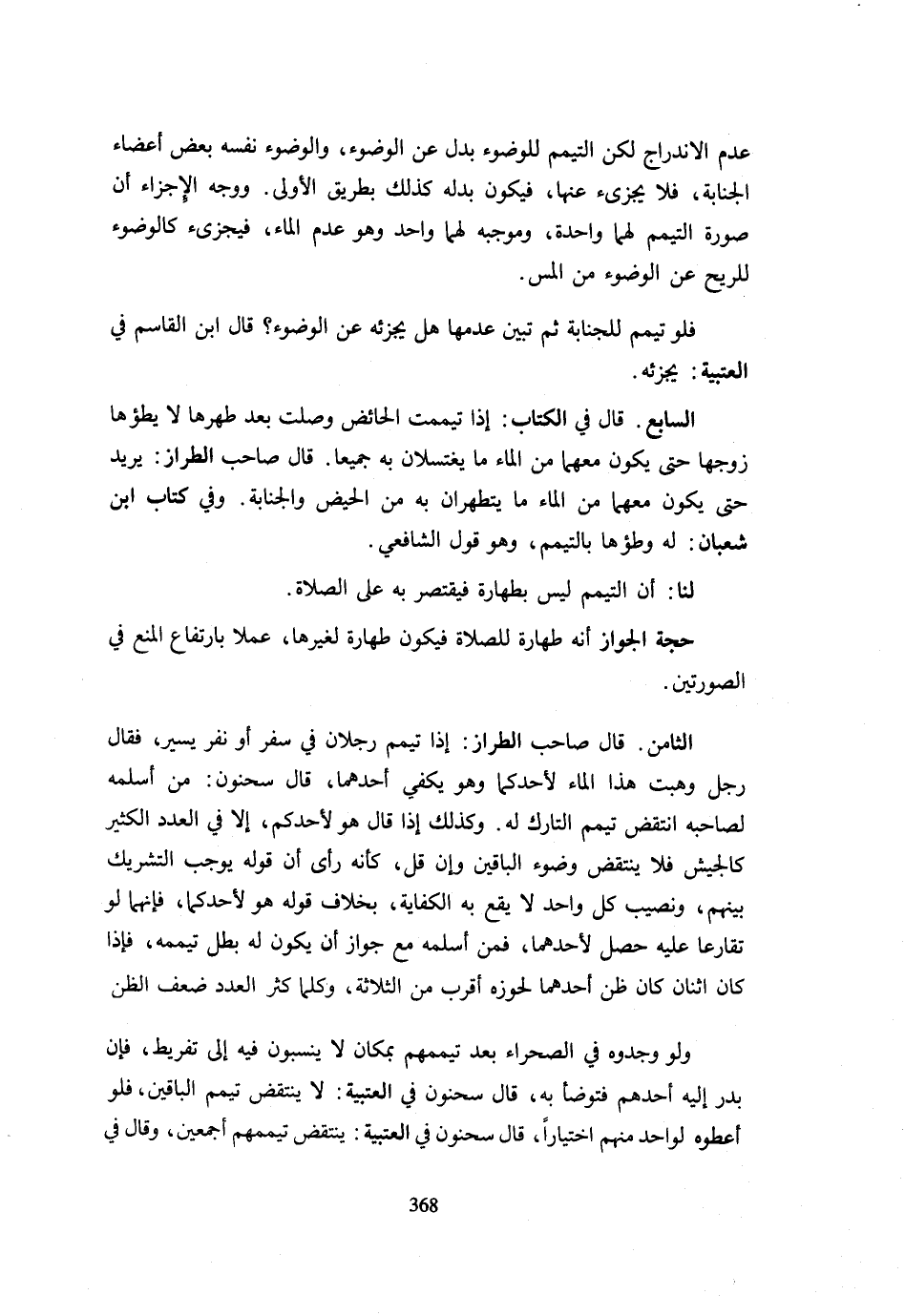 عَدَمَ الِانْدِرَاجِ لَكِنَّ التَّيَمُّمَ لِلْوُضُوءِ بَدَلٌ عَنِ الْوُضُوءِ وَالْوُضُوءُ نَفْسُهُ بَعْضُ أَعْضَاءِ الْجَنَابَةِ فَلَا يُجْزِئُ عَنْهَا فَيَكُونُ بَدَلَهُ كَذَلِكَ بِطَرِيقِ الْأَوْلَى وَوَجْهُ الْإِجْزَاءِ أَنَّ صُورَةَ التَّيَمُّمِ لَهُمَا وَاحِدَةٌ وَمُوجِبُهُ لَهُمَا وَاحِدٌ وَهُوَ عَدَمُ الْمَاءِ فَيُجْزِئُ كَالْوضُوءِ للريح عَن الوضوئ مِنَ الْمَسِّ. فَلَوْ تَيَمَّمَ لِلْجَنَابَةِ ثُمَّ تَبَيَّنَ عَدَمَهَا هَلْ يُجْزِئُهُ عَنِ الْوُضُوءِ قَالَ ابْنُ الْقَاسِمِ فِي الْعُتْبِيَّةِ يُجْزِئُهُ. السَّابِعُ قَالَ فِي الْكِتَابِ إِذَا تَيَمَّمَتِ الْحَائِضُ وَصَلَّتْ بَعْدَ طُهْرِهَا لَا يَطَؤُهَا زَوْجُهَا حَتَّى يَكُونَ مَعَهُمَا مِنَ الْمَاءِ مَا يَغْتَسِلَانِ بِهِ جَمِيعًا قَالَ صَاحِبُ الطَّرَّازِ يُرِيدُ حَتَّى يَكُونَ مَعَهُمَا مِنَ الْمَاءِ مَا يَتَطَهَّرَانِ بِهِ مِنَ الْحَيْضِ وَالْجَنَابَةِ وَفِي كِتَابِ ابْنِ شَعْبَانَ لَهُ وَطْؤُهَا بِالتَّيَمُّمِ وَهُوَ قَول الشَّافِعِي. لَنَا أَنَّ التَّيَمُّمَ لَيْسَ بِطَهَارَةٍ فَيَقْتَصِرَ بِهِ عَلَى الصَّلَاةِ. حُجَّةُ الْجَوَازِ أَنَّهُ طَهَارَةٌ لِلصَّلَاةِ فَيَكُونُ طَهَارَةً لِغَيْرِهَا عَمَلًا بِارْتِفَاعِ الْمَنْعِ فِي الصُّورَتَيْنِ. الثَّامِنُ قَالَ صَاحِبُ الطَّرَّازِ إِذَا تَيَمَّمَ رَجُلَانِ فِي سَفَرٍ أَوْ نَفَرٌ يَسِيرٌ فَقَالَ رَجُلٌ وَهَبْتُ هَذَا الْمَاءَ لِأَحَدِكُمَا وَهُوَ يَكْفِي أَحَدَهُمَا قَالَ سَحْنُونُ مَنْ أَسْلَمَهُ لِصَاحِبِهِ انْتَقَضَ تَيَمُّمُ التَّارِكِ لَهُ وَكَذَلِكَ إِذَا قَالَ هُوَ لِأَحَدِكُمْ إِلَّا فِي الْعَدَدِ الْكَثِيرِ كَالْجَيْشِ فَلَا يَنْتَقِضُ وُضُوءُ الْبَاقِينَ وَإِنْ قَلَّ كَأَنَّهُ رَأَى أَنَّ قَوْلَهُ يُوجِبُ التَّشْرِيكَ بَيْنَهُمْ وَنَصِيبُ كُلِّ وَاحِد لَا يَقع بِهِ الكفارية بِخِلَافِ قَوْلِهِ هُوَ لِأَحَدِكُمَا فَإِنَّهُمَا لَوْ تَقَارَعَا عَلَيْهِ حَصَلَ لِأَحَدِهِمَا فَمَنْ أَسْلَمَهُ مَعَ جَوَازِ أَنْ يَكُونَ لَهُ بَطَلَ تَيَمُّمُهُ فَإِذَا كَانَ اثْنَانِ كَانَ ظَنُّ أَحَدِهِمَا لِحَوْزِهِ أَقْرَبَ مِنَ الثَّلَاثَةِ وَكُلَّمَا كَثُرَ الْعَدَدُ ضَعُفَ الظَّنُّ وَلَوْ وَجَدُوهُ فِي الصَّحْرَاءِ بَعْدَ تَيَمُّمِهِمْ بِمَكَانٍ لَا ينسون فِيهِ إِلَى تَفْرِيطٍ فَإِنْ بَدَرَ إِلَيْهِ أَحَدُهُمْ فَتَوَضَّأ بِهِ قَالَ سَحْنُون فِي العتيبة لَا يَنْتَقِضُ تَيَمُّمُ الْبَاقِينَ فَلَوْ أَعْطَوْهُ لِوَاحِدٍ مِنْهُمُ اخْتِيَارًا قَالَ سَحْنُونُ فِي الْعُتْبِيَّةِ يَنْتَقِضُ تيممهم أَجْمَعِينَ وَقَالَ فِي الجموعة لَا يَنْتَقِضُ إِلَّا تَيَمُّمُ الْمُسَلَّمِ إِلَيْهِ لِأَنَّهُمْ قَبْلَ حَوْزِهِ لَا يُعَدُّونَ مَالِكِينَ لَهُ وَإِنَّمَا مَلَكَهُ مَنْ حَازَهُ كَالصَّيْدِ وَلَوْ سَلِمَ مِلْكُهُمْ فَالَّذِي يُصِيبُ كُلُّ وَاحِدٍ مِنْهُمْ لَا تَقَعُ بِهِ الْكِفَايَةُ كَمَا لَوْ وَهَبَهُ لِجَمِيعِهِمْ قَالَ صَاحِبُ الْبَيَانِ قَالَ ابْنُ الْقَاسِمِ إِذَا وَجَدَ الرُّجَلَانِ فِي السَّفَرِ مِنَ الْمَاءِ كِفَايَةَ أَحَدِهِمَا فَيَتَشَاحَّانِ عَلَيْهِ يَتَقَاوَمَانِهِ لِأَنَّ الْمُقَاوَمَةَ شِرَاءٌ وَشِرَاءُ الْمَاءِ وَاجِبٌ فَإِنْ تَرَكَ أَحَدُهُمَا الْمُقَاوَمَةَ قَبْلَ بُلُوغِهِ الْقَدْرَ الَّذِي يَجِبُ عَلَيْهِ شِرَاؤُهُ بِهِ وَصَلَّى أَعَادَ الصَّلَاةَ أَبَدًا فَلَوْ كَانَا مُعْدَمَيْنِ كَانَ لَهُمَا التَّيَمُّمُ جَمِيعًا إِلَّا أَنْ يُجِيبَا إِلَى الْقُرْعَةِ فَمَنْ صَارَ لَهُ انْتَقَضَ تَيَمُّمُهُ وَكَانَ عَلَيْهِ قِيمَةُ نَصِيبِ صَاحِبِهِ دَيْنًا وَلَوْ كَانَ أَحَدُهُمَا مُوسِرًا وَالْآخَرُ مُعْسِرًا كَانَ لِلْمُوسِرِ الْو