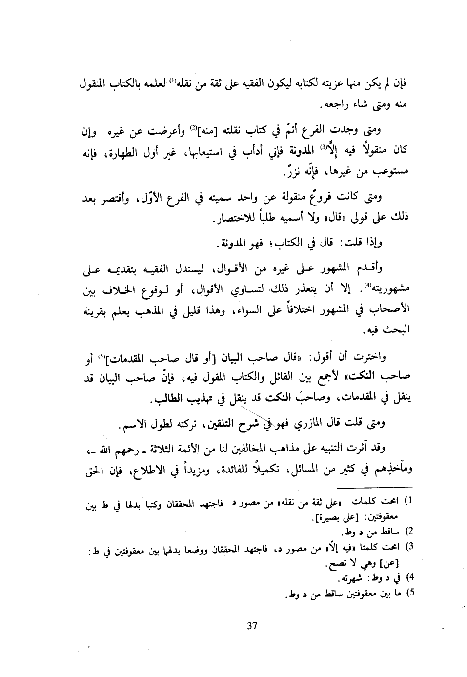 فَإِنْ لَمْ يَكُنْ مِنْهَا عَزَيْتُهُ لِكِتَابِهِ لِيَكُونَ الْفَقِيهُ عَلَى ثِقَةٍ مِنْ نَقْلِهِ لِعِلْمِهِ بِالْكِتَابِ الْمَنْقُولِ مِنْهُ وَمَتَى شَاءَ رَاجَعَهُ وَمَتَّى وَجَدْتُ الْفَرْع أتم فِي كِتَابه نَقَلْتُهُ مِنْهُ وَأَعْرَضْتُ عَنْ غَيْرِهِ وَإِنْ كَانَ مَنْقُولًا فِيهِ إِلَّا الْمُدَوَّنَةَ فَإِنِّي أَدْأَبُ فِي اسْتِيعَابِهَا غَيْرَ أَوَّلِ الطَّهَارَةِ فَإِنَّهُ مُسْتَوْعَبٌ مِنْ غَيرهَا فَإِنَّهُ نَزْرٌ وَمَتَّى كَانَتْ فُرُوعٌ مَنْقُولَةٌ عَنْ وَاحِدٍ سَمَّيْتُهُ فِي الْفَرْعِ الْأَوَّلِ وَأَقْتَصِرُ بَعْدَ ذَلِكَ عَلَى قَوْلِي قَالَ وَلَا أُسَمِّيهِ طَلَبًا لِلِاخْتِصَارِ وَإِذَا قُلْتُ قَالَ فِي الْكِتَابِ فَهُوَ الْمُدَوَّنَةُ وَأُقَدِّمُ الْمَشْهُورَ عَلَى غَيْرِهِ مِنَ الْأَقْوَالِ لِيَسْتَدِلَّ الْفَقِيه بتقديمه على مشهوريته إِلَّا أَنْ يَتَعَذَّرَ ذَلِكَ لِتَسَاوِي الْأَقْوَالِ أَوْ لوُقُوع الْخلاف بَين الْأَصْحَاب فِي الْمَشْهُورِ اخْتِلَافًا عَلَى السَّوَاءِ وَهَذَا قَلِيلٌ فِي الْمَذْهَبِ يُعْلَمُ بِقَرِينَةِ الْبَحْثِ فِيهِ وَاخْتَرْتُ أَنْ أَقُول قَالَ صَاحب الْبَيَان أَو قَالَ صَاحِبُ الْمُقَدِّمَاتِ أَوْ صَاحِبُ النُّكَتِ لِأَجْمَعَ بَيْنَ الْقَائِلِ وَالْكِتَابِ الْمَقُولِ فِيهِ فَإِنَّ صَاحِبَ الْبَيَانِ قَدْ يَنْقُلُ فِي الْمُقَدِّمَاتِ وَصَاحِبُ النُّكَتِ قَدْ يَنْقُلُ فِي تَهْذِيبِ الطَّالِبِ وَمَتَّى قُلْتُ قَالَ الْمَازِرِيُّ فَهُوَ فِي شَرْحِ التَّلْقِينِ تَرَكْتُهُ لِطُولِ الِاسْمِ وَقَدْ آثَرْتُ التَّنْبِيهَ عَلَى مَذَاهِبِ الْمُخَالِفِينَ لَنَا مِنَ الْأَئِمَّةِ الثَّلَاثَةِ رَحِمَهُمُ اللَّهُ وَمَآخِذِهِمْ فِي كَثِيرٍ مِنَ الْمَسَائِلِ تَكْمِيلًا لِلْفَائِدَةِ وَمَزِيدًا فِي الِاطِّلَاعِ فَإِنَّ الْحَقَّ