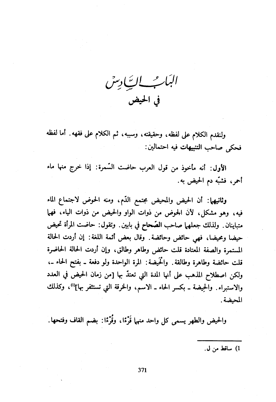 وَلْنُقَدِّمِ الْكَلَامَ عَلَى لَفْظِهِ وَحَقِيقَتِهِ وَسَبَبِهِ ثُمَّ الْكَلَامَ عَلَى فِقْهِهِ أَمَّا لَفْظُهُ فَحَكَى صَاحِبُ التَّنْبِيهَاتِ فِيهِ احْتِمَالَيْنِ: الْأَوَّلُ أَنَّهُ مَأْخُوذٌ مِنْ قَوْلِ الْعَرَبِ حَاضَتِ السَّمُرَةُ إِذَا خَرَجَ مِنْهَا مَاءٌ أَحْمَرُ فَشَبَّهَ دَمَ الْحَيْضِ بِهِ. وَثَانِيهِمَا أَنَّ الْحَيْضَ وَالْمَحِيضَ مُجْتَمَعُ الدَّمِ وَمِنْهُ الْحَوْضُ لِاجْتِمَاعِ الْمَاءِ فِيهِ وَهُوَ مُشْكِلٌ لِأَنَّ الْحَوْضَ مِنْ ذَوَاتِ الْوَاوِ وَالْحَيْضَ مِنْ ذَوَاتِ الْيَاءِ فَهُمَا مُتَبَايِنَانِ وَلِذَلِكَ جَعَلَهُمَا صَاحِبُ الصِّحَاحِ فِي بَابَيْنِ وَتَقُولُ حَاضَتِ الْمَرْأَةُ تَحِيضُ حَيْضًا وَمَحِيضًا فَهِيَ حَائِضٌ وَحَائِضَةٌ وَقَالَ بَعْضُ أَئِمَّةِ اللُّغَةِ إِنْ أَرَدْتَ الْحَالَةَ الْمُسْتَمِرَّةَ وَالصِّفَةَ الْمُعْتَادَةَ قُلْتَ حَائِضٌ وَطَاهِرٌ وَطَالِقٌ وَإِنْ أَرَدْتَ الْحَالَةَ الْحَاضِرَةَ قُلْتَ حَائِضَةٌ وَطَاهِرَةٌ وَطَالِقَةٌ وَالْحَيْضَةُ الْمَرَّةُ الْوَاحِدَةُ وَلَوْ دَفْعَةً بِفَتْحِ الْحَاءِ وَلَكِنَّ اصْطِلَاحَ الْمَذْهَبِ عَلَى أَنَّهَا الْمُدَّةُ الَّتِي تَعْتَدُّ بِهَا مِنْ زَمَانِ الْحَيْضِ فِي الْعَدَدِ وَالِاسْتِبْرَاءِ وَالْحِيضَةُ بِكَسْرِ الْحَاءِ الِاسْمُ وَالْخِرْقَةُ الَّتِي تَسْتَثْفِرُ بِهَا وَكَذَلِكَ الْمَحِيضَةُ. وَالْحَيْضُ وَالطُّهْرُ يُسمى كل وَاحِد مِنْهَا قُرْءًا وَقُرْءًا بِضَمِّ الْقَافِ وَفَتْحِهَا