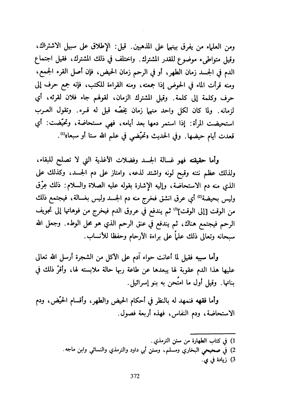 وَأَمَّا حَقِيقَتُهُ فَهُوَ غُسَالَةُ الْجَسَدِ وَفَضَلَاتِ الْأَغْذِيَةِ الَّتِي لَا تَصْلُحُ لِلْبَقَاءِ وَلِذَلِكَ عَظُمَ نَتَنُهُ وَقَبُحَ لَوْنُهُ وَاشْتَدَّ لَذْعُهُ وَامْتَازَ عَلَى دَمِ الْجَسَدِ وَكَذَلِكَ عَلَى الَّذِي مِنْهُ دَمُ الِاسْتِحَاضَةِ وَإِلَيْهِ الْإِشَارَةُ بِقَوْلِهِ عَلَيْهِ الصَّلَاةُ وَالسَّلَامُ ذَلِكَ عِرْقٌ وَلَيْسَ بِحَيْضَةٍ أَيْ عِرْقٌ انْشَقَّ فَخَرَجَ مِنْهُ دَمُ الْجَسَدِ وَلَيْسَ بِغُسَالَةٍ فَيَجْتَمِعُ ذَلِكَ مِنَ الْوَقْتِ إِلَى الْوَقْتِ ثُمَّ يَنْدَفِعُ فِي عُرُوقِ الدَّمِ فَيَخْرُجُ مِنْ فُوَّهَاتِهَا إِلَى تَجْوِيفِ الرَّحِمِ فَيَجْتَمِعُ هُنَاكَ ثُمَّ يَنْدَفِعُ فِي عُنُقِ الرَّحِمِ الَّذِي هُوَ مَحَلُّ الْوَطْءِ وَجَعَلَ اللَّهُ سُبْحَانَهُ وَتَعَالَى ذَلِكَ عَلَمًا عَلَى بَرَاءَةِ الْأَرْحَامِ وَحِفْظًا لِلْأَنْسَابِ. وَأَمَّا سَبَبُهُ فَقِيلَ لَمَّا أَعَانَتْ حَوَّاءُ آدَمَ عَلَى الْأَكْلِ مِنَ الشَّجَرَةِ أَرْسَلَ اللَّهُ تَعَالَى عَلَيْهَا هَذَا الدَّمَ عُقُوبَةً لَهَا يُبْعِدُهَا عَنْ طَاعَةِ رَبِّهَا حَالَةَ مُلَابَسَتِهِ لَهَا وَأَقَرَّ ذَلِكَ فِي بَنَاتِهَا وَقِيلَ أَوَّلُ مَا امْتُحِنَ بِهِ بَنُو إِسْرَائِيلَ. وَأَمَّا فِقْهُهُ فَنُمَهِّدُ لَهُ بِالنَّظَرِ فِي أَحْكَامِ الْحَيْضِ وَالطُّهْرِ وَأَقْسَامِ الْحَيْضِ وَدَمِ الِاسْتِحَاضَةِ وَدَمِ النِّفَاسِ فَهَذِهِ أَرْبَعَة فُصُول.