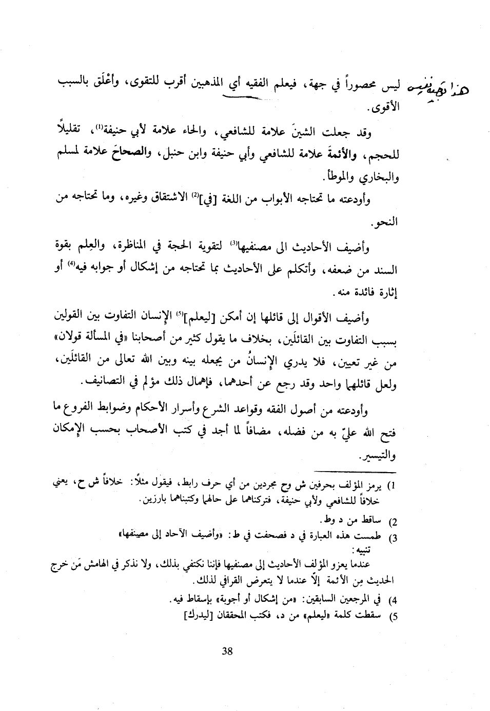 لَيْسَ مَحْصُورًا فِي جِهَةٍ فَيَعْلَمُ الْفَقِيهُ أَيُّ الْمَذْهَبَيْنِ أَقْرَبُ لِلتَّقْوَى وَأَعْلَقُ بِالسَّبَبِ الْأَقْوَى وَقَدْ جَعَلْتُ الشِّينَ عَلَامَةً لِلشَّافِعِيِّ وَالْحَاءَ عَلَامَةً لِأَبِي حَنِيفَةَ تَقْلِيلًا لِلْحَجْمِ وَالْأَئِمَّةَ عَلَامَةً لِلشَّافِعِيِّ وَأَبِي حَنِيفَةَ وَابْنِ حَنْبَلٍ وَالصِّحَاحَ عَلَامَةً لِمُسْلِمٍ وَالْبُخَارِيِّ وَالْمُوَطَّأِ وَأَوْدَعْتُهُ مَا تَحْتَاجُهُ الْأَبْوَابُ مِنَ اللُّغَةِ فِي الِاشْتِقَاقِ وَغَيْرِهِ وَمَا تَحْتَاجُهُ مِنَ النَّحْوِ وَأُضِيفُ الْأَحَادِيثَ إِلَى مُصَنِّفِيهَا لِتَقْوِيَةِ الْحُجَّةِ فِي الْمُنَاظَرَةِ وَالْعِلْمِ بِقُوَّةِ السَّنَدِ مِنْ ضَعْفِهِ وَأَتَكَلَّمُ عَلَى الْأَحَادِيثِ بِمَا تَحْتَاجُهُ مِنْ إِشْكَالٍ أَوْ جَوَابه فِيهِ أَوْ إِثَارَةِ فَائِدَةٍ مِنْهُ وَأُضِيفُ الْأَقْوَالَ إِلَى قَائِلهَا إِنْ أَمْكَنَ لِيَعْلَمَ الْإِنْسَانُ التَّفَاوُتَ بَيْنَ الْقَوْلَيْنِ بِسَبَبِ التَّفَاوُتِ بَيْنَ الْقَائِلِينَ بِخِلَافِ مَا يَقُولُ كَثِيرٌ مِنْ أَصْحَابِنَا فِي الْمَسْأَلَةِ قَوْلَانِ مِنْ غَيْرِ تَعْيِينٍ فَلَا يَدْرِي الْإِنْسَانُ مَنْ يَجْعَلُهُ بَيْنَهُ وَبَيْنَ اللَّهِ تَعَالَى مِنَ الْقَائِلَيْنِ وَلَعَلَّ قَائِلَهُمَا وَاحِدٌ وَقَدْ رَجَعَ عَنْ أَحَدِهِمَا فَإِهْمَالُ ذَلِكَ مُؤْلِمٌ فِي التَّصَانِيفِ وَأَوْدَعْتُهُ مِنْ أُصُولِ الْفِقْهِ وَقَوَاعِدِ الشَّرْعِ وَأَسْرَارِ الْأَحْكَامِ وَضَوَابِطِ الْفُرُوعِ مَا فَتَحَ اللَّهُ عَلَيَّ بِهِ مِنْ فَضْلِهِ مُضَافًا لِمَا أَجِدُ فِي كُتُبِ الْأَصْحَابِ بِحَسَبِ الْإِمْكَان والتيسير