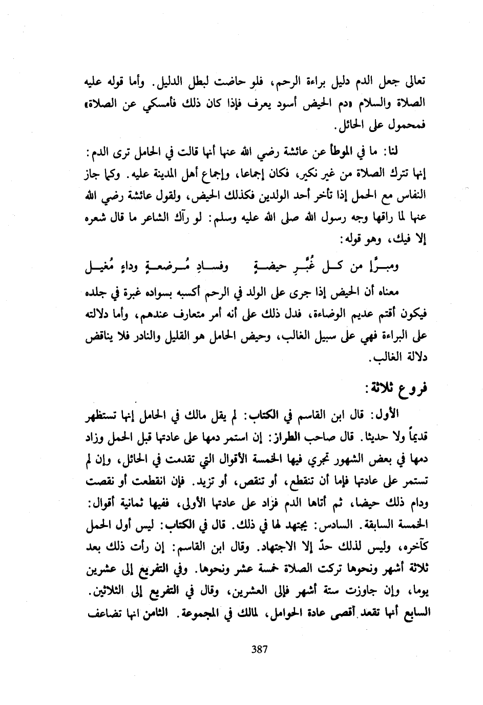 مَعْنَاهُ أَنَّ الْحَيْضَ إِذَا جَرَى عَلَى الْوَلَدِ فِي الرَّحِمِ أَكْسَبَهُ بِسَوَادِهِ غَبَرَةً فِي جِلْدِهِ فَيَكُونُ أَقْتَمَ عَدِيمَ الْوَضَاءَةِ فَدَلَّ ذَلِكَ عَلَى أَنَّهُ أَمْرٌ مُتَعَارَفٌ عِنْدَهُمْ وَأَمَّا دَلَالَتُهُ عَلَى الْبَرَاءَةِ فَهِيَ عَلَى سَبِيلِ الْغَالِبِ وَحَيْضُ الْحَامِلِ هُوَ الْقَلِيلُ وَالنَّادِرُ فَلَا يُنَاقِضُ دَلَالَةَ الْغَالِبِ. فُرُوعٌ ثَلَاثَةٌ: الْأَوَّلُ قَالَ ابْنُ الْقَاسِمِ فِي الْكِتَابِ لَمْ يَقُلْ مَالِكٌ فِي الْحَامِلِ إِنَّهَا تَسْتَظْهِرُ قَدِيمًا وَلَا حَدِيثًا قَالَ صَاحِبُ الطَّرَّازِ إِنِ اسْتَمَرَّ دَمُهَا عَلَى عَادَتِهَا قَبْلَ الْحَمْلِ وَزَادَ دَمُهَا فِي بَعْضِ الشُّهُورِ تَجْرِي فِيهَا الْخَمْسَةُ الْأَقْوَالُ الَّتِي تَقَدَّمَتْ فِي الْحَائِلِ وَإِنْ لَمْ تَسْتَمِرَّ عَلَى عَادَتِهَا فَإِمَّا أَنْ تَنْقَطِعَ أَوْ تَنْقُصَ أَوْ تَزِيدَ فَإِنِ انْقَطَعَتْ أَوْ نَقَصَتْ وَدَامَ ذَلِكَ حَيْضًا ثُمَّ أَتَاهَا الدَّمُ فَزَادَ عَلَى عَادَتِهَا الْأُولَى فَفِيهَا ثَمَانِيَةُ أَقْوَالٍ الْخَمْسَةُ السَّابِقَةُ السَّادِسُ يُجْتَهَدُ لَهَا فِي ذَلِكَ قَالَ فِي الْكِتَابِ لَيْسَ أَوَّلُ الْحَمْلِ كَآخِرِهِ وَلَيْسَ لِذَلِكَ حَدٌّ إِلَّا الِاجْتِهَادُ وَقَالَ ابْنُ الْقَاسِمِ إِنْ رَأَتْ ذَلِكَ بَعْدَ ثَلَاثَةِ أَشْهُرٍ وَنَحْوِهَا تَرَكَتِ الصَّلَاةَ خَمْسَةَ عَشَرَ وَنَحْوَهَا وَفِي التَّفْرِيعِ إِلَى عِشْرِينَ يَوْمًا وَإِنْ جَاوَزَتْ سِتَّةَ أَشْهُرٍ فَإِلَى الْعِشْرِينَ وَقَالَ فِي التَّفْرِيعِ إِلَى الثَّلَاثِينَ السَّابِعُ أَنَّهَا تَقْعُدُ أَقْصَى عَادَةِ الْحَوَامِلِ لِمَالِكٍ فِي الْمَجْمُوعَةِ الثَّامِنُ أَنَّهَا تضَاعف