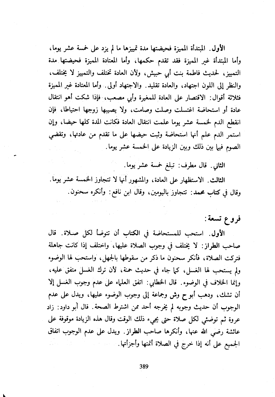 الْأَوَّلُ الْمُبْتَدَأَةُ الْمُمَيِّزَةُ فَحَيْضَتُهَا مُدَّةُ تَمْيِيزِهَا مَا لَمْ يَزِدْ عَلَى خَمْسَةَ عَشَرَ يَوْمًا وَأَمَّا الْمُبْتَدَأَةُ غَيْرُ الْمُمَيِّزَةِ فَقَدْ تَقَدَّمَ حُكْمُهَا وَأَمَّا الْمُعْتَادَةُ الْمُمَيِّزَةُ فَحَيْضَتُهَا مُدَّةُ التَّمْيِيزِ لِحَدِيثِ فَاطِمَةَ بِنْتِ أَبِي حُبَيْشٍ وَلِأَنَّ الْعَادَةَ تَخْتَلِفُ وَالتَّمْيِيزَ لَا يَخْتَلِفُ وَالنَّظَرَ إِلَى اللَّوْنِ اجْتِهَادٌ وَالْعَادَةَ تَقْلِيدٌ وَالِاجْتِهَادَ أَوْلَى وَأَمَّا الْمُعْتَادَةُ غَيْرُ الْمُمَيِّزَةِ فَثَلَاثَةُ أَقْوَالٍ الِاقْتِصَارُ عَلَى الْعَادَةِ لِلْمُغِيرَةِ وَأَبِي مُصْعَبٍ فَإِذَا شَكَّتْ أَهُوَ انْتِقَالُ عَادَةٍ أَوِ اسْتِحَاضَةٌ اغْتَسَلَتْ وَصَلَّتْ وَصَامَتْ وَلَا يُصِيبُهَا زَوْجُهَا احْتِيَاطًا فَإِنِ انْقَطَعَ الدَّمُ لِخَمْسَةَ عَشَرَ يَوْمًا عَلِمَتِ انْتِقَالَ الْعَادَةِ فَكَانَتِ الْمُدَّةُ كُلُّهَا حَيْضًا وَإِنِ اسْتَمَرَّ الدَّمُ عُلِمَ أَنَّهَا اسْتِحَاضَةٌ وَثَبَتَ حَيْضُهَا عَلَى مَا تَقَدَّمَ مِنْ عَادَتِهَا وَتَقْضِي الصَّوْمَ فِيمَا بَيْنَ ذَلِكَ وَبَيْنَ الزِّيَادَةِ عَلَى الْخَمْسَةَ عَشَرَ يَوْمًا. الثَّانِي قَالَ مُطَرِّفٌ تَبْلُغُ خَمْسَةَ عَشَرَ يَوْمًا. الثَّالِثُ الِاسْتِظْهَارُ عَلَى الْعَادَةِ وَالْمَشْهُورُ أَنَّهَا لَا تَتَجَاوَزُ الْخَمْسَةَ عَشَرَ يَوْمًا وَقَالَ فِي كِتَابِ مُحَمَّدٍ تَتَجَاوَزُ بِالْيَوْمَيْنِ وَقَالَ ابْنُ نَافِعٍ وَأَنْكَرَهُ سَحْنُونٌ. فُرُوعٌ تِسْعَةٌ: الْأَوَّلُ اسْتُحِبَّ لِلْمُسْتَحَاضَةِ فِي الْكِتَابِ أَنْ تَتَوَضَّأَ لِكُلِّ صَلَاةٍ قَالَ صَاحِبُ الطَّرَّازِ لَا يُخْتَلَفُ فِي وُجُوبِ الصَّلَاةِ عَلَيْهَا وَاخْتُلِفَ إِذَا كَانَتْ جَاهِلَةً فَتَرَكَتِ الصَّلَاةَ فَأَنْكَرَ سَحْنُونٌ مَا ذُكِرَ مِنْ سُقُوطِهَا بِالْجَهْلِ وَاسْتُحِبَّ لَهَا الْوُضُوءُ وَلَمْ يُسْتَحَبَّ لَهَا الْغُسْلُ كَمَا جَاءَ فِي حَدِيثِ حَمْنَةَ لِأَنَّ تَرْكَ الْغُسْلِ // (مُتَّفَقٌ عَلَيْهِ) // وَإِنَّمَا الْخِلَافُ فِي الْوُضُوءِ قَالَ الْخَطَّابِيُّ اتَّفَقَ الْعُلَمَاءُ عَلَى عدم وجوب الْغسْل إِلَّا أَن تشك ودهب أَبُو ح وَش وَجَمَاعَةٌ إِلَى وُجُوبِ الْوُضُوءِ عَلَيْهَا وَيَدُلُّ عَلَى عَدَمِ الْوُجُوبِ أَنَّ حَدِيثَ وُجُوبِهِ لَمْ يُخَرِّجْهُ أَحَدٌ مِمَّنِ اشْتَرَطَ الصِّحَّةَ قَالَ أَبُو دَاوُدَ زَادَ عُرْوَةُ ثُمَّ تَوَضَّئِي لِكُلِّ صَلَاةٍ حَتَّى يَجِيءَ ذَلِكَ الْوَقْتُ وَقَالَ هَذِهِ الزِّيَادَةُ مَوْقُوفَةٌ عَلَى عَائِشَةَ رَضِيَ اللَّهُ عَنْهَا وَأَنْكَرَهَا صَاحِبُ الطَّرَّازِ وَيَدُلُّ عَلَى عَدَمِ الْوُجُوبِ اتِّفَاقُ الْجَمِيعِ عَلَى أَنَّهُ إِذَا خَرَجَ فِي الصَّلَاة أتمتها وأجزأتها.