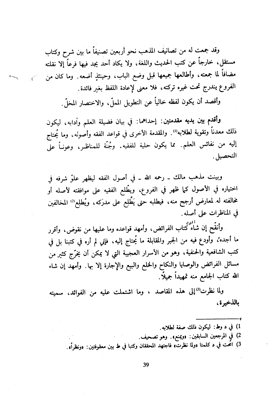 وَقَدْ جَمَعْتُ لَهُ مِنْ تَصَانِيفِ الْمَذْهَبِ نَحْوَ أَرْبَعِينَ تَصْنِيفًا مَا بَيْنَ شَرْحٍ وَكِتَابٍ مُسْتَقِلٍّ خَارِجًا عَنْ كُتُبِ الْحَدِيثِ وَاللُّغَةِ وَلَا يَكَادُ أَحَدٌ يَجِدُ فِيهَا فَرْعًا إِلَّا نَقَلْتُهُ مُضَافًا لِمَا جَمَعْتُهُ وَأُطَالِعُهَا جَمِيعَهَا قَبْلَ وَضْعِ الْبَابِ وَحِينَئِذٍ أَضَعُهُ وَمَا كَانَ مِنَ الْفُرُوعِ يَنْدَرِجُ تَحْتَ غَيْرِهِ تَرَكْتُهُ فَلَا مَعْنَى لِإِعَادَةِ اللَّفْظِ بِغَيْرِ فَائِدَةٍ وَأَقْصِدُ أَنْ يَكُونَ لَفْظُهُ خَالِيًا عَنِ التَّطْوِيلِ الْمُمِلِّ وَالِاخْتِصَارِ الْمُخِلِّ وَأُقَدِّمُ بَيْنَ يَدَيْهِ مُقَدِّمَتَيْنِ إِحْدَاهُمَا فِي بَيَانِ فَضِيلَةِ الْعِلْمِ وآدابه ليَكُون ذَلِك معدنا وَتَقْوِيَةً لِطُلَّابِهِ وَالْمُقَدِّمَةُ الْأُخْرَى فِي قَوَاعِدِ الْفِقْهِ وَأُصُولِهِ وَمَا يُحْتَاجُ إِلَيْهِ مِنْ نَفَائِسِ الْعِلْمِ مِمَّا يَكُونُ حِلْيَةً لِلْفَقِيهِ وَجُنَّةً لِلْمُنَاظِرِ وَعَوْنًا عَلَى التَّحْصِيلِ وَبَيَّنْتُ مَذْهَبَ مَالِكٍ رَحِمَهُ اللَّهُ فِي أُصُولِ الْفِقْهِ لِيَظْهَرَ عُلُوُّ شَرَفِهِ فِي اخْتِيَارِهِ فِي الْأُصُولِ كَمَا ظَهَرَ فِي الْفُرُوعِ ويطلع الْفَقِيه على مُوَافقَة لِأَصْلِهِ أَوْ مُخَالَفَتِهِ لَهُ لِمُعَارِضٍ أَرْجَحَ مِنْهُ فَيَطْلُبَهُ حَتَّى يَطَّلِعَ عَلَى مَدْرَكِهِ وَيُطْلِعَ الْمُخَالِفِينَ فِي الْمُنَاظَرَاتِ عَلَى أَصْلِهِ وَأُنَقِّحُ إِنْ شَاءَ كِتَابَ الْفَرَائِضِ وَأُمَهِّدُ قَوَاعِدَهُ وَمَا عَلَيْهَا مَنْ نُقُوضٍ وَأُقَرِّرُ مَا أَجِدُهُ وَأُودِعُ فِيهِ مِنَ الْجَبْرِ وَالْمُقَابَلَةِ مَا يَحْتَاجُ إِلَيْهِ فَإِنِّي لَمْ أَرَهُ فِي كُتُبِنَا بَلْ فِي كُتُبِ الشَّافِعِيَّةِ وَالْحَنَفِيَّةِ وَهُوَ مِنَ الْأَسْرَارِ الْعَجِيبَةِ الَّتِي لَا يُمْكِنُ أَنْ يُخَرَّجَ كَثِيرٌ مِنْ مَسَائِلِ الْفَرَائِضِ وَالْوَصَايَا وَالنِّكَاحِ وَالْخُلْعِ وَالْبَيْعِ وَالْإِجَارَةِ إِلَّا بِهَا وَأُمَهِّدُ إِنْ شَاءَ اللَّهُ كِتَابَ الْجَامِعِ مِنْهُ تَمْهِيدًا جَمِيلًا وَلَمَّا نَظَرْتُ إِلَى هَذِهِ الْمَقَاصِدِ وَمَا اشْتَمَلَتْ عَلَيْهِ مِنَ الْفَوَائِدِ سَمَّيْتُهُ بِالذَّخِيرَةِ