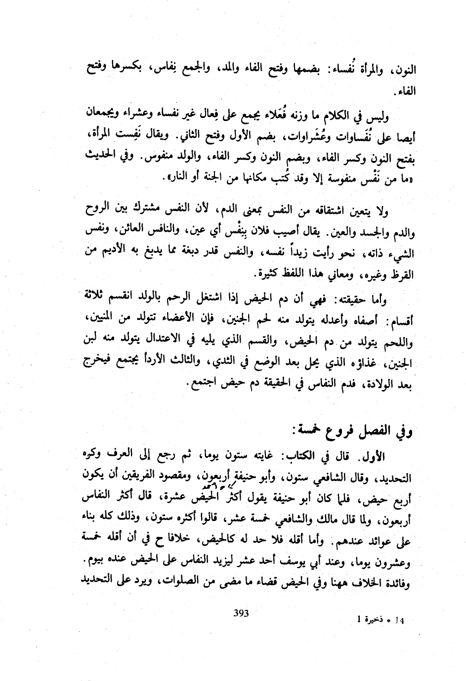 وَلَا يَتَعَيَّنُ اشْتِقَاقُهُ مِنَ النَّفْسِ بِمَعْنَى الدَّمِ لِأَنَّ النَّفْسَ مُشْتَرَكٌ بَيْنَ الرُّوحِ وَالدَّمِ وَالْجَسَدِ وَالْعَيْنِ يُقَالُ أُصِيبَ فُلَانٌ بِنَفْسٍ أَيْ عَيْنٍ وَالنَّافِسُ الْعَائِنُ وَنَفْسُ الشَّيْءِ ذَاتُهُ نَحْوَ رَأَيْتُ زَيْدًا نَفْسَهُ وَالنَّفْسُ قَدْرُ دَبْغَةٍ مِمَّا يُدْبَغُ بِهِ الْأَدِيمُ مِنَ الْقَرَظِ وَغَيْرِهِ وَمَعَانِي هَذَا اللَّفْظِ كَثِيرَةٌ. وَأَمَّا حَقِيقَتُهُ فَهِيَ أَنَّ دَمَ الْحَيْضِ إِذَا اشْتَغَلَ الرَّحِمُ بِالْوَلَدِ انْقَسَمَ ثَلَاثَةَ أَقْسَامٍ أَصْفَاهُ وَأَعْدَلُهُ يَتَوَلَّدُ مِنْهُ لَحْمُ الْجَنِينِ فَإِنَّ الْأَعْضَاءَ تَتَوَلَّدُ مَنِ الْمَنِيَّيْنِ وَاللَّحْمَ يَتَوَلَّدُ مِنْ دَمِ الْحَيْضِ وَالْقِسْمُ الَّذِي يَلِيهِ فِي الِاعْتِدَالِ يَتَوَلَّدُ مِنْهُ لَبَنُ الْجَنِينِ غِذَاؤُهُ الَّذِي يَحِلُّ بَعْدَ الْوَضْعِ فِي الثَّدْيِ وَالثَّالِثُ الْأَرْدَأُ يَجْتَمِعُ فَيَخْرُجُ بَعْدَ الْوِلَادَةِ فَدَمُ النِّفَاسِ فِي الْحَقِيقَةِ دَمُ حَيْضٍ اجْتَمَعَ. وَفِي الْفَصْلِ فُرُوعٌ خَمْسَةٌ: الْأَوَّلُ قَالَ فِي الْكِتَابِ غَايَتُهُ سِتُّونَ يَوْمًا ثُمَّ رَجَعَ إِلَى الْعُرْفِ وَكَرِهَ التَّحْدِيدَ وَقَالَ الشَّافِعِي سِتُّونَ وَأَبُو حنيفَة أَرْبَعُونَ وَمَقْصُودُ الْفَرِيقَيْنِ أَنْ يَكُونَ أَرْبَعُ حِيَضٍ فَلَمَّا كَانَ أَبُو حنيفَة يَقُولُ أَكْثَرُ الْحَيْضِ عَشَرَةٌ قَالَ أَكْثَرُ النِّفَاسِ أَرْبَعُونَ وَلما قَالَ مَالك وَالشَّافِعِيّ خَمْسَةَ عَشَرَ قَالُوا أَكْثَرُهُ سِتُّونَ وَذَلِكَ كُلُّهُ بِنَاءً عَلَى عَوَائِدَ عِنْدَهُمْ وَأَمَّا أَقَلُّهُ فَلَا حَدَّ لَهُ كَالْحَيْضِ خِلَافًا ح فِي أَنَّ أَقَلَّهُ خَمْسَةٌ وَعِشْرُونَ يَوْمًا وَعِنْدَ أَبِي يُوسُفَ أَحَدَ عَشَرَ لِيَزِيدَ النِّفَاسُ عَلَى الْحَيْضِ عِنْدَهُ بِيَوْم وَفَائِدَة الْخلاف هَهُنَا وَفِي الْحَيْضِ قَضَاءُ مَا مَضَى مِنَ الصَّلَوَاتِ وَيَرِدُ عَلَى التَّحْدِيدِ