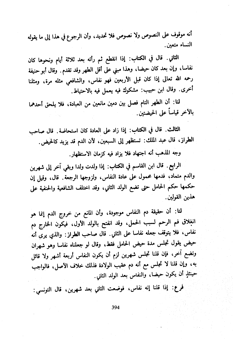 أَنَّهُ مَوْقُوفٌ عَلَى النُّصُوصِ وَلَا نُصُوصَ فَلَا تَحْدِيدَ وَأَنَّ الرُّجُوعَ فِي هَذَا إِلَى مَا يَقُولُهُ النِّسَاءُ مُتَعَيَّنٌ. الثَّانِي قَالَ فِي الْكِتَابِ إِذَا انْقَطَعَ ثُمَّ رَأَتْهُ بَعْدَ ثَلَاثَةِ أَيَّامٍ وَنَحْوِهَا كَانَ نِفَاسًا وَإِنْ بَعُدَ كَانَ حَيْضًا وَهَذَا مَبْنِيٌّ عَلَى أَقَلِّ الطُّهْرِ وَقَدْ تَقَدَّمَ وَقَالَ أَبُو حنيفَة رَحِمَهُ اللَّهُ تَعَالَى إِذَا كَانَ قَبْلَ الْأَرْبَعِينَ فَهُوَ نِفَاس وَالشَّافِعِيّ مِثْلَهُ مَرَّةً وَمِثْلَنَا أُخْرَى وَقَالَ ابْنُ حَبِيبٍ مَشْكُوكٌ فِيهِ يُعْمَلُ فِيهِ بِالِاحْتِيَاطِ. لَنَا أَنَّ الطُّهْرَ التَّامَّ فَصْلٌ بَيْنَ دَمَيْنِ مَانِعَيْنِ مِنَ الْعِبَادَةِ فَلَا يَلْحَقُ أَحَدُهُمَا بِالْآخَرِ قِيَاسًا عَلَى الْحَيْضَتَيْنِ. الثَّالِثُ قَالَ فِي الْكِتَابِ إِذَا زَادَ عَلَى الْعَادَةِ كَانَ اسْتِحَاضَةً قَالَ صَاحِبُ الطَّرَّازِ قَالَ عَبْدُ الْمَلِكِ تَسْتَظْهِرُ إِلَى السَّبْعِينَ لِأَنَّ الدَّمَ قَدْ يَزِيدُ كَالْحَيْضِ. وَجْهُ الْمَذْهَبِ أَنَّهُ اجْتِهَادٌ فَلَا يُزَادُ فِيهِ كَزَمَانِ الِاسْتِظْهَارِ. الرَّابِعُ قَالَ ابْنُ الْقَاسِمِ فِي الْكِتَابِ إِذَا وَلَدَتْ وَلَدًا وَبَقِيَ آخَرُ إِلَى شَهْرَيْنِ وَالدَّمُ مُتَمَادٍ فَدَمُهَا مَحْمُولٌ عَلَى عَادَةِ النِّفَاسِ وَلِزَوْجِهَا الرَّجْعَةُ قَالَ وَقِيلَ إِنَّ حُكْمَهَا حُكْمُ الْحَامِلِ حَتَّى تَضَعَ الْوَلَدَ الثَّانِيَ وَقَدِ اخْتَلَفَ الشَّافِعِيَّةُ وَالْحَنَفِيَّةُ عَلَى هَذَيْنِ الْقَوْلَيْنِ. لَنَا أَنَّ حَقِيقَةَ دَمِ النِّفَاسِ مَوْجُودَةٌ وَأَنَّ الْمَانِعَ مِنْ خُرُوجِ الدَّمِ إِنَّمَا هُوَ انْغِلَاقُ فَمِ الرَّحِمِ لِسَبَبِ الْحَمْلِ وَقَدِ انْفَتَحَ بِالْوَلَدِ الْأَوَّلِ فَيَكُونُ الْخَارِجُ دَمَ نِفَاسٍ فَلَا يَتَوَقَّفُ جَعْلُهُ نِفَاسًا عَلَى الثَّانِي قَالَ صَاحِبُ الطَّرَّازِ وَالَّذِي يَرَى أَنَّهُ حَيْضٌ يَقُولُ تَجْلِسُ مُدَّةَ حَيْضِ الْحَامِلِ فَقَطْ وَقَالَ لَو جَعَلْنَاهُ نفاسا على وَهُوَ شَهْرَانِ وَتَضَعُ آخَرَ فَإِنْ قُلْنَا تَجْلِسُ شَهْرَيْنِ لَزِمَ أَنْ يَكُونَ النِّفَاسُ أَرْبَعَةَ أَشْهُرٍ وَلَا قَائِلَ بِهِ وَإِنْ قُلْنَا لَا تَجْلِسُ مَعَ أَنَّهُ دَمٌ عَقِيبَ الْوِلَادَةِ فَذَلِكَ خِلَافُ الْأَصْلِ فَالْوَاجِبُ حِينَئِذٍ أَنْ يَكُونَ حَيْضًا وَالنِّفَاسُ بَعْدَ الْوَلَدِ الثَّانِي. فَرْعٌ إِذَا قُلْنَا إِنَّهُ نِفَاسٌ فَوَضَعَتِ الثَّانِيَ بَعْدَ شَهْرَيْنِ قَالَ التُّونِسِيُّ
