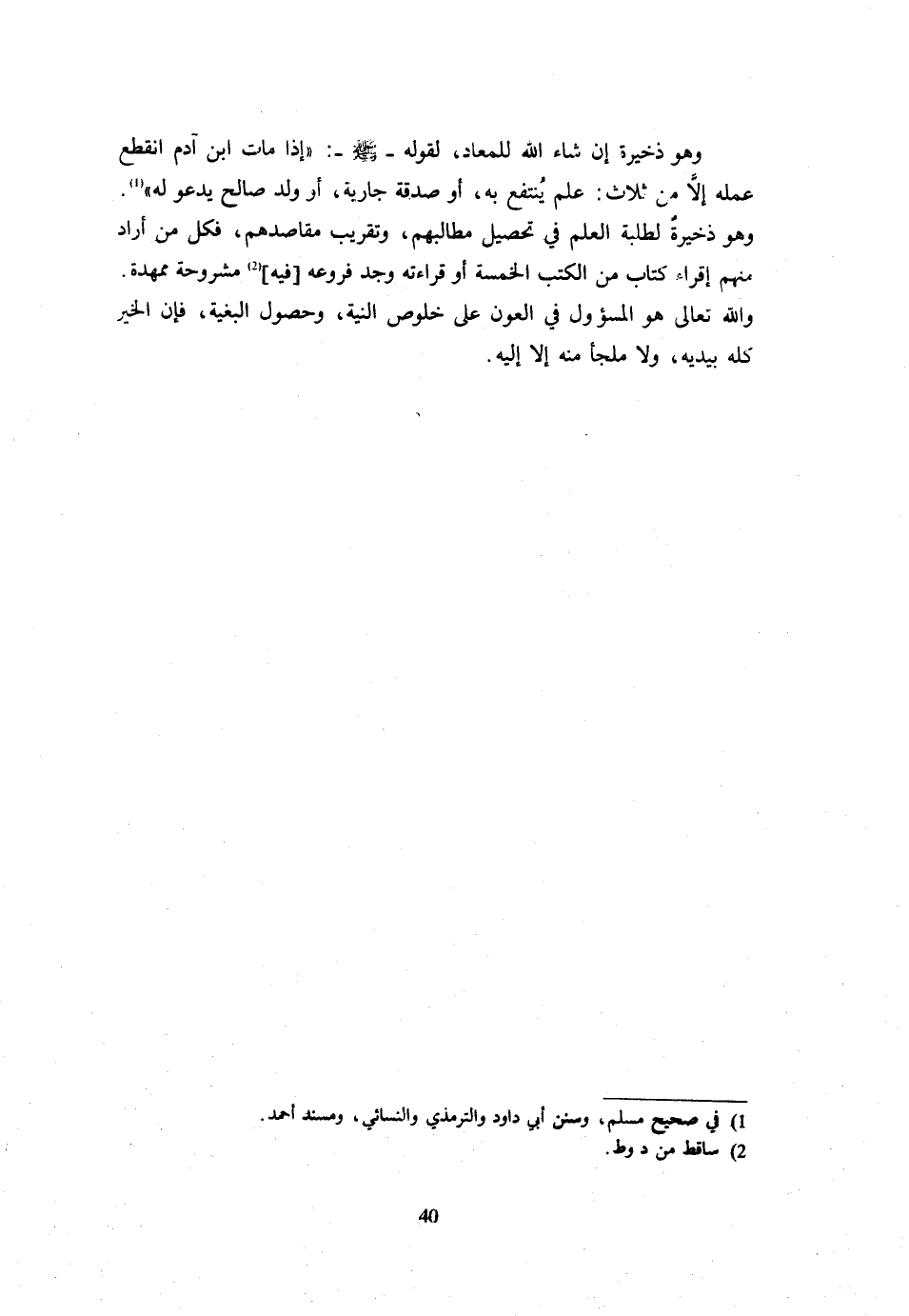 وَهُوَ ذَخِيرَةٌ إِنْ شَاءَ اللَّهُ لِلْمَعَادِ لِقَوْلِهِ صَلَّى اللَّهُ عَلَيْهِ وَسَلَّمَ