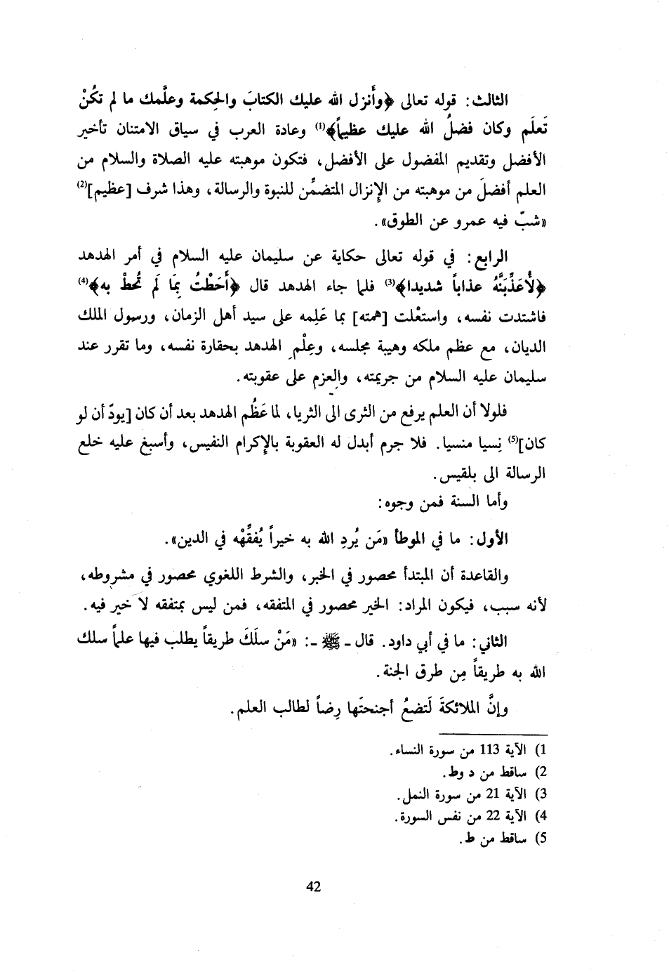 الثَّالِثُ قَوْلُهُ تَعَالَى {وَأَنْزَلَ اللَّهُ عَلَيْكَ الْكِتَابَ وَالْحِكْمَةَ وَعَلَّمَكَ مَا لَمْ تَكُنْ تَعْلَمُ وَكَانَ فضل الله عَلَيْك عَظِيما} وَعَادَةُ الْعَرَبِ فِي سِيَاقِ الِامْتِنَانِ تَأْخِيرُ الْأَفْضَلِ وَتَقْدِيمُ الْمَفْضُولِ عَلَى الْأَفْضَلِ فَتَكُونُ مَوْهِبَتُهُ عَلَيْهِ الصَّلَاةُ وَالسَّلَامُ مِنَ الْعِلْمِ أَفْضَلَ مِنْ مَوْهِبَتِهِ مِنَ الْإِنْزَالِ الْمُتَضَمِّنِ لِلنُّبُوَّةِ وَالرِّسَالَةِ وَهَذَا شَرَفٌ عَظِيمٌ شَبَّ فِيهِ عَمْرٌو عَنِ الطَّوْقِ الرَّابِعُ فِي قَوْلِهِ تَعَالَى حِكَايَةً عَنْ سُلَيْمَانَ عَلَيْهِ السَّلَامُ فِي أَمر الهدهد {لأعذبنه عذَابا شَدِيدا} فَلَمَّا جَاءَ الهدهد قَالَ {أحطت بِمَا لم تحط بِهِ} فاشتدت نَفْسُهُ وَاسْتَعْلَتْ هِمَّتُهُ بِمَا عَلِمَهُ عَلَى سَيِّدِ أَهْلِ الزَّمَانِ وَرَسُولِ الْمَلِكِ الدَّيَّانِ مَعَ عِظَمِ مُلْكِهِ وَهَيْبَةِ مَجْلِسِهِ وَعِلْمِ الْهُدْهُدِ بِحَقَارَةِ نَفْسِهِ وَمَا تَقَرَّرَ عِنْدَ سُلَيْمَانَ عَلَيْهِ السَّلَامُ مِنْ جَرِيمَتِهِ وَالْعَزْمِ عَلَى عُقُوبَتِهِ فَلَوْلَا أَنَّ الْعِلْمَ يَرْفَعُ مِنَ الثَّرَى إِلَى الثُّرَيَّا لَمَا عَظُمَ الهدهد بعد أَن كَانَ يود أَن لَو كَانَ نَسْيًا مَنْسِيًّا فَلَا جَرَمَ أَبْدَلَ لَهُ الْعُقُوبَةَ بِالْإِكْرَامِ النَّفِيسِ وَأَسْبَغَ عَلَيْهِ خِلَعَ الرِّسَالَةِ إِلَى بِلْقِيسَ وَأَمَّا السُّنَّةُ فَمِنْ وُجُوهٍ الْأَوَّلُ مَا فِي الْمُوَطَّأ من يرد الله خيرا يفقه فِي الدِّينِ وَالْقَاعِدَةُ أَنَّ الْمُبْتَدَأَ مَحْصُورٌ فِي الْخَبَرِ وَالشَّرْطَ اللُّغَوِيَّ مَحْصُورٌ فِي مَشْرُوطِهِ لِأَنَّهُ سَبَبٌ فَيَكُونُ الْمُرَادُ الْخَيْرُ مَحْصُورٌ فِي الْمُتَفَقِّهِ فَمَنْ لَيْسَ بِمُتَفَقِّهٍ لَا خَيْرَ فِيهِ الثَّانِي مَا فِي أَبِي دَاوُدَ قَالَ صَلَّى اللَّهُ عَلَيْهِ وَسَلَّمَ