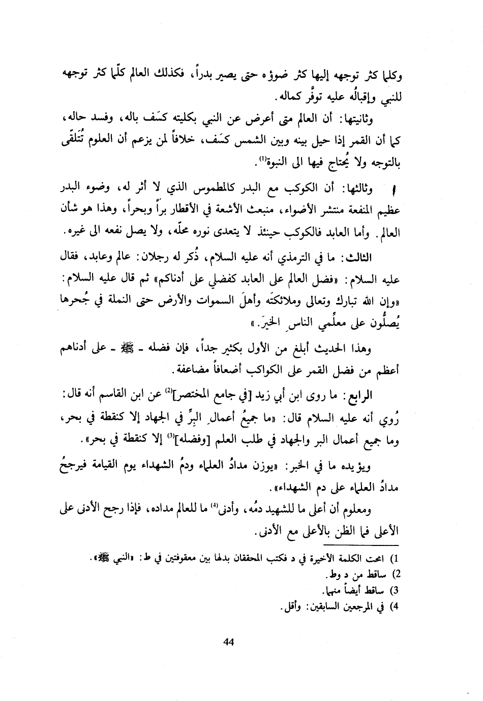 وَكلما كثر توجهه إِلَيْهَا كثر ضوؤه حَتَّى يَصِيرَ بَدْرًا فَكَذَلِكَ الْعَالِمُ كُلَّمَا كَثُرَ توجهه للنَّبِي وإقباله عَلَيْهِ توفر كَمَاله وَثَانِيهمَا أَنَّ الْعَالِمَ مَتَى أَعْرَضَ عَنِ النَّبِيِّ بِكُلِّيَّتِهِ كَسَفَ بَالُهُ وَفَسَدَ حَالُهُ كَمَا أَنَّ الْقَمَرَ إِذَا حِيلَ بَيْنَهُ وَبَيْنَ الشَّمْسِ كَسَفَ خِلَافًا لِمَنْ يَزْعُمُ أَنَّ الْعُلُومَ تُتَلَقَّى بِالتَّوَجُّهِ وَلَا يحْتَاج فِيهَا إِلَى النُّبُوَّة وثالثهما أَنَّ الْكَوْكَبَ مَعَ الْبَدْرِ كَالْمَطْمُوسِ الَّذِي لَا أَثَرَ لَهُ وَضَوْءُ الْبَدْرِ عَظِيمُ الْمَنْفَعَةِ مُنْتَشِرُ الْأَضْوَاءِ مُنْبَعِثُ الْأَشِعَّةِ فِي الْأَقْطَارِ بَرًّا وَبَحْرًا وَهَذَا هُوَ شَأْنُ الْعَالِمِ وَأَمَّا الْعَابِدُ فَالْكَوْكَبُ حِينَئِذٍ لَا يَتَعَدَّى نُورُهُ مَحَلَّهُ وَلَا يَصِلُ نَفْعُهُ إِلَى غَيْرِهِ الثَّالِثُ مَا فِي التِّرْمِذِيِّ أَنَّهُ عَلَيْهِ السَّلَامُ ذُكِرَ لَهُ رَجُلَانِ عَالِمٌ وَعَابِدٌ فَقَالَ عَلَيْهِ السَّلَامُ