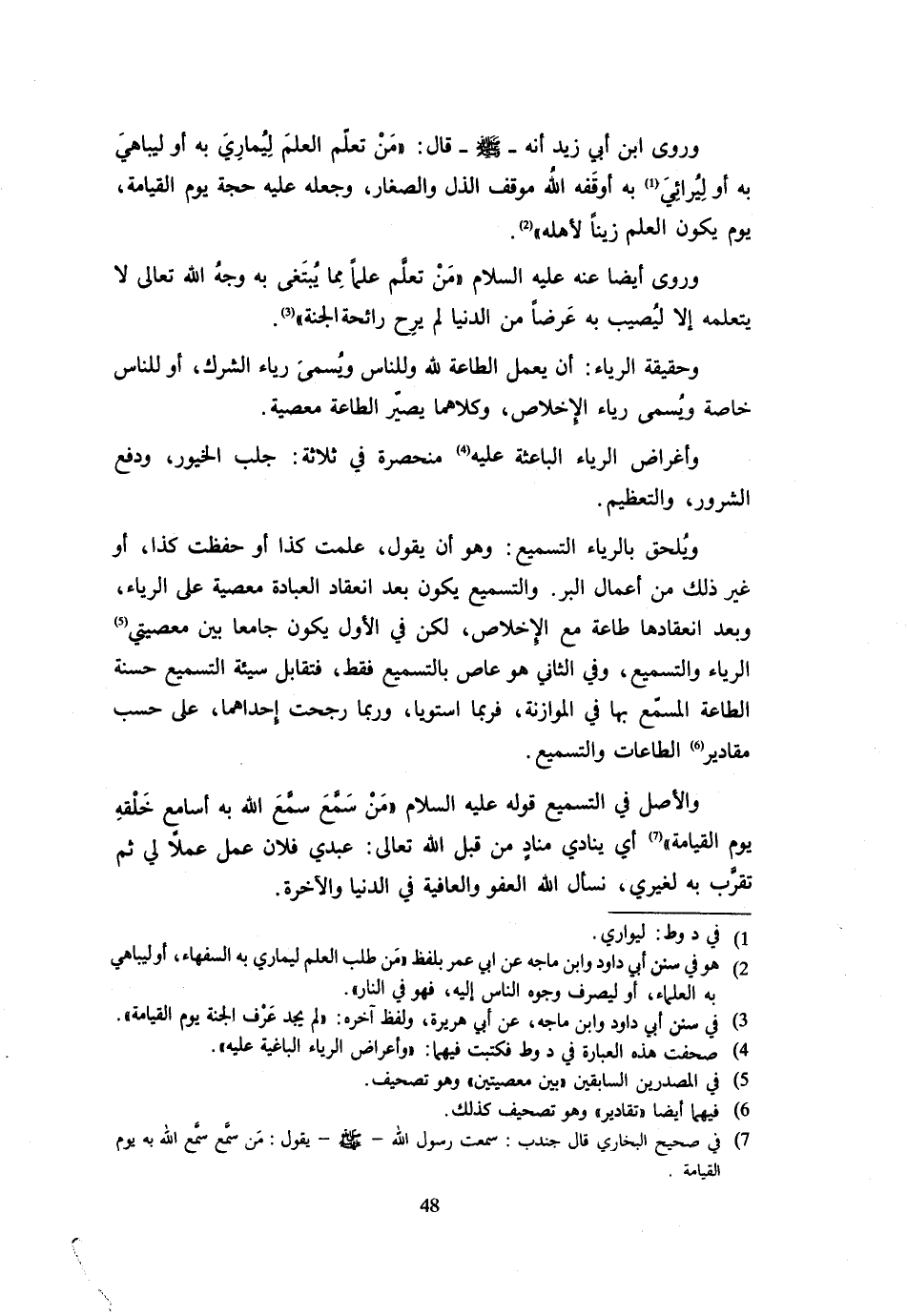 مَنْ تَعَلَّمَ عِلْمًا مِمَّا يُبْتَغَى بِهِ وَجْهُ اللَّهِ تَعَالَى لَا يَتَعَلَّمُهُ إِلَّا لِيُصِيبَ بِهِ عَرَضًا مِنَ الدُّنْيَا لَمْ يَُرَحْ رَائِحَةَ الْجَنَّةِ وَحَقِيقَةُ الرِّيَاءِ أَنْ يَعْمَلَ الطَّاعَةَ لِلَّهِ وَلِلنَّاسِ وَيُسَمَّى رِيَاءَ الشِّرْكِ أَوْ لِلنَّاسِ خَاصَّةً وَيُسَمَّى رِيَاءَ الْإِخْلَاصِ وَكِلَاهُمَا يُصَيِّرُ الطَّاعَةَ مَعْصِيَةً وَأَغْرَاضُ الرِّيَاءِ الْبَاعِثَةِ عَلَيْهِ مُنْحَصِرَةٌ فِي ثَلَاثَةٍ جَلْبِ الْخُيُورِ وَدَفْعِ الشُّرُورِ وَالتَّعْظِيمِ وَيَلْحَقُ بِالرِّيَاءِ التَّسْمِيعُ وَهُوَ أَنْ يَقُولَ عَلِمْتُ كَذَا أَوْ حَفِظْتُ كَذَا أَوْ غَيْرَ ذَلِكَ مِنْ أَعْمَالِ الْبِرِّ وَالتَّسْمِيعُ يَكُونُ بَعْدَ انْعِقَادِ الْعِبَادَةِ مَعْصِيَةً عَلَى الرِّيَاءِ وَبَعْدَ انْعِقَادِهَا طَاعَةً مَعَ الْإِخْلَاصِ لَكِنَّ فِي الْأَوَّلِ يَكُونُ جَامِعًا بَيْنَ مَعْصِيَتَيِ الرِّيَاءِ وَالتَّسْمِيعِ وَفِي الثَّانِي هُوَ عَاصٍ بِالتَّسْمِيعِ فَقَطْ فَتُقَابِلُ سَيِّئَةُ التَّسْمِيعِ حَسَنَةَ الطَّاعَةِ الْمُسَمَّعِ بِهَا فِي الْمُوَازَنَةِ فَرُبَّمَا اسْتَوَيَا وَرُبَّمَا رَجَحَتْ إِحْدَاهُمَا عَلَى حَسَبِ مَقَادِيرِ الطَّاعَاتِ والتسميع وَالْأَصْل فِي التسميع قَول عَلَيْهِ السَّلَامُ مَنْ سَمَّعَ سَمَّعَ اللَّهُ بِهِ أَسَامِعَ خَلْقِهِ يَوْمَ الْقِيَامَةِ