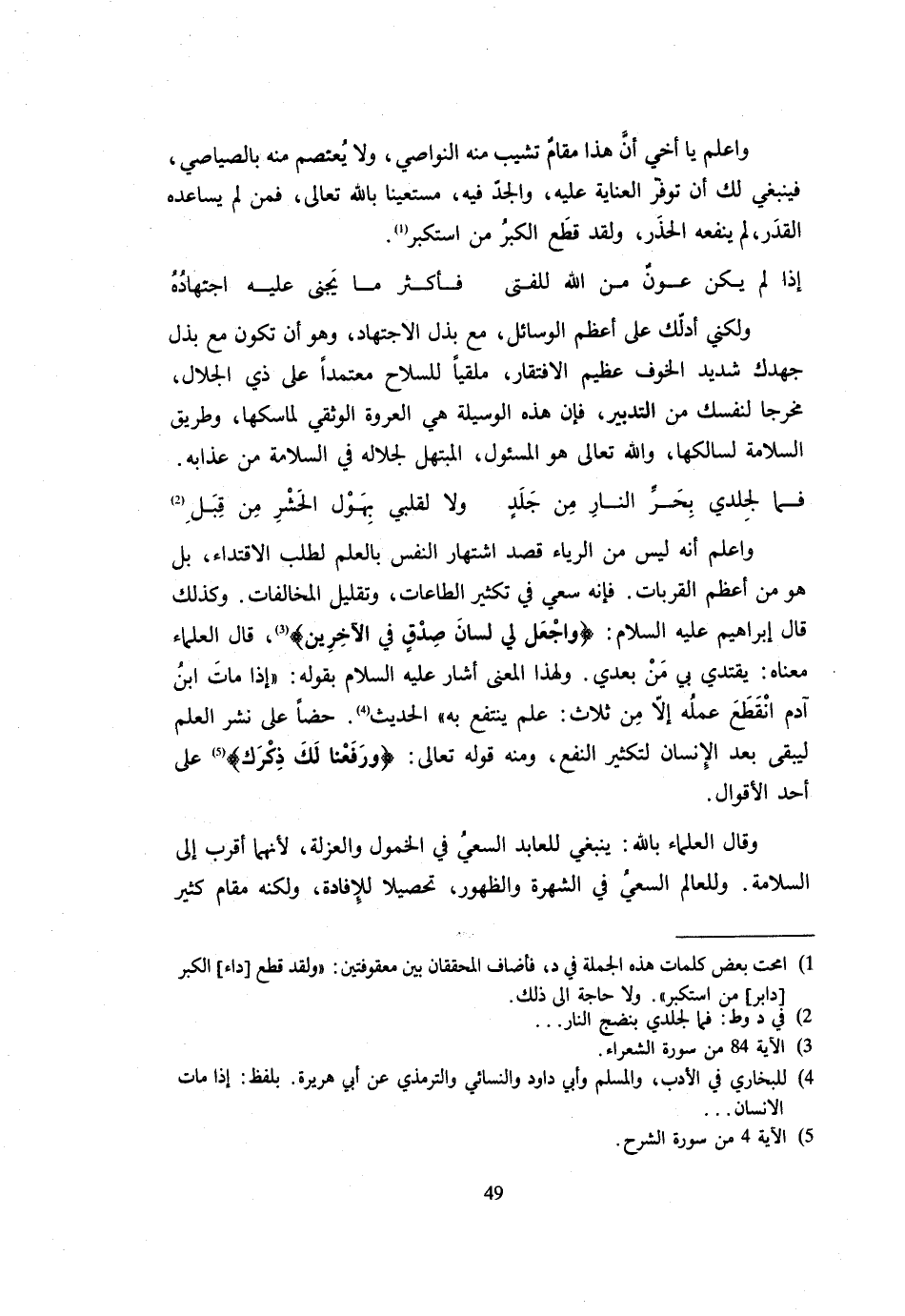 وَاعْلَمْ يَا أَخِي أَنَّ هَذَا مَقَامٌ تَشِيبُ مِنْهُ النَّوَاصِي وَلَا يُعْتَصَمُ مِنْهُ بِالصَّيَاصِي فَيَنْبَغِي لَكَ أَنْ تُوَفِّرَ الْعِنَايَةَ عَلَيْهِ وَالْجِدَّ فِيهِ مُسْتَعِينًا بِاللَّهِ تَعَالَى فَمَنْ لَمْ يُسَاعِدْهُ الْقَدَرُ وَلم يَنْفَعهُ الحذر وَلَقَد قطع الْكِبْرِ مَنِ اسْتَكْبَرَ