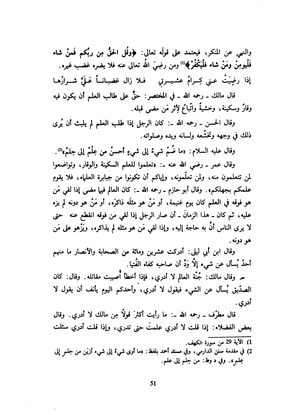 قَالَ مَالِكٌ رَحِمَهُ اللَّهُ فِي الْمُخْتَصَرِ حَقٌّ عَلَى طَالِبِ الْعِلْمِ أَنْ يَكُونَ فِيهِ وَقَارٌ وَسَكِينَةٌ وَخَشْيَةٌ وَاتِّبَاعٌ لِأَثَرِ مَنْ مَضَى قَبْلَهُ. وَقَالَ الْحَسَنُ رَحِمَهُ اللَّهُ كَانَ الرَّجُلُ إِذَا طَلَبَ الْعِلْمَ لَمْ يَلْبَثْ أَنْ يُرَى ذَلِكَ فِي وَجْهِهِ وَتَخَشُّعِهِ وَلِسَانِهِ وَيَدِهِ وَصَلَوَاتِهِ وَقَالَ عَلَيْهِ السَّلَامُ مَا ضُمَّ شَيْءٌ إِلَى شَيْءٍ أَحْسَنُ مِنْ علم إِلَى حلم وَقَالَ عُمَرُ رَضِيَ اللَّهُ عَنْهُ تَعَلَّمُوا لِلْعِلْمِ السَّكِينَةَ وَالْوَقَارَ وَتَوَاضَعُوا لِمَنْ تَتَعَلَّمُونَ مِنْهُ وَلِمَنْ تُعَلِّمُونَهُ وَإِيَّاكُمْ أَنْ تَكُونُوا مِنْ جَبَابِرَةِ الْعُلَمَاءِ فَلَا يَقُومُ عِلْمُكُمْ بِجَهْلِكُمْ وَقَالَ أَبُو حَازِمٍ رَحِمَهُ اللَّهُ كَانَ الْعَالِمُ فِيمَا مَضَى إِذَا لَقِيَ مَنْ هُوَ فَوْقَهُ فِي الْعِلْمِ كَانَ يَوْمَ غَنِيمَةٍ أَوْ مَنْ هُوَ مِثْلُهُ ذَاكَرَهُ أَوْ مَنْ هُوَ دُونَهُ لَمْ يَزْهُ عَلَيْهِ ثُمَّ كَانَ هَذَا الزَّمَانُ أَنْ صَارَ الرَّجُلُ إِذَا لَقِيَ مَنْ فَوْقَهُ انْقَطَعَ عَنْهُ حَتَّى لَا يَرَى النَّاسُ أَنَّ بِهِ حَاجَةً إِلَيْهِ وَإِذَا لَقِيَ مَنْ هُوَ مِثْلُهُ لَمْ يُذَاكِرْهُ وَيَزْهُو عَلَى مَنْ هُوَ دُونَهُ وَقَالَ ابْنُ أَبِي لَيْلَى أَدْرَكْتُ عِشْرِينَ وَمِائَةً مِنَ الصَّحَابَةِ وَالْأَنْصَارِ مَا مِنْهُمْ أَحَدٌ يُسْأَلُ عَنْ شَيْءٍ إِلَّا وَدَّ أَنَّ صَاحِبَهُ كَفَاهُ الْفُتْيَا وَقَالَ مَالِكٌ جُنَّةُ الْعَالِمِ لَا أَدْرِي فَإِذَا أَخْطَأَ أُصِيبَتْ مَقَاتِلُهُ وَقَالَ كَانَ الصِّدِّيقُ يُسْأَلُ عَنِ الشَّيْءِ فَيَقُولُ لَا أَدْرِي وَأَحَدُكُمُ الْيَوْمَ يَأْنَفُ أَنْ يَقُولَ لَا أَدْرِي قَالَ مُطَرِّفٌ رَحِمَهُ اللَّهُ مَا رَأَيْتُ أَكْثَرَ قَوْلًا مِنْ مَالِكٍ لَا أَدْرِي وَقَالَ بَعْضُ الْفُضَلَاءِ إِذَا قُلْتَ لَا أَدْرِي عَلِمْتَ حَتَّى تَدْرِيَ وَإِذَا قُلْتَ أَدْرِي سُئِلت