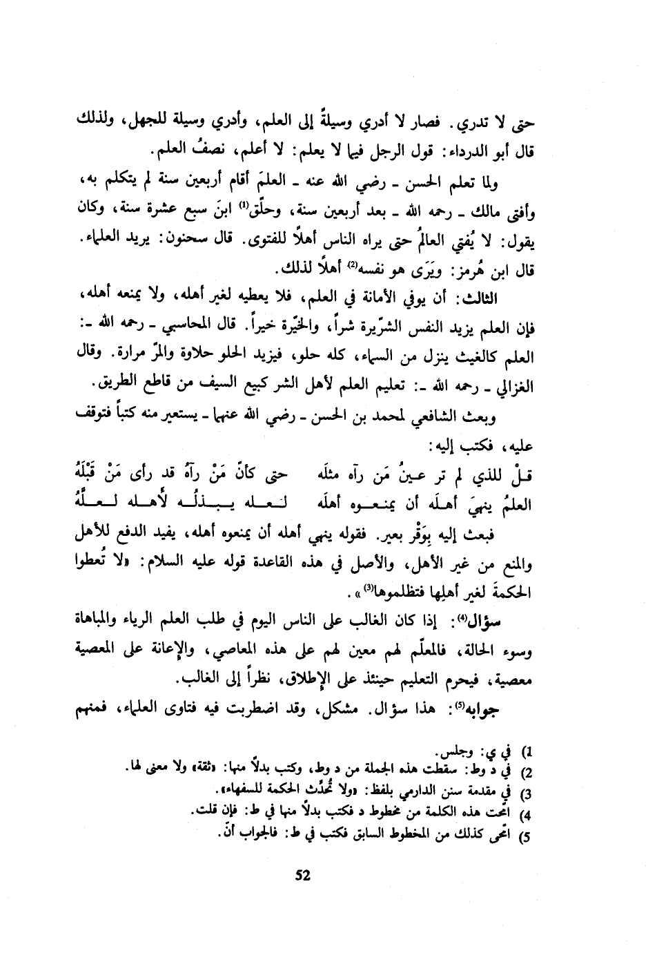 حَتَّى لَا تَدْرِيَ فَصَارَ لَا أَدْرِي وَسِيلَةً إِلَى الْعِلْمِ وَأَدْرِي وَسِيلَةً لِلْجَهْلِ وَلِذَلِكَ قَالَ أَبُو الدَّرْدَاءِ قَوْلُ الرَّجُلِ فِيمَا لَا يَعْلَمُ لَا أَعْلَمُ نِصْفُ الْعِلْمِ وَلَمَّا تَعَلَّمَ الْحَسَنُ رَضِيَ اللَّهُ عَنْهُ الْعِلْمَ أَقَامَ أَرْبَعِينَ سَنَةً لَمْ يَتَكَلَّمْ بِهِ وَأَفْتَى مَالِكٌ رَحِمَهُ اللَّهُ بَعْدَ أَرْبَعِينَ سَنَةً وَحَلَّقَ ابْنَ سَبْعَ عَشْرَةَ سَنَةً وَكَانَ يَقُولُ لَا يُفْتِي الْعَالِمُ حَتَّى يَرَاهُ النَّاسُ أَهْلًا لِلْفَتْوَى قَالَ سَحْنُونٌ يُرِيدُ الْعُلَمَاءَ قَالَ ابْنُ هُرْمُزَ وَيَرَى هُوَ نَفْسَهُ أَهْلًا لِذَلِكَ الثَّالِثُ أَنْ يُوَفِّيَ الْأَمَانَةَ فِي الْعِلْمِ فَلَا يُعْطِيَهِ لِغَيْرِ أَهْلِهِ وَلَا يَمْنَعَهُ أَهْلِهُ فَإِنَّ الْعِلْمَ يَزِيدُ النَّفْسَ الشِّرِّيرَةَ شَرًّا وَالْخَيِّرَةَ خَيْرًا قَالَ الْمُحَاسَبِيُّ رَحِمَهُ اللَّهُ الْعِلْمُ كالغيث ينزل من السَّمَاء كُله حُلْو يزِيد الحلو حلاوة والمر مرَارَة وَقَالَ الْغَزالِيّ رَحمَه الله تَعْلِيمُ الْعِلْمِ لِأَهْلِ الشَّرِّ كَبَيْعِ السَّيْفِ مِنْ قَاطِعِ الطَّرِيقِ وَبَعَثَ الشَّافِعِيُّ لِمُحَمَّدِ بْنِ الْحَسَنِ رَضِيَ اللَّهُ عَنْهُمَا يَسْتَعِيرُ مِنْهُ كُتُبًا فَتَوَقَّفَ عَلَيْهِ فَكَتَبَ إِلَيْهِ