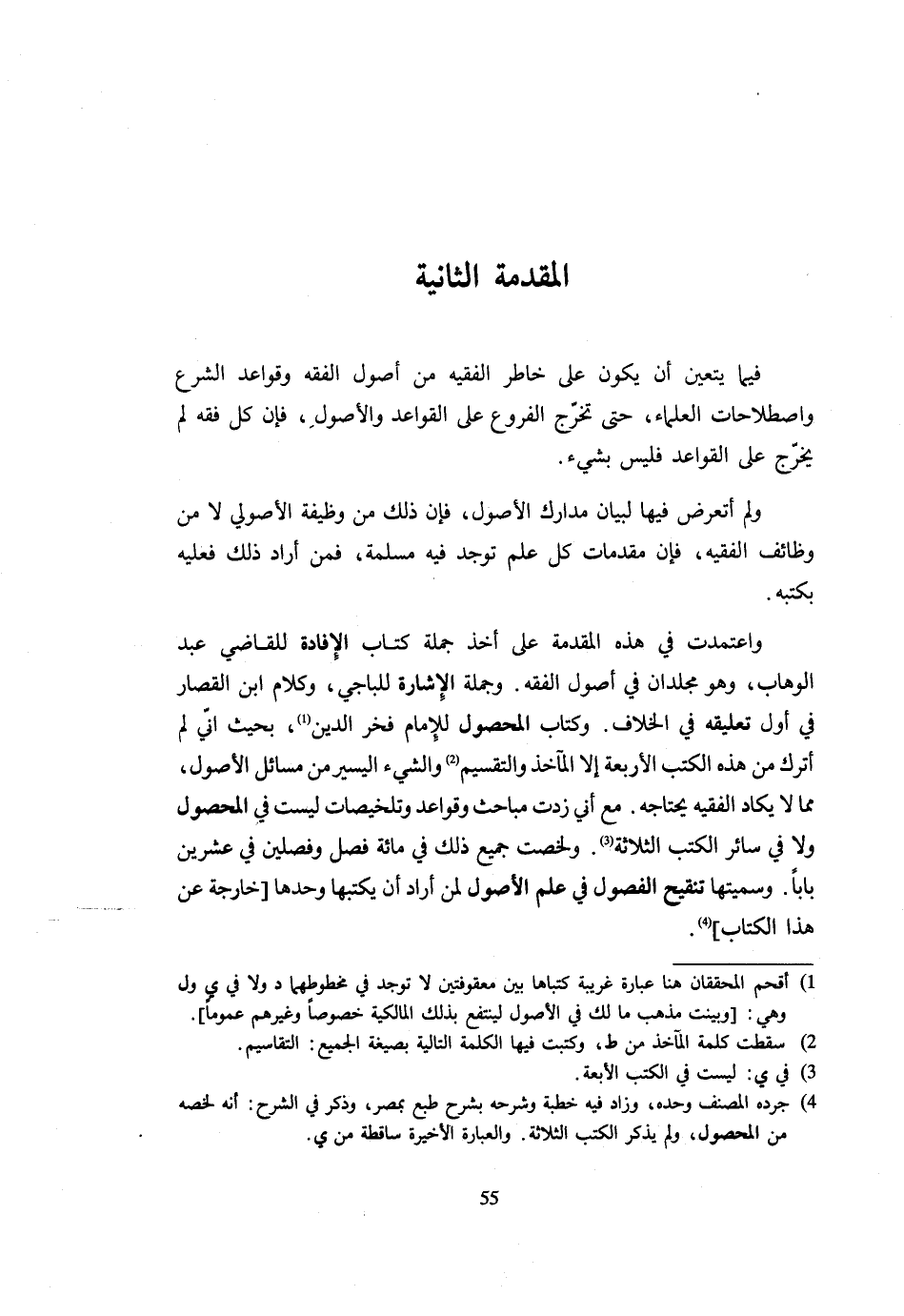فِيمَا يتَعَيَّن أَن يكون على خاطر الْفَقِيه مِنْ أُصُولِ الْفِقْهِ وَقَوَاعِدِ الشَّرْعِ وَاصْطِلَاحَاتِ الْعُلَمَاءِ حَتَّى تُخَرَّجَ الْفُرُوعُ عَلَى الْقَوَاعِدِ وَالْأُصُولِ فَإِنَّ كُلَّ فِقْهٍ لَمْ يُخَرَّجْ عَلَى الْقَوَاعِدِ فَلَيْسَ بِشَيْءٍ وَلَمْ أَتَعَرَّضْ فِيهَا لِبَيَانِ مَدَارِكِ الْأُصُولِ فَإِنَّ ذَلِكَ مِنْ وَظِيفَةِ الْأُصُولِيِّ لَا مِنْ وَظَائِفِ الْفَقِيهِ فَإِنَّ مُقَدِّمَاتِ كُلِّ عِلْمٍ تُوجَدُ فِيهِ مُسَلَّمَةً فَمَنْ أَرَادَ ذَلِكَ فَعَلَيْهِ بِكُتُبِهِ وَاعْتَمَدْتُ فِي هَذِهِ الْمُقَدِّمَةِ عَلَى أَخْذِ جُمْلَةِ كِتَابِ الْإِفَادَةِ لِلْقَاضِي عَبْدِ الْوَهَّابِ وَهُوَ مُجَلَّدَانِ فِي أُصُولِ الْفِقْهِ وَجُمْلَةِ الْإِشَارَةِ لِلْبَاجِيِّ وَكَلَامِ ابْنِ الْقَصَّارِ فِي أَوَّلِ تَعْلِيقِهِ فِي الْخِلَافِ وَكتاب الْمَحْصُول للْإِمَام فَخر الدّين بِحَيْثُ أَنِّي لم أَتْرُكْ مِنْ هَذِهِ الْكُتُبِ الْأَرْبَعَةِ إِلَّا الْمَآخِذَ والتقسيم وَالشَّيْءَ الْيَسِيرَ مِنْ مَسَائِلِ الْأُصُولِ مِمَّا لَا يَكَادُ الْفَقِيهُ يَحْتَاجُهُ مَعَ أَنِّي زِدْتُ مَبَاحِثَ وَقَوَاعِدَ وَتَلْخِيصَاتٍ لَيْسَتْ فِي الْمَحْصُولِ وَلَا فِي سَائِرِ الْكُتُبِ الثَّلَاثَةِ وَلَخَّصْتُ جَمِيعَ ذَلِكَ فِي مِائَةِ فَصْلٍ وَفَصْلَيْنِ فِي عِشْرِينَ بَابًا وَسَمَّيْتُهَا تَنْقِيحَ الْفُصُولِ فِي عِلْمِ الْأُصُولِ لِمَنْ أَرَادَ أَنَّ يَكْتُبَهَا وَحْدَهَا خَارِجَةً عَنْ هَذَا الْكِتَابِ