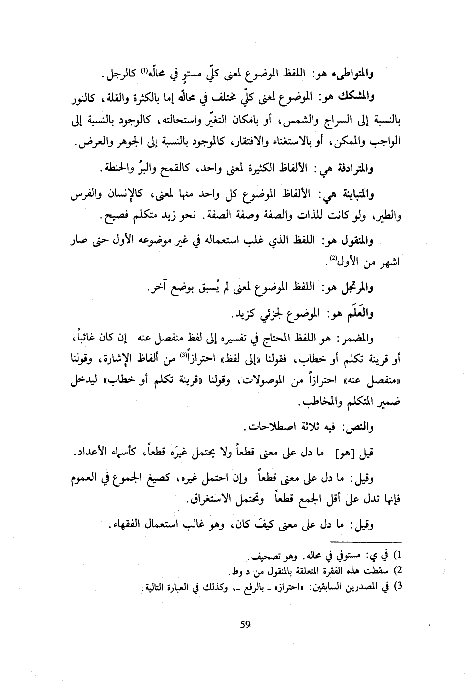 والمتواطئ هُوَ اللَّفْظ الْمَوْضُوع لِمَعْنى كلي مستو فِي محاله كَالرّجلِ والمشكك هُوَ الْموضع لِمَعْنًى كُلِّيٍّ مُخْتَلَفٍ فِي مَحَالِّهِ إِمَّا بِالْكَثْرَةِ وَالْقِلَّةِ كَالنُّورِ بِالنِّسْبَةِ إِلَى السِّرَاجِ وَالشَّمْسِ أَوْ بِإِمْكَانِ التَّغَيُّرِ وَاسْتِحَالَتِهِ كَالْوُجُودِ بِالنِّسْبَةِ إِلَى الْوَاجِبِ وَالْمُمْكِنِ أَوْ بِالِاسْتِغْنَاءِ وَالِافْتِقَارِ كَالْمَوْجُودِ بِالنِّسْبَةِ إِلَى الْجَوْهَرِ وَالْعَرَضِ وَالْمُتَرَادِفَةُ هِيَ الْأَلْفَاظُ الْكَثِيرَةُ لِمَعْنًى وَاحِد كالقمح وَالْبر وَالْحِنْطَة والمتباينة هِيَ الْأَلْفَاظ الْمَوْضُوع لكل وَاحِدٍ مِنْهَا لِمَعْنًى كَالْإِنْسَانِ وَالْفَرَسِ وَالطَّيْرِ وَلَوْ كَانَتْ لِلذَّاتِ وَالصِّفَةِ وَصِفَةِ الصِّفَةِ نَحْوَ زَيْدٌ مُتَكَلِّمٌ فَصِيحٌ وَالْمَنْقُولُ هُوَ اللَّفْظُ الَّذِي غَلَبَ اسْتِعْمَالُهُ فِي غَيْرِ مَوْضُوعِهِ الْأَوَّلِ حَتَّى صَارَ أَشْهَرَ مِنَ الْأَوَّلِ وَالْمُرْتَجَلُ هُوَ اللَّفْظُ الْمَوْضُوعُ لِمَعْنًى لَمْ يُسْبَقْ بِوَضْعٍ آخَرَ وَالْعَلَمُ هُوَ الْمَوْضُوعُ لِجُزْئِيٍّ كَزَيْدٍ وَالْمُضْمَرُ هُوَ اللَّفْظُ الْمُحْتَاجُ فِي تَفْسِيرِهِ إِلَى لَفْظٍ مُنْفَصِلٍ عَنْهُ إِنْ كَانَ غَائِبًا أَوْ قَرِينَةِ تَكَلُّمٍ أَوْ خِطَابٍ فَقَوْلُنَا إِلَى لَفْظٍ احْتِرَازًا مِنْ أَلْفَاظِ الْإِشَارَةِ وَقَوْلِنَا مُنْفَصِلٍ عَنْهُ احْتِرَازًا مِنَ الْمَوْصُولَاتِ وَقَوْلُنَا قَرِينَةِ تَكَلُّمٍ أَوْ خِطَابٍ لِيَدْخُلَ ضَمِيرُ الْمُتَكَلِّمِ الْمُخَاطب وَالنَّص فِيهِ ثَلَاثَة اصْطِلَاحَات قيل هُوَ مَا دَلَّ عَلَى مَعْنًى قَطْعًا وَلَا يَحْتَمِلُ غَيْرَهُ قَطْعًا كَأَسْمَاءِ الْأَعْدَادِ وَقِيلَ مَا دَلَّ عَلَى مَعْنًى قَطْعًا وَإِنِ احْتَمَلَ غَيْرَهُ كَصِيَغِ الْجُمُوعِ فِي الْعُمُومِ فَإِنَّهَا تَدُلُّ عَلَى أَقَلِّ الْجَمْعِ قَطْعًا وَتَحْتَمِلُ الِاسْتِغْرَاقَ وَقِيلَ مَا دَلَّ عَلَى مَعْنًى كَيْفَ كَانَ وَهُوَ غَالِبُ اسْتِعْمَالِ الْفُقَهَاء