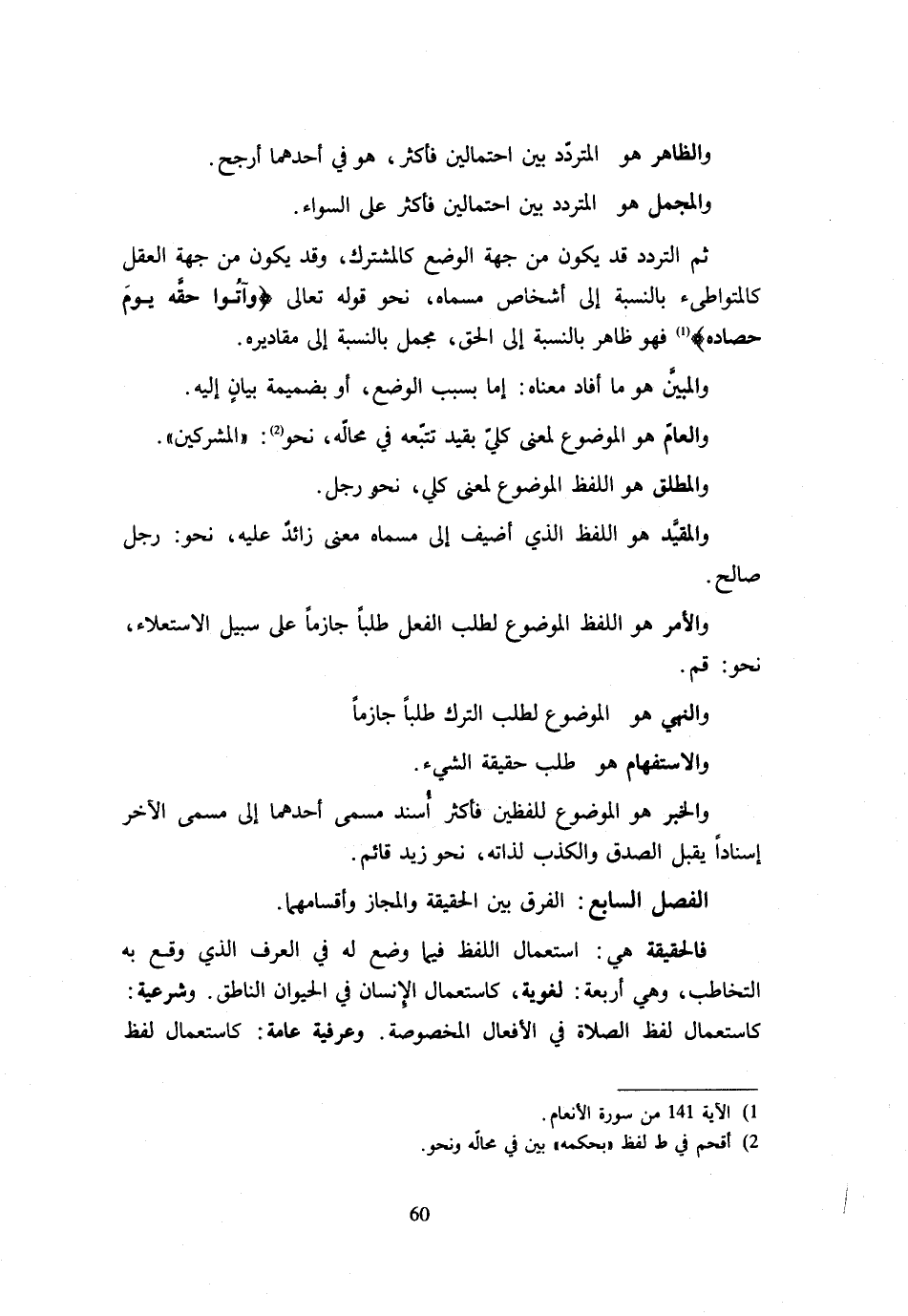 الْفَصْلُ السَّابِعُ الْفرق بَين الْحَقِيقَة وَالْمجَاز وَأَقْسَامِهِمَا