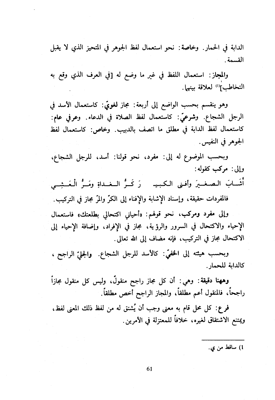 الدَّابَّةِ فِي الْحِمَارِ وَخَاصَّةً نَحْوَ اسْتِعْمَالِ لَفْظِ الْجَوْهَرِ فِي الْمُتَحَيِّزِ الَّذِي لَا يَقْبَلُ الْقِسْمَةَ وَالْمَجَازُ اسْتِعْمَالُ اللَّفْظِ فِي غَيْرِ مَا وُضِعَ لَهُ فِي الْعُرْفِ الَّذِي وَقَعَ بِهِ التَّخَاطُبُ لِعَلَاقَةٍ بَيْنَهُمَا وَهُوَ يَنْقَسِمُ بِحَسَبِ الْوَاضِعِ إِلَى أَرْبَعَة حجاز لُغَوِيٍّ كَاسْتِعْمَالِ الْأَسَدِ فِي الرَّجُلِ الشُّجَاعِ وَشَرْعِيٍّ كَاسْتِعْمَالِ لَفْظِ الصَّلَاةِ فِي الدُّعَاءِ وَعُرْفِيٍّ عَامٍّ كَاسْتِعْمَالِ لَفْظِ الدَّابَّةِ فِي مُطْلَقِ مَا اتَّصَفَ بِالدَّبِيبِ وَخَاصٍّ كَاسْتِعْمَالِ لَفْظِ الْجَوْهَرِ فِي النَّفِيسِ وَبِحَسَبِ الْمَوْضُوعِ لَهُ إِلَى مُفْرَدٍ نَحْوَ قَوْلِنَا أَسَدٌ لِلرَّجُلِ الشُّجَاعِ وَإِلَى مُرَكَّبٍ كَقَوْلِهِ