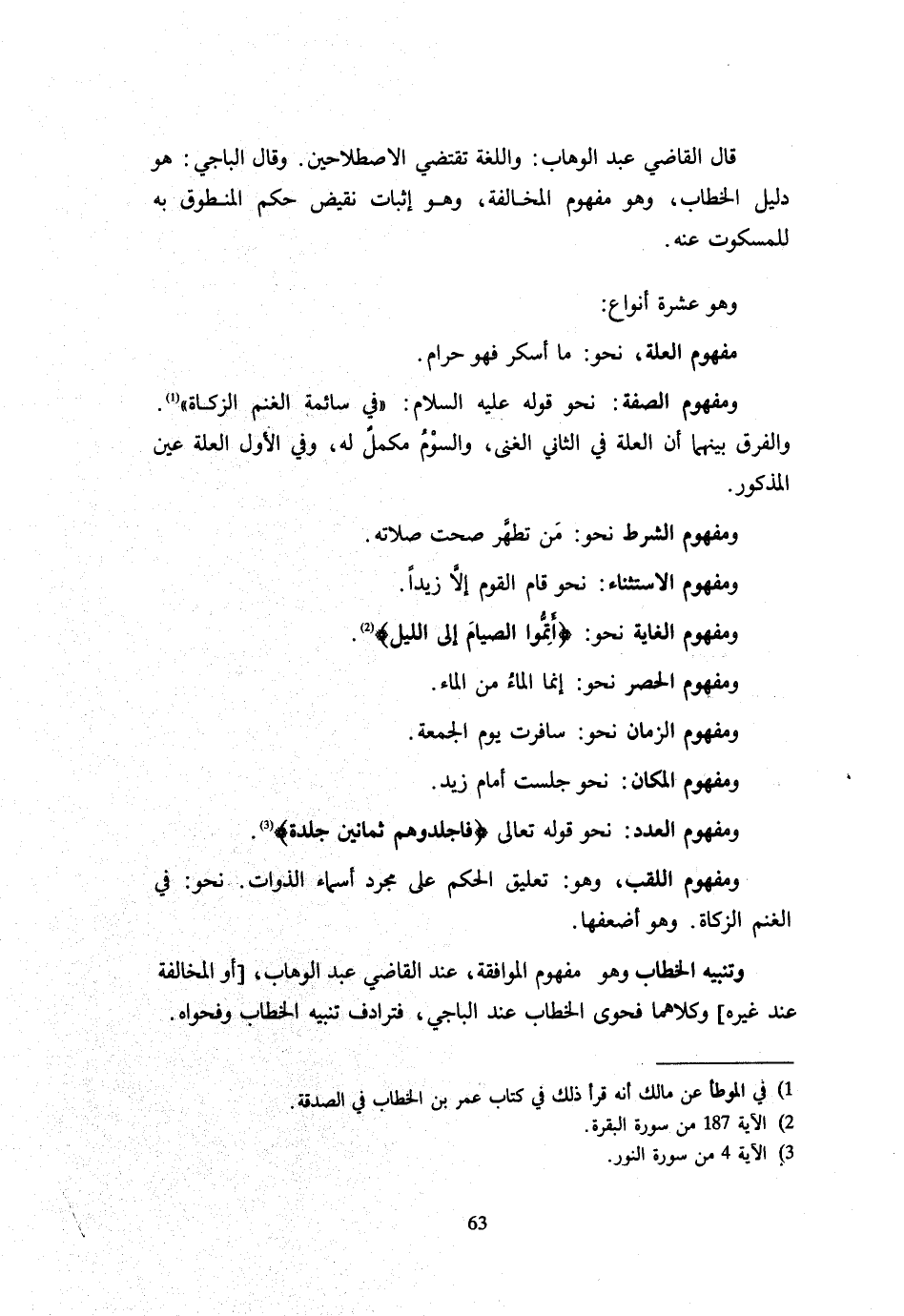 قَالَ الْقَاضِي عَبْدُ الْوَهَّابِ وَاللُّغَةُ تَقْتَضِي الِاصْطِلَاحَيْنِ وَقَالَ الْبَاجِيُّ هُوَ دَلِيلُ الْخِطَابِ وَهُوَ مَفْهُومُ الْمُخَالَفَةِ وَهُوَ إِثْبَاتُ نَقِيضِ حُكْمِ الْمَنْطُوقِ بِهِ لِلْمَسْكُوتِ عَنْهُ وَهُوَ عَشَرَةُ أَنْوَاعٍ مَفْهُومُ الْعِلَّةِ نَحْوَ مَا أَسْكَرَ فَهُوَ حَرَامٌ وَمَفْهُومُ الصِّفَةِ نَحْوَ قَوْلِهِ عَلَيْهِ السَّلَامُ