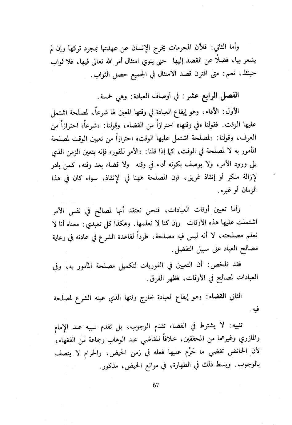 الْأَوَّلُ الْأَدَاءُ وَهُوَ إِيقَاعُ الْعِبَادَةِ فِي وَقْتِهَا الْمُعَيَّنِ لَهَا شَرْعًا لِمَصْلَحَةٍ اشْتَمَلَ عَلَيْهَا الْوَقْتُ فَقَوْلُنَا فِي وَقْتِهَا احْتِرَازًا مِنَ الْقَضَاءِ وَقَوْلُنَا شَرْعًا احْتِرَازًا مِنَ الْعُرْفِ وَقَوْلُنَا لِمَصْلَحَةٍ اشْتَمَلَ عَلَيْهَا الْوَقْتُ احْتِرَازًا مِنْ تَعْيِينِ الْوَقْتِ لِمَصْلَحَةِ الْمَأْمُورِ بِهِ لَا لِمَصْلَحَةٍ فِي الْوَقْتِ كَمَا إِذَا قُلْنَا الْأَمْرُ لِلْفَوْرِ فَإِنَّهُ يَتَعَيَّنُ الزَّمَنُ الَّذِي يَلِي وُرُودَ الْأَمْرِ وَلَا يُوصَفُ بِكَوْنِهِ أَدَاءً فِي وَقْتِهِ وَلَا قَضَاءً بعد وقته كمن بَادَرَ لِإِزَالَةِ مُنْكَرٍ أَوْ إِنْقَاذِ غَرِيقٍ فَإِنَّ الْمصلحَة هَهُنَا فِي الْإِنْقَاذِ سَوَاءٌ كَانَ فِي هَذَا الزَّمَانِ أَوْ غَيْرِهِ وَأَمَّا تَعْيِينُ أَوْقَاتِ الْعِبَادَاتِ فَنَحْنُ نَعْتَقِدُ أَنَّهَا لِمَصَالِحَ فِي نَفْسِ الْأَمْرِ اشْتَمَلَتْ عَلَيْهَا هَذِهِ الْأَوْقَاتُ وَإِنْ كُنَّا لَا نَعْلَمُهَا وَهَكَذَا كُلُّ تَعَبُّدِيٍّ مَعْنَاهُ أَنَّا لَا نَعْلَمُ مصلحَة لَا أَنَّهُ لَيْسَ فِيهِ مَصْلَحَةٌ طَرْدًا لِقَاعِدَةِ الشَّرْعِ فِي عَادَتِهِ فِي رِعَايَةِ مَصَالِحِ الْعِبَادِ على سَبِيل التَّفْضِيل فقد تلخص أَن التعييين فِي الْفَوْرِيَّاتِ لِتَكْمِيلِ مَصْلَحَةِ الْمَأْمُورِ بِهِ وَفِي الْعِبَادَات لمصَالح فِي الْأَوْقَاتِ فَظَهَرَ الْفَرْقُ الثَّانِي الْقَضَاءُ وَهُوَ إِيقَاعُ الْعِبَادَةِ خَارِجَ وَقْتِهَا الَّذِي عَيَّنَهُ الشَّرْعُ لِمَصْلَحَةٍ فِيهِ تَنْبِيهٌ لَا يُشْتَرَطُ فِي الْقَضَاءِ تَقَدُّمُ الْوُجُوبِ بَلْ تَقَدَّمَ سَبَبُهُ عِنْدَ الْإِمَامِ وَالْمَازِرِيِّ وَغَيْرِهِمَا مِنَ الْمُحَقِّقِينَ خِلَافًا لِلْقَاضِي عَبْدِ الْوَهَّابِ وَجَمَاعَةٍ مِنَ الْفُقَهَاءِ لِأَنَّ الْحَائِضَ تَقْضِي مَا حَرُمَ عَلَيْهَا فِعْلُهُ فِي زَمَنِ الْحَيْضِ وَالْحَرَامُ لَا يَتَّصِفُ بِالْوُجُوبِ وَبَسْطُ ذَلِكَ فِي الطَّهَارَةِ فِي مَوَانِعِ الْحَيْضِ مَذْكُورٌ