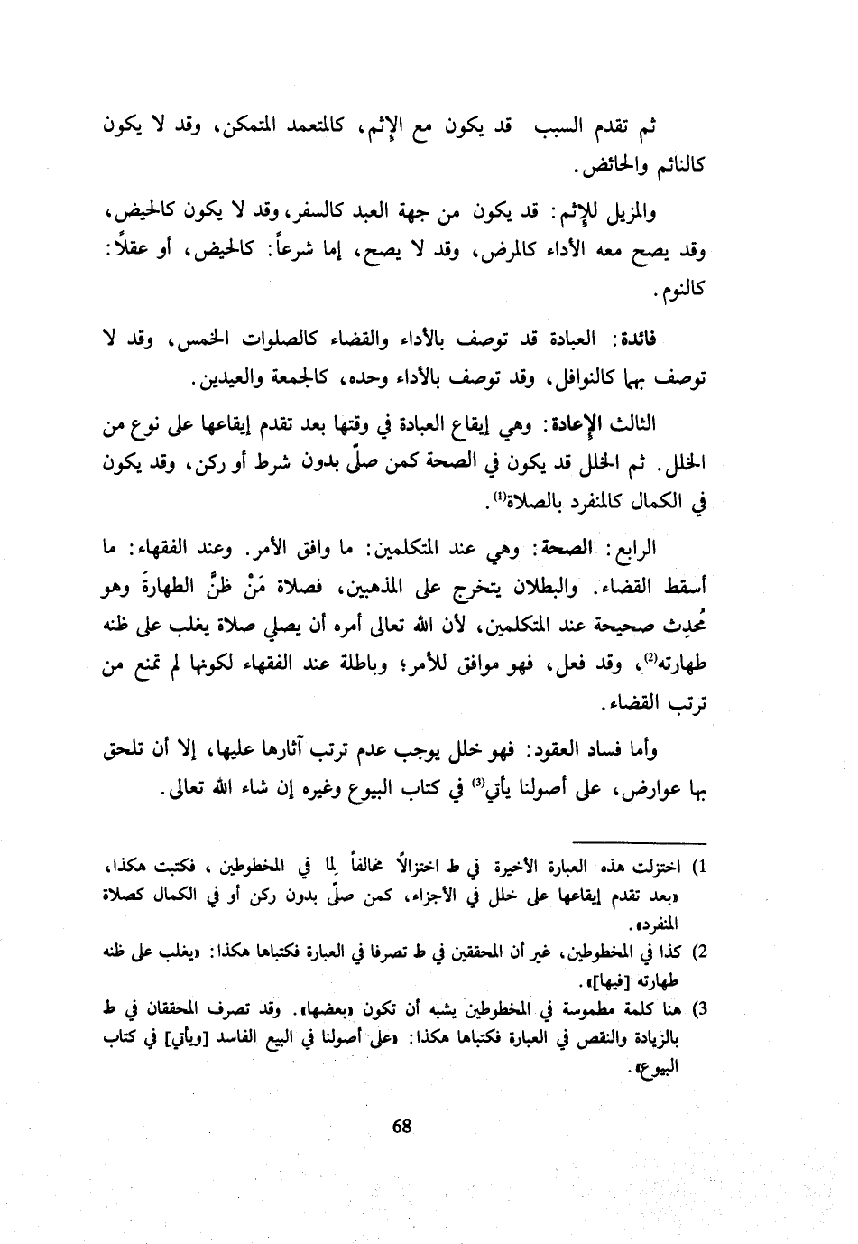 ثُمَّ تَقَدُّمُ السَّبَبِ قَدْ يَكُونُ مَعَ الْإِثْمِ كَالْمُتَعَمِّدِ الْمُتَمَكِّنِ وَقَدْ لَا يَكُونُ كَالنَّائِمِ وَالْحَائِضِ وَالْمُزِيلُ لِلْإِثْمِ قَدْ يَكُونُ مِنْ جِهَةِ الْعَبْدِ كَالسَّفَرِ وَقَدْ لَا يَكُونُ كَالْحَيْضِ وَقَدْ يَصِحُّ مَعَهُ الْأَدَاءُ كَالْمَرَضِ وَقَدْ لَا يَصِحُّ إِمَّا شَرْعًا كَالْحَيْضِ أَوْ عَقْلًا كَالنَّوْمِ فَائِدَةٌ الْعِبَادَةُ قَدْ تُوصَفُ بِالْأَدَاءِ وَالْقَضَاءِ كَالصَّلَوَاتِ الْخَمْسِ وَقَدْ لَا تُوصَفُ بِهِمَا كَالنَّوَافِلِ وَقَدْ تُوصَفُ بِالْأَدَاءِ وَحْدَهُ كَالْجُمُعَةِ وَالْعِيدَيْنِ الثَّالِثُ الْإِعَادَةُ وَهِيَ إِيقَاعُ الْعِبَادَةِ فِي وَقْتِهَا بَعْدَ تَقَدُّمِ إِيقَاعِهَا عَلَى نَوْعٍ مِنَ الْخَلَلِ ثُمَّ الْخَلَلُ قَدْ يَكُونُ فِي الصِّحَّةِ كَمَنْ صَلَّى بِدُونِ شَرْطٍ أَوْ رُكْنٍ وَقَدْ يَكُونُ فِي الْكَمَالِ كَالْمُنْفَرِدِ بِالصَّلَاةِ الرَّابِعُ الصِّحَّةُ وَهِيَ عِنْدَ الْمُتَكَلِّمِينَ مَا وَافَقَ الْأَمْرَ وَعِنْدَ الْفُقَهَاءِ مَا أَسْقَطَ الْقَضَاءَ وَالْبُطْلَانُ يَتَخَرَّجُ عَلَى الْمَذْهَبَيْنِ فَصَلَاةُ مَنْ ظَنَّ الطَّهَارَةَ وَهُوَ مُحْدِثٌ صَحِيحَةٌ عِنْدَ الْمُتَكَلِّمِينَ لِأَنَّ اللَّهَ تَعَالَى أَمَرَهُ أَنْ يُصَلِّيَ صَلَاةً يَغْلِبُ عَلَى ظَنِّهِ طَهَارَتُهُ وَقَدْ فَعَلَ فَهُوَ مُوَافِقٌ لِلْأَمْرِ وَبَاطِلَةٌ عِنْدَ الْفُقَهَاءِ لِكَوْنِهَا لَمْ تَمْنَعْ مِنْ تَرَتُّبِ الْقَضَاءِ وَأَمَّا فَسَادُ الْعُقُودِ فَهُوَ خَلَلٌ يُوجِبُ عَدَمَ تَرَتُّبِ آثَارِهَا عَلَيْهَا إِلَّا أَنْ تلْحق بهَا عوارض على أصولنا يَأْتِي فِي كِتَابِ الْبُيُوعِ وَغَيْرِهِ إِنْ شَاءَ اللَّهُ تَعَالَى