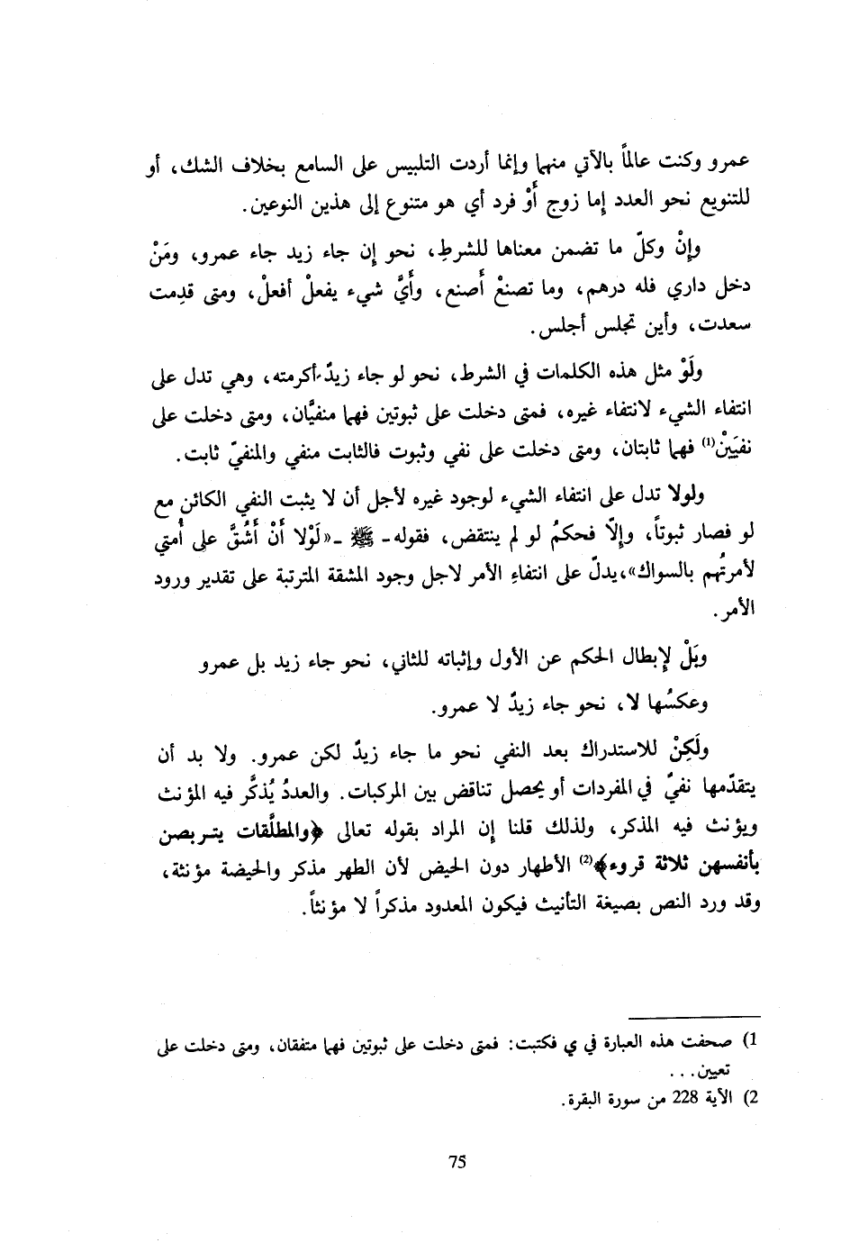 يَدُلُّ عَلَى انْتِفَاءِ الْأَمر لأجل وجود الْمَشَقَّةِ الْمُتَرَتِّبَةِ عَلَى تَقْدِيرِ وُرُودِ الْأَمْرِ وَبَلْ لِإِبْطَالِ الْحُكْمِ عَنِ الْأَوَّلِ وَإِثْبَاتِهِ لِلثَّانِي نَحْوَ جَاءَ زَيْدٌ بَلْ عَمْرٌو وَعَكْسُهَا لَا نَحْوَ زَيْدٌ لَا عَمْرٌو وَلَكِنْ لِلِاسْتِدْرَاكِ بَعْدَ النَّفْيِ نَحْوَ مَا جَاءَ زِيدٌ لَكِنْ عَمْرٌو وَلَا بُدَّ أَنْ يَتَقَدَّمَهَا نَفْيٌ فِي الْمُفْرَدَاتِ أَوْ يَحْصُلَ تَنَاقُضٌ بَيْنَ الْمُرَكَّبَاتِ وَالْعَدَدُ يُذَكَّرُ فِيهِ الْمُؤَنَّثُ وَيُؤَنَّثُ فِيهِ الْمُذَكَّرُ وَلِذَلِكَ قُلْنَا إِنَّ الْمُرَادَ بِقَوْلِهِ تَعَالَى {وَالْمُطَلَّقَاتُ يَتَرَبَّصْنَ بِأَنْفُسِهِنَّ ثَلاثَةَ قُرُوء} الْأَطْهَارُ دُونَ الْحُيَّضِ لِأَنَّ الطُّهْرَ مُذَكَّرٌ وَالْحَيْضَةَ مُؤَنَّثَةٌ وَقَدْ وَرَدَ النَّصُّ بِصِيغَةِ التَّأْنِيثِ فَيَكُونُ الْمَعْدُودُ مُذَكَّرًا لَا مُؤَنَّثًا