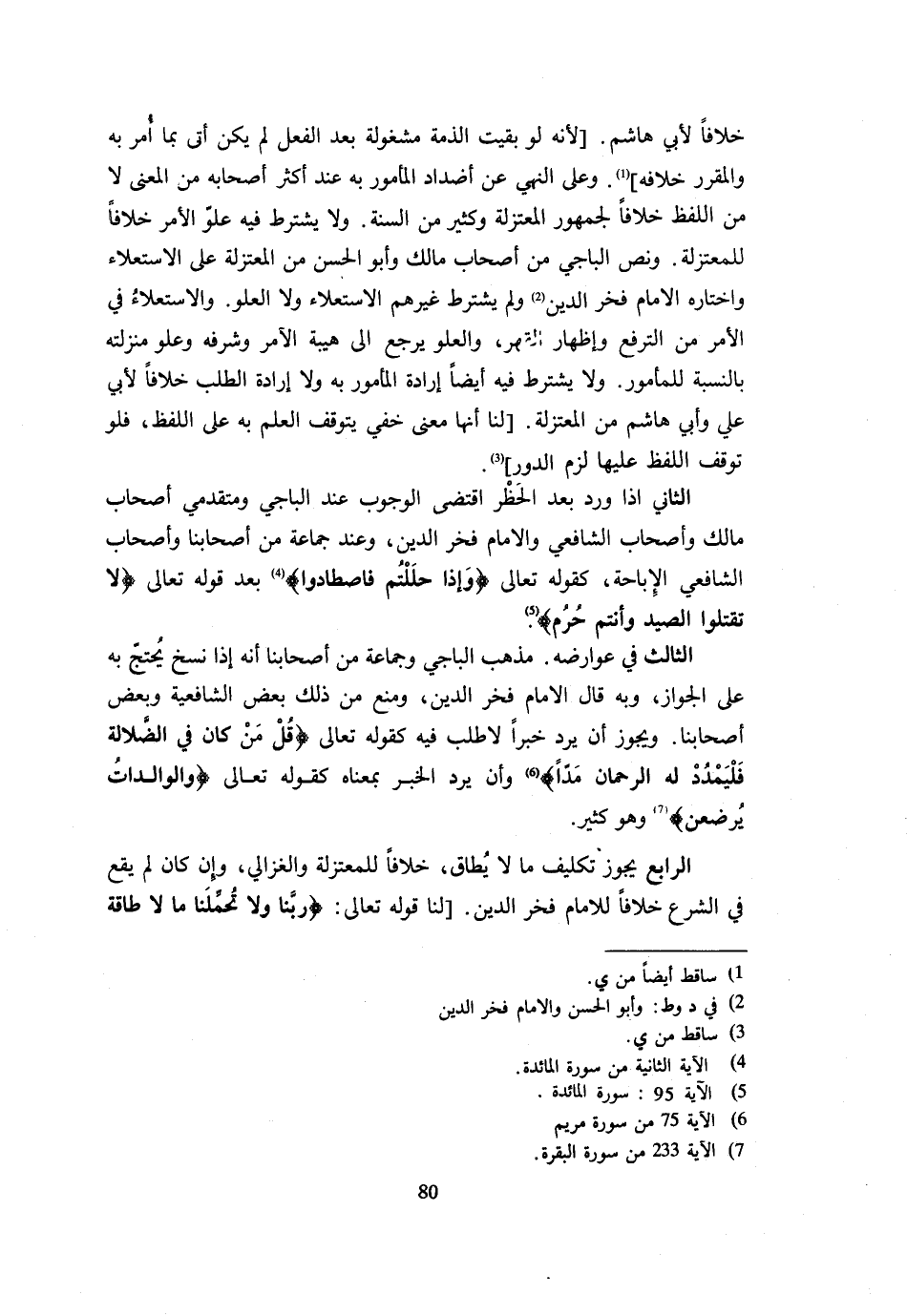 خِلَافًا لِأَبِي هَاشِمٍ لِأَنَّهُ لَوْ بَقِيَتِ الذِّمَّةُ مَشْغُولَةً بَعْدَ الْفِعْلِ لَمْ يَكُنْ أَتَى بِمَا أُمِرَ بِهِ وَالْمُقَرَّرُ خِلَافُهُ وَعَلَى النَّهْيِ عَنْ أَضْدَادِ الْمَأْمُورِ بِهِ عِنْدَ أَكْثَرِ أَصْحَابِهِ مِنَ الْمَعْنَى لَا مِنَ اللَّفْظِ خِلَافًا لِجُمْهُورِ الْمُعْتَزِلَةِ وَكثير من السُّنَّةِ وَلَا يُشْتَرَطُ فِيهِ عُلُوُّ الْآَمرِ خِلَافًا للمعتزلة وَنَصّ الْبَاجِيّ من أَصْحَاب مَالك وَأَبُو الْحسن من الْمُعْتَزلَة على الاستعلاء وَاخْتَارَهُ الامام فَخر الدّين وَلَمْ يَشْتَرِطْ غَيْرُهُمُ الِاسْتِعْلَاءَ وَلَا الْعُلُوَّ وَالِاسْتِعْلَاءُ فِي الْآَمْرِ مِنَ التَّرَفُّعِ وَإِظْهَارِ الْقَهْرِ وَالْعُلُوُّ يرجع إِلَى هَيْبَة الْآمِر وشرفه وَعُلُوِّ مَنْزِلَتِهِ بِالنِّسْبَةِ لِلْمَأْمُورِ وَلَا يُشْتَرَطُ فِيهِ أَيْضا إِرَادَةُ الْمَأْمُورِ بِهِ وَلَا إِرَادَةُ الطَّلَبِ خِلَافًا لِأَبِي عَلِيٍّ وَأَبِي هَاشِمٍ مِنَ الْمُعْتَزِلَةِ لَنَا أَنَّهَا مَعْنًى خَفِيٌّ يَتَوَقَّفُ الْعِلْمُ بِهِ عَلَى اللَّفْظِ فَلَوْ تَوَقَّفَ اللَّفْظُ عَلَيْهَا لَزِمَ الدَّوْرُ