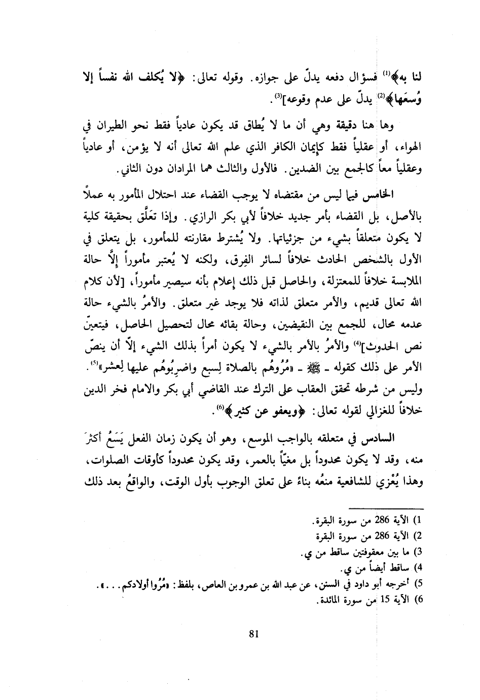 لنا بِهِ} فَسُؤَالُ دَفْعِهِ يَدُلُّ عَلَى جَوَازِهِ وَقَوْلُهُ تَعَالَى {لَا يُكَلف الله نفسا إِلَّا وسعهَا} يدل على عدم وُقُوعه وَهَا هُنَا دَقِيقَةٌ وَهِيَ أَنَّ مَا لَا يُطَاقُ قَدْ يَكُونُ عَادِيًّا فَقَطْ نَحْوَ الطَّيَرَانِ فِي الْهَوَاءِ أَوْ عَقْلِيًّا فَقَطْ كَإِيمَانِ الْكَافِرِ الَّذِي عَلِمَ اللَّهُ تَعَالَى أَنَّهُ لَا يُؤْمِنُ أَوْ عَادِيًّا وَعَقْلِيًّا مَعًا كَالْجَمْعِ بَيْنَ الضِّدَّيْنِ فَالْأَوَّلُ وَالثَّالِثُ هُمَا الْمُرَادَانِ دُونَ الثَّانِي