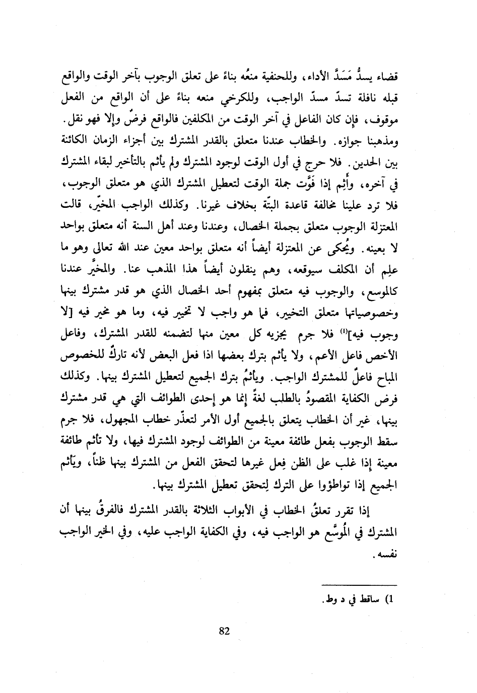 قَضَاءٌ يَسُدُّ مَسَدَّ الْأَدَاءِ وَلِلْحَنَفِيَّةِ مَنْعُهُ بِنَاءً عَلَى تَعَلُّقِ الْوُجُوبِ بِآخِرِ الْوَقْتِ وَالْوَاقِعُ قَبْلَهُ نَافِلَة تسد مَسَدَّ الْوَاجِبِ وَلِلْكَرْخِيِّ مَنْعُهُ بِنَاءً عَلَى أَنَّ الْوَاقِعَ مِنَ الْفِعْلِ مَوْقُوفٌ فَإِنْ كَانَ الْفَاعِلُ فِي آخِرِ الْوَقْتِ مِنَ الْمُكَلَّفِينَ فَالْوَاقِعُ فَرْضٌ وَإِلَّا فَهُوَ نقل وَمَذْهَبُنَا جَوَازُهُ وَالْخِطَابُ عِنْدَنَا مُتَعَلِّقٌ بِالْقَدْرِ الْمُشْتَرَكِ بَيْنَ أَجْزَاءِ الزَّمَانِ الْكَائِنَةِ بَيْنَ الْحَدَّيْنِ فَلَا حرج فِي أَوَّلِ الْوَقْتِ لِوُجُودِ الْمُشْتَرَكِ وَلَمْ يَأْثَمْ بِالتَّأْخِيرِ لبَقَاء الْمُشْتَرك فِي آخِره وأثم إِذَا فَوَّتَ جُمْلَةَ الْوَقْتِ لِتَعْطِيلِ الْمُشْتَرَكِ الَّذِي هُوَ مُتَعَلق الْوُجُوب فَلَا ترد عَلَيْنَا مُخَالَفَةُ قَاعِدَةٍ ألْبَتَّةَ بِخِلَافِ غَيْرِنَا وَكَذَلِكَ الْوَاجِبُ الْمُخَيَّرُ قَالَتِ الْمُعْتَزِلَةُ الْوُجُوبُ مُتَعَلِّقٌ بِجُمْلَةِ الْخِصَال وَعِنْدنَا وَعند أهل السّنة أَنه مُتَعَلِّقٌ بِوَاحِدٍ لَا بِعَيْنِهِ وَيُحْكَى عَنِ الْمُعْتَزِلَةِ أَيْضًا أَنَّهُ مُتَعَلِّقٌ بِوَاحِدٍ مُعَيَّنٍ عِنْدَ اللَّهِ تَعَالَى وَهُوَ مَا عُلِمَ أَنَّ الْمُكَلَّفَ سَيُوقِعُهُ وَهُمْ يَنْقُلُونَ أَيْضًا هَذَا الْمَذْهَبَ عَنَّا وَالْمُخَيَّرُ عِنْدَنَا كَالْمُوسَّعِ وَالْوُجُوبُ فِيهِ مُتَعَلِّقٌ بِمَفْهُومِ أَحَدِ الْخِصَالِ الَّذِي هُوَ قَدْرٌ مُشْتَرَكٌ بَيْنَهَا وَخُصُوصِيَّاتُهَا مُتَعَلَّقُ التَّخْيِيرِ فَمَا هُوَ وَاجِبٌ لَا تَخْيِيرَ فِيهِ وَمَا هُوَ مُخَيَّرٌ فِيهِ لَا وُجُوبَ فِيهِ فَلَا جرم يجْزِيه كل معِين مِنْهَا لتَضَمّنه للقدر الْمُشْتَرَكِ وَفَاعِلُ الْأَخَصِّ فَاعِلُ الْأَعَمِّ وَلَا يَأْثَمُ بِتَرْكِ بَعْضِهَا إِذَا فَعَلَ الْبَعْضَ لِأَنَّهُ تَارِكٌ لِلْخُصُوصِ الْمُبَاحِ فَاعِلٌ لِلْمُشْتَرَكِ الْوَاجِبِ وَيَأْثَمُ بِتَرْكِ الْجَمِيع لتعطيل الْمُشْتَرَكِ بَيْنَهَا وَكَذَلِكَ فَرْضُ الْكِفَايَةِ الْمَقْصُودُ بِالطَّلَبِ لُغَةً إِنَّمَا هُوَ إِحْدَى الطَّوَائِفِ الَّتِي هِيَ قَدْرٌ مُشْتَرَكٌ بَيْنَهَا غَيْرَ أَنَّ الْخِطَابَ يَتَعَلَّقُ بِالْجَمِيعِ أَوَّلَ الْأَمْرِ لِتَعَذُّرِ خِطَابِ الْمَجْهُولِ فَلَا جَرَمَ سَقَطَ الْوُجُوبُ بِفِعْلِ طَائِفَةٍ مُعَيَّنَةٍ مِنَ الطَّوَائِفِ لِوُجُودِ الْمُشْتَرَكِ فِيهَا وَلَا تَأْثَمُ طَائِفَةٌ مُعينَة إِذا غلب الظَّنِّ فِعْلُ غَيْرِهَا لِتَحُقِّقِ الْفِعْلِ مِنَ الْمُشْتَرَكِ بَينهَا ظنا وَيَأْثَم الْجَمِيع إِذا تواطؤوا عَلَى التَّرْكِ لِتَحَقُّقِ تَعْطِيلِ الْمُشْتَرَكِ بَيْنَهَا إِذَا تَقَرَّرَ تَعَلُّقُ الْخِطَابِ فِي الْأَبْوَابِ الثَّلَاثَةِ بِالْقَدْرِ الْمُشْتَرَكِ فَالْفَرْقُ بَيْنَهَا أَنَّ الْمُشْتَرَكَ فِي الْمُوسَّعِ هُوَ الْوَاجِب فِيهِ وَفِي الْكِفَايَة الْوَاجِبُ عَلَيْهِ وَفِي الْخَيْرِ الْوَاجِبُ نَفْسُهُ
