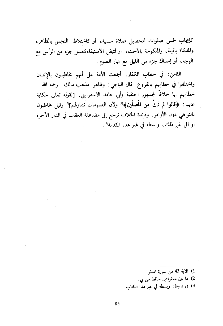 أَجْمَعَتِ الْأُمَّةُ عَلَى أَنَّهُمْ مُخَاطَبُونَ بِالْإِيمَانِ وَاخْتَلَفُوا فِي خِطَابِهِمْ بِالْفُرُوعِ قَالَ الْبَاجِيُّ وَظَاهِرُ مَذْهَبِ مَالك رَحمَه الله خِطَابُهُمْ بِهَا خِلَافًا لِجُمْهُورِ الْحَنَفِيَّةِ وَأَبِي حَامِدٍ الاسفرايني لِقَوْلِهِ تَعَالَى حِكَايَةً عَنْهُمْ {قَالُوا لَمْ نَكُ من الْمُصَلِّين} وَلِأَنَّ الْعُمُومَاتِ تَتَنَاوَلُهُمْ وَقِيلَ مُخَاطَبُونَ بِالنَّوَاهِي دُونَ الْأَوَامِرِ وَفَائِدَةُ الْخِلَافِ تَرْجِعُ إِلَى مُضَاعَفَةِ الْعِقَابِ فِي الدَّار الْآخِرَة أَوْ إِلَى غَيْرِ ذَلِكَ وَبَسْطُهُ فِي غَيْرِ هَذِه المقدمه