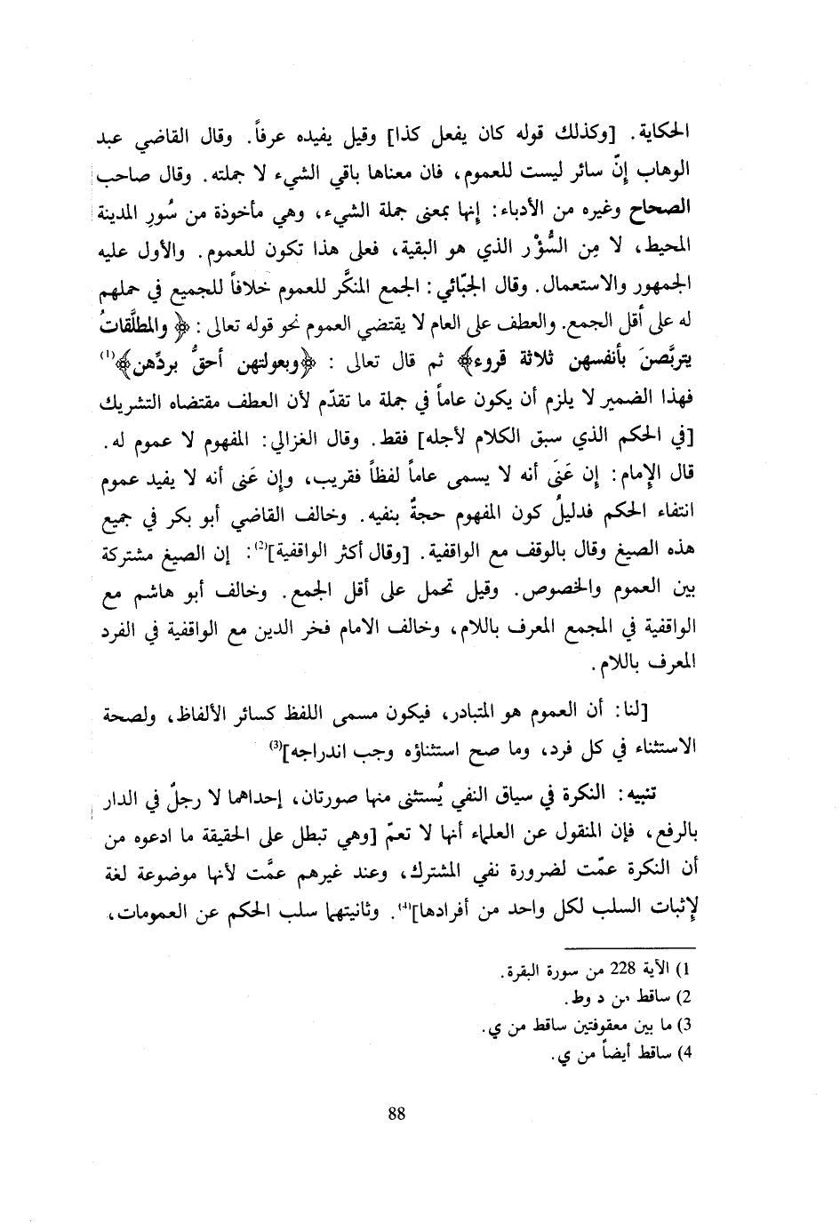 الْحِكَايَةِ وَكَذَلِكَ قَوْلُهُ كَانَ يَفْعَلُ كَذَا وَقِيلَ يُفِيدُهُ عُرْفًا وَقَالَ الْقَاضِي عَبْدُ الْوَهَّابِ إِنَّ سَائِرَ لَيْسَتْ لِلْعُمُومِ فَإِنَّ مَعْنَاهَا بَاقِي الشَّيْءِ لَا جُمْلَتُهُ وَقَالَ صَاحِبُ الصِّحَاحِ وَغَيْرُهُ مِنَ الْأُدَبَاءِ إِنَّهَا بِمَعْنَى جُمْلَةِ الشَّيْءِ وَهِيَ مَأْخُوذَةٌ من سور الْمَدِينَة الْمُحِيط لَا مِنَ السُّؤْرِ الَّذِي هُوَ الْبَقِيَّةُ فَعَلَى هَذَا تَكُونُ لِلْعُمُومِ وَالْأَوَّلُ عَلَيْهِ الْجُمْهُورُ وَالِاسْتِعْمَالُ وَقَالَ الْجُبَّائِيُّ الْجَمْعُ الْمُنَكَّرُ لِلْعُمُومِ خِلَافًا لِلْجَمِيعِ فِي حَمْلِهِمْ لَهُ عَلَى أَقَلِّ الْجَمْعِ وَالْعَطْفُ عَلَى الْعَامِّ لَا يَقْتَضِي الْعُمُومَ نَحْوَ قَوْلِهِ تَعَالَى {والمطلقات يَتَرَبَّصْنَ بِأَنْفُسِهِنَّ ثَلَاث قُرُوء} ثمَّ قَالَ تَعَالَى {وبعولتهن أَحَق بردهن} فَهَذَا الضَّمِيرُ لَا يَلْزَمُ أَنْ يَكُونَ عَامًّا فِي جُمْلَةِ مَا تَقَدَّمَ لِأَنَّ الْعَطْفَ مُقْتَضَاهُ التَّشْرِيكُ فِي الْحُكْمِ الَّذِي سَبَقَ الْكَلَامُ لِأَجْلِهِ فَقَطْ وَقَالَ الْغَزَّالِيُّ الْمَفْهُومُ لَا عُمُومَ لَهُ قَالَ الْإِمَامُ إِنْ عَنَى أَنَّهُ لَا يُسَمَّى عَاما لفظا فَقَرِيبٌ وَإِنْ عَنَى أَنَّهُ لَا يُفِيدُ عُمُومَ انْتِفَاء الحكم فدليل كَون الْمَفْهُوم حجَّة بنفيه وَخَالَفَ الْقَاضِي أَبُو بَكْرٍ فِي جَمِيعِ هَذِهِ الصِّيَغِ وَقَالَ بِالْوَقْفِ مَعَ الْوَاقِفِيَّةِ وَقَالَ أَكْثَرُ الْوَاقِفِيَّةِ إِنَّ الصِّيَغَ مُشْتَرَكَةٌ بَيْنَ الْعُمُومِ وَالْخُصُوصِ وَقِيلَ تُحْمَلُ عَلَى أَقَلِّ الْجَمْعِ وَخَالَفَ أَبُو هَاشم مَعَ الواقفية فِي الْمجمع الْمُعَرَّفِ بِاللَّامِ وَخَالَفَ الْإِمَامُ فَخْرُ الدِّينِ مَعَ الْوَاقِفِيَّةِ فِي الْفَرْدِ الْمُعَرَّفِ بِاللَّامِ لَنَا أَنَّ الْعُمُومَ هُوَ الْمُتَبَادِرُ فَيَكُونَ مُسَمَّى اللَّفْظِ كَسَائِرِ الْأَلْفَاظِ وَلِصِحَّةِ الِاسْتِثْنَاءِ فِي كُلِّ فَرْدٍ وَمَا صَحَّ اسْتِثْنَاؤُهُ وَجَبَ انْدِرَاجُهُ تَنْبِيهٌ النَّكِرَةُ فِي سِيَاقِ النَّفْيِ يُسْتَثْنَى مِنْهَا صُورَتَانِ إِحْدَاهُمَا لَا رَجُلٌ فِي الدَّارِ بِالرَّفْعِ فَإِنَّ الْمَنْقُولَ عَنِ الْعُلَمَاءِ أَنَّهَا لَا تَعُمُّ وَهِيَ تُبْطِلُ عَلَى الْحَقِيقَة مَا ادعوهُ من أَن النكرَة عَمَّتْ لِضَرُورَةِ نَفْيِ الْمُشْتَرَكِ وَعِنْدَ غَيْرِهِمْ عَمَّتْ لِأَنَّهَا مَوْضُوعَةٌ لُغَةً لِإِثْبَاتِ السَّلْبِ لِكُلِّ وَاحِدٍ مِنْ أَفْرَادِهَا وَثَانِيَتُهُمَا سَلْبُ الْحُكْمِ عَنِ الْعُمُومَاتِ