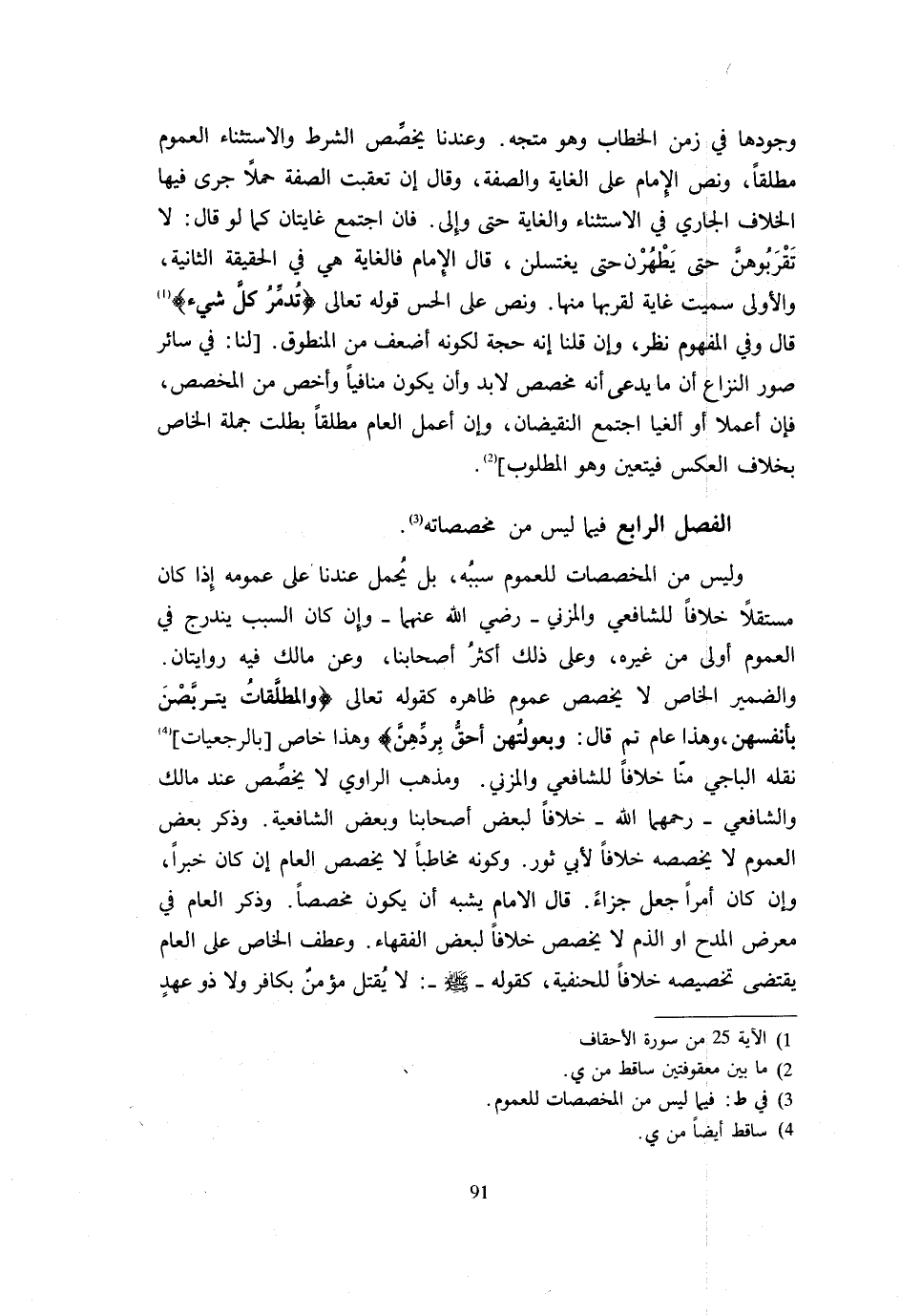 وُجُودُهُا فِي زَمَنِ الْخِطَابِ وَهُوَ مُتَّجِهٌ وَعِنْدَنَا يُخَصِّصُ الشَّرْطُ وَالِاسْتِثْنَاءُ الْعُمُومَ مُطْلَقًا وَنَصَّ الْإِمَامُ على الْغَايَة وَالصّفة وَقَالَ إِن تعقبت الصّفة حملا جَرَى فِيهَا الْخِلَافُ الْجَارِي فِي الِاسْتِثْنَاء وَالْغَايَةِ حَتَّى وَإِلَى فَإِنِ اجْتَمَعَ غَايَتَانِ كَمَا لَوْ قَالَ لَا تَقْرَبُوهُنَّ حَتَّى يَطْهُرْنَ حَتَّى يَغْتَسِلْنَ قَالَ الْإِمَامُ فَالْغَايَةُ هِيَ فِي الْحَقِيقَةِ الثَّانِيَةِ وَالْأُولَى سُمِّيَتْ غَايَةً لِقُرْبِهَا مِنْهَا وَنَصَّ عَلَى الْحس قَوْله تَعَالَى {تدمر كل شَيْء} قَالَ وَفِي الْمَفْهُومِ نَظَرٌ وَإِنْ قُلْنَا إِنَّهُ حجَّة لكَونه أَضْعَف من الْمَنْطُوق لَنَا فِي سَائِرِ صُوَرِ النِّزَاعِ أَنَّ مَا يُدْعَى أَنَّهُ مُخَصِّصٌ لَا بُدَّ وَأَنْ يَكُونَ مُنَافِيًا وَأَخَصَّ مِنَ الْمُخَصِّصِ فَإِنْ أُعْمِلَا أَوْ ألغيا اجْتمع النقيضان وَإِن أعمل مُطْلَقًا بَطَلَتْ جُمْلَةُ الْخَاصِّ بِخِلَافِ الْعَكْسِ فَيَتَعَيَّنُ وَهُوَ الْمَطْلُوب