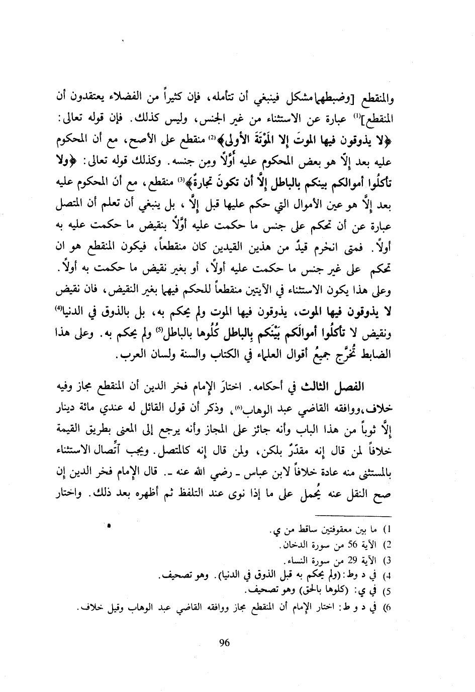 والمنقطع وضبطهما مُشْكِلٌ فَيَنْبَغِي أَنْ تَتَأَمَّلَهُ فَإِنَّ كَثِيرًا مِنَ الْفُضَلَاءِ يَعْتَقِدُونَ أَنَّ الْمُنْقَطِعَ عِبَارَةٌ عَنِ الِاسْتِثْنَاءِ مِنْ غَيْرِ الْجِنْسِ وَلَيْسَ كَذَلِكَ فَإِنَّ قَوْلَهُ تَعَالَى {لَا يَذُوقُونَ فِيهَا الْمَوْتَ إِلا الْمَوْتَةَ الأولى} مُنْقَطِعٌ عَلَى الْأَصَحِّ مَعَ أَنَّ الْمَحْكُومَ عَلَيْهِ بَعْدَ إِلَّا هُوَ بَعْضُ الْمَحْكُومِ عَلَيْهِ أَوَّلًا وَمن جنسه وَكَذَلِكَ قَوْله تَعَالَى {وَلَا تَأْكُلُوا أَمْوَالَكُمْ بَيْنَكُمْ بِالْبَاطِلِ إِلا أَنْ تَكُونَ تِجَارَة} مُنْقَطِعٌ مَعَ أَنَّ الْمَحْكُومَ عَلَيْهِ بَعْدَ إِلَّا هُوَ عَيْنُ الْأَمْوَالِ الَّتِي حُكِمَ عَلَيْهَا قَبْلَ إِلَّا بَلْ يَنْبَغِي أَنْ تَعْلَمَ أَنَّ الْمُتَّصِلَ عِبَارَةٌ عَنْ أَنْ تَحْكُمَ عَلَى جِنْسِ مَا حكمت عَلَيْهِ أَولا بنقيض مَا حكمت عَلَيْهِ بِهِ أَولا فَمَتَى انحرم قَيْدٌ مِنْ هَذَيْنِ الْقَيْدَيْنِ كَانَ مُنْقَطِعًا فَيَكُونُ الْمُنْقَطِعُ هُوَ أَنْ تَحْكُمَ عَلَى غَيْرِ جِنْسِ مَا حَكَمْتَ عَلَيْهِ أَوَّلًا أَوْ بِغَيْرِ نَقِيضِ مَا حَكَمْتَ بِهِ أَوَّلًا وَعَلَى هَذَا يَكُونُ الِاسْتِثْنَاءُ فِي الْآيَتَيْنِ مُنْقَطِعًا لِلْحُكْمِ فِيهِمَا بِغَيْرِ النَّقِيضِ فَإِنَّ نَقِيضَ {لَا يَذُوقُونَ فِيهَا الْمَوْتَ} يذوقون فِيهَا الْمَوْت وَلَمْ يَحْكُمْ بِهِ بَلْ بِالذَّوْقِ فِي الدُّنْيَا وَنَقِيضُ لَا {تَأْكُلُوا أَمْوَالَكُمْ بَيْنَكُمْ بِالْبَاطِلِ} كُلُوهَا بِالْبَاطِلِ وَلَمْ يَحْكُمْ بِهِ وَعَلَى هَذَا الضَّابِطِ تَخْرُجُ جَمِيعُ أَقْوَالِ الْعُلَمَاءِ فِي الْكِتَابِ وَالسُّنَّةِ ولسان الْعَرَب