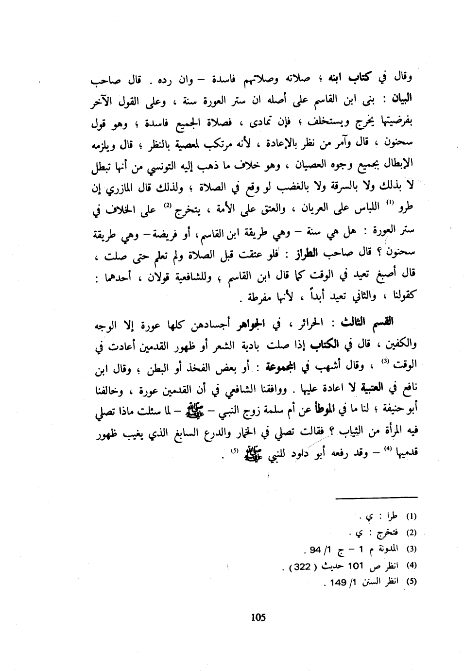 وَقَالَ فِي كِتَابِ ابْنِهِ صَلَاتُهُ وَصَلَاتُهُمْ فَاسِدَةٌ وَإِنْ رَدَّهُ قَالَ صَاحِبُ الْبَيَانِ بَنَى ابْنُ الْقَاسِمِ عَلَى أَصْلِهِ أَنَّ سَتْرَ الْعَوْرَةِ سُنَّةٌ وعَلى القَوْل الآخر بفريضيتها يَخْرُجُ وَيَسْتَخْلِفُ فَإِنْ تَمَادَى فَصَلَاةُ الْجَمِيعِ فَاسِدَةٌ وَهُوَ قَوْلُ سَحْنُونٍ قَالَ وَأُمِرَ مَنْ نَظَرَ بِالْإِعَادَةِ لِأَنَّهُ مُرْتَكِبٌ لِمَعْصِيَةٍ بِالنَّظَرِ قَالَ وَيَلْزَمُهُ الْإِبْطَالُ بِجَمِيعِ وُجُوهِ الْعِصْيَانِ وَهُوَ خِلَافُ مَا ذهب إِلَيْهِ التّونسِيّ من أَنَّهَا تبطل لَا بذلك وَلَا بِالسَّرقَةِ وَلَا بِالْغَضَبِ لَوْ وَقَعَ فِي الصَّلَاةِ وَلِذَلِكَ قَالَ الْمَازِرِيُّ إِنَّ طُرُوَّ اللِّبَاسِ عَلَى الْعُرْيَانِ وَالْعِتْقَ عَلَى الْأَمَةِ يَتَخَرَّجُ عَلَى الْخِلَافِ فِي سَتْرِ الْعَوْرَةِ هَلْ هِيَ سُنَّةٌ وَهِيَ طَرِيقَةُ ابْنِ الْقَاسِمِ أَوْ فَرِيضَةٌ وَهِيَ طَرِيقَةُ سَحْنُونٍ؟ قَالَ صَاحِبُ الطَّرَّازِ فَلَوْ عَتَقَتْ قَبْلَ الصَّلَاةِ وَلَمْ تَعْلَمْ حَتَّى صَلَّتْ قَالَ أَصْبَغُ تُعِيدُ فِي الْوَقْتِ كَمَا قَالَ ابْنُ الْقَاسِمِ وَلِلشَّافِعِيَّةِ قَوْلَانِ أَحَدُهُمَا كَقَوْلِنَا وَالثَّانِي تُعِيدُ أَبَدًا لِأَنَّهَا مُفَرِّطَةٌ الْقِسْمُ الثَّالِثُ الْحَرَائِرُ فِي الْجَوَاهِرِ أَجْسَادُهُنَّ كُلُّهَا عَوْرَةٌ إِلَّا الْوَجْهَ وَالْكَفَّيْنِ قَالَ فِي الْكِتَابِ إِذَا صَلَّتْ بَادِيَةَ الشَّعْرِ أَوْ ظُهُورِ الْقَدَمَيْنِ أَعَادَتْ فِي الْوَقْتِ وَقَالَ أَشْهَبُ فِي الْمَجْمُوعَةِ أَوْ بَعْضِ الْفَخِذِ أَوِ الْبَطْنِ وَقَالَ ابْنُ نَافِعٍ فِي الْعُتْبِيَّةِ لَا إِعَادَةَ عَلَيْهَا وَوَافَقَنَا الشَّافِعِيُّ فِي أَنَّ الْقَدَمَيْنِ عَوْرَةٌ وَخَالَفَنَا أَبُو حَنِيفَةَ لَنَا مَا فِي الْمُوَطَّأِ عَنْ أُمِّ سَلَمَةَ زوج النَّبِي - صَلَّى اللَّهُ عَلَيْهِ وَسَلَّم َ - لَمَّا سُئِلَتْ مَاذَا تُصَلِّي فِيهِ الْمَرْأَةُ مِنَ الثِّيَابِ؟ فَقَالَتْ تُصَلِّي فِي الْخِمَارِ وَالدِّرْعِ السَّابِغِ الَّذِي يُغَيِّبُ ظُهُورَ قَدَمَيْهَا وَقَدْ رَفَعَهُ أَبُو دَاوُد للنَّبِي - صَلَّى اللَّهُ عَلَيْهِ وَسَلَّم َ -
