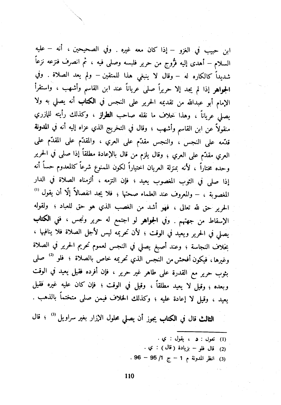 ابْنُ حَبِيبٍ فِي الْغَزْوِ إِذَا كَانَ مَعَهُ غَيْرُهُ وَفِي الصَّحِيحَيْنِ أَنَّهُ عَلَيْهِ السَّلَامُ أُهْدِيَ إِلَيْهِ فَرُّوجٌ مِنْ حَرِيرٍ فَلَبِسَهُ وَصَلَّى فِيهِ ثُمَّ انْصَرَفَ فَنَزَعَهُ نَزْعًا شَدِيدًا كَالْكَارِهِ لَهُ وَقَالَ لَا يَنْبَغِي هَذَا لِلْمُتَّقِينَ وَلَمْ يُعِدِ الصَّلَاةَ وَفِي الْجَوَاهِرِ إِذَا لَمْ يَجِدْ إِلَّا حَرِيرًا صَلَّى عُرْيَانًا عِنْدَ ابْنِ الْقَاسِمِ وَأَشْهَبَ وَاسْتَقْرَأَ الْإِمَامُ أَبُو عَبْدِ اللَّهِ مِنْ تَقْدِيمِهِ الْحَرِيرَ عَلَى النَّجِسِ فِي الْكِتَابِ أَنَّهُ يُصَلِّي بِهِ وَلَا يُصَلِّي عُرْيَانًا وَهَذَا خِلَافُ مَا نَقَلَهُ صَاحِبُ الطَّرَّازِ وَكَذَلِكَ رَأَيْتُهُ لِلْمَازِرِيِّ مَنْقُولًا عَنِ ابْنِ الْقَاسِمِ وَأَشْهَبَ وَقَالَ فِي التَّخْرِيجِ الَّذِي عَزَاهُ إِلَيْهِ أَنَّهُ فِي الْمُدَوَّنَةِ قَدَّمَهُ عَلَى النَّجِسِ وَالنَّجِسُ مُقَدَّمٌ عَلَى الْعُرْيِ وَالْمُقَدَّمُ عَلَى الْمُقَدَّمِ عَلَى الْعُرْيِ مُقَدَّمٌ عَلَى الْعُرْيِ وَقَالَ يَلْزَمُ مَنْ قَالَ بِالْإِعَادَةِ مُطْلَقًا إِذَا صَلَّى فِي الْحَرِيرِ وَحْدَهُ مُخْتَارًا لِأَنَّهُ بِمَنْزِلَةِ الْعُرْيَانِ اخْتِيَارًا لِكَوْنِ الْمَمْنُوعِ شَرْعًا كَالْمَعْدُومِ حِسًّا أَنَّهُ إِذَا صَلَّى فِي الثَّوْبِ الْمَغْصُوبِ يُعِيدُ فَإِن الْتَزمهُ ألزمناه الصَّلَاةِ فِي الدَّارِ الْمَغْصُوبَةِ وَالْمَعْرُوفُ عِنْدَ الْعُلَمَاءِ صِحَّتُهَا فَلَا يَجِدُ انْفِصَالًا إِلَّا أَنْ يَقُولَ الْحَرِيرُ حَقُّ اللَّهِ تَعَالَى فَهُوَ أَشَدُّ مِنَ الْغَصْبِ الَّذِي هُوَ حَقٌّ لِلْعِبَادِ وَلِقَوْلِهِ الْإِسْقَاطُ مِنْ جِهَتِهِمْ وَفِي الْجَوَاهِرِ لَوِ اجْتَمَعَ لَهُ حَرِيرٌ وَنَجِسٌ فَفِي الْكِتَابِ يُصَلِّي فِي الْحَرِيرِ وَيُعِيدُ فِي الْوَقْتِ لِأَنَّ تَحْرِيمَهُ لَيْسَ لِأَجْلِ الصَّلَاةِ فَلَا يُنَافِيهَا بِخِلَافِ النَّجَاسَةِ وَعِنْدَ أَصْبَغَ يُصَلِّي فِي النَّجِسِ لِعُمُومِ تَحْرِيمِ الْحَرِيرِ فِي الصَّلَاةِ وَغَيْرِهَا فَيَكُونُ أَفْحَشَ مِنَ النَّجِسِ الَّذِي تَحْرِيمُهُ خَاصٌّ بِالصَّلَاةِ فَلَوْ صَلَّى بِثَوْبٍ حَرِيرٍ مَعَ الْقُدْرَةِ عَلَى طَاهِرٍ غَيْرِ حَرِيرٍ فَإِنْ أَفْرَدَهُ فَقِيلَ يُعِيدُ فِي الْوَقْتِ وَبَعْدَهُ وَقِيلَ لَا يُعِيدُ مُطْلَقًا وَقِيلَ فِي الْوَقْتِ فَإِنْ كَانَ عَلَيْهِ غَيْرُهُ فَقِيلَ يُعِيدُ وَقِيلَ لَا إِعَادَةَ عَلَيْهِ وَكَذَلِكَ الْخِلَافُ فِيمَنْ صَلَّى مُتَخَتِّمًا بِالذَّهَبِ الثَّالِثُ قَالَ فِي الْكِتَابِ يَجُوزُ أَنْ يُصَلِّيَ مَحْلُولُ الْإِزَارِ بِغَيْرِ سَرَاوِيلَ قَالَ