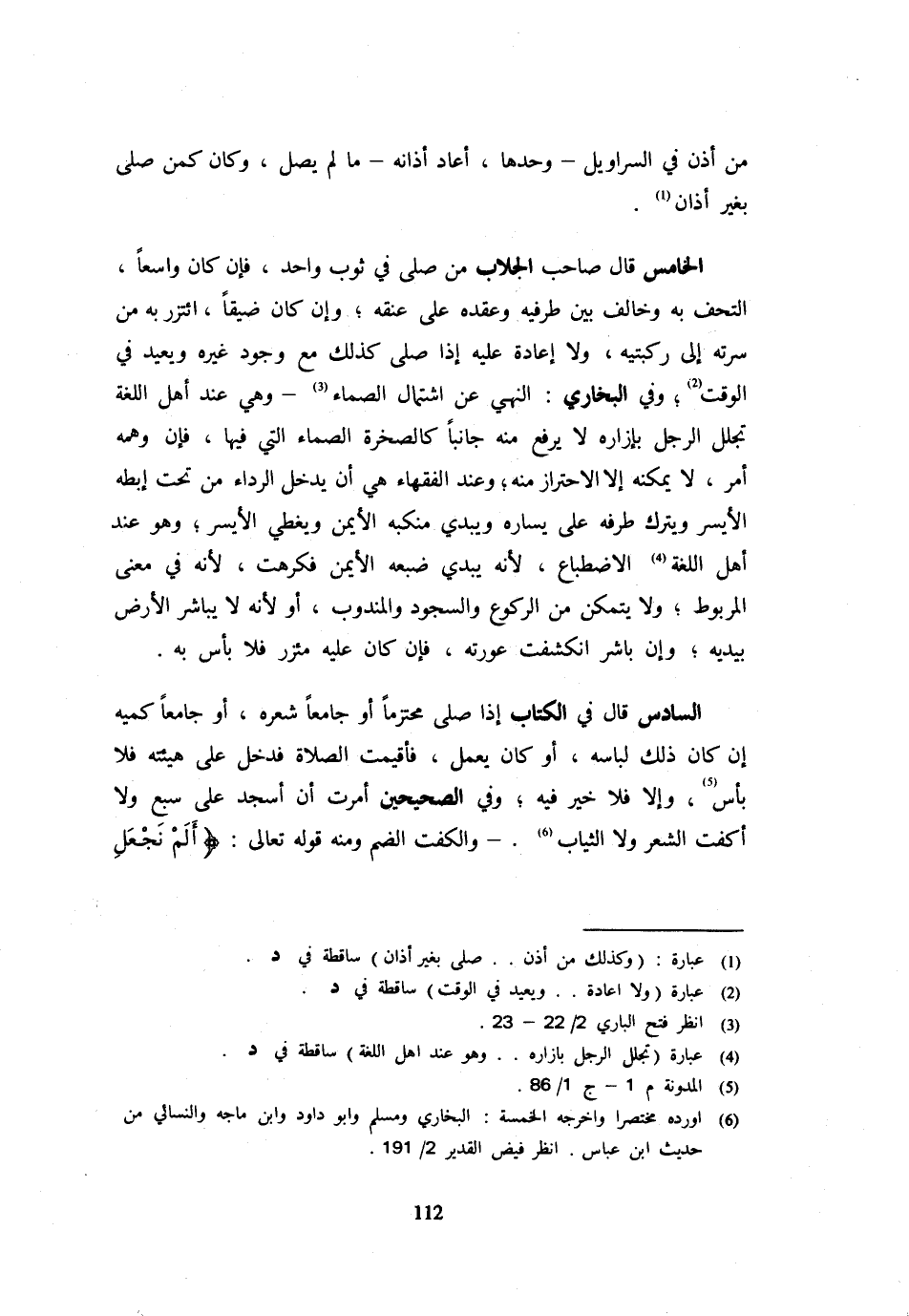 مَنْ أَذَّنَ فِي السَّرَاوِيلِ وَحْدَهَا أَعَادَ أَذَانَهُ مَا لَمْ يُصَلِّ وَكَانَ كَمَنْ صَلَّى بِغَيْرِ أَذَانٍ الْخَامِسُ قَالَ صَاحِبُ الْجُلَّابِ مَنْ صَلَّى فِي ثَوْبٍ وَاحِدٍ فَإِنْ كَانَ وَاسِعًا الْتَحَفَ بِهِ وَخَالَفَ بَيْنَ طَرَفَيْهِ وَعَقَدَهُ عَلَى عُنُقِهِ وَإِنْ كَانَ ضَيِّقًا ائْتَزَرَ بِهِ مِنْ سُرَّتِهِ إِلَى رُكْبَتَيْهِ وَلَا إِعَادَةَ عَلَيْهِ إِذَا صَلَّى كَذَلِكَ مَعَ وُجُودِ غَيْرِهِ وَيُعِيدُ فِي الْوَقْتِ وَفِي الْبُخَارِيِّ النَّهْيُ عَنِ اشْتِمَالِ الصَّمَّاءِ وَهِيَ عِنْدَ أَهْلِ اللُّغَةِ تَجَلُّلُ الرَّجُلِ بِإِزَارِهِ لَا يرفع مِنْهُ جَانِبًا كَالصَّخْرَةِ الصَّمَّاءِ الَّتِي فِيهَا فَإِنْ وهمه أَمر لَا يُمكنهُ إِلَّا الِاحْتِرَازُ مِنْهُ وَعِنْدَ الْفُقَهَاءِ هِيَ أَنْ يُدْخِلَ الرِّدَاءَ مِنْ تَحْتِ إِبِطِهِ الْأَيْسَرِ وَيَتْرُكُ طَرَفَهُ على يسَاره وَبِيَدِي مَنْكِبَهُ الْأَيْمَنَ وَيُغَطِّي الْأَيْسَرَ وَهُوَ عِنْدَ أَهْلِ اللُّغَةِ الِاضْطِبَاعُ لِأَنَّهُ يُبْدِي ضَبُعَهُ الْأَيْمَنَ فَكُرِهَتْ لِأَنَّهُ فِي مَعْنَى الْمَرْبُوطِ وَلَا يَتَمَكَّنُ مِنَ الرُّكُوعِ وَالسُّجُودِ وَالْمَنْدُوبِ أَوْ لِأَنَّهُ لَا يُبَاشِرُ الْأَرْضَ بِيَدَيْهِ وَإِنْ بَاشَرَ انْكَشَفَتْ عَوْرَتُهُ فَإِنْ كَانَ عَلَيْهِ مِئْزَرٌ فَلَا بَأْسَ بِهِ السَّادِسُ قَالَ فِي الْكِتَابِ إِذَا صَلَّى مُحْتَزِمًا أَوْ جَامِعًا شَعْرَهُ أَوْ جَامِعًا كُمَّيْهِ إِنْ كَانَ ذَلِكَ لِبَاسُهُ أَوْ كَانَ يَعْمَلُ فَأُقِيمَتِ الصَّلَاةُ فَدَخَلَ عَلَى هَيْئَتِهِ فَلَا بَأْسَ وَإِلَّا فَلَا خير فِيهِ وَفِي الصَّحِيحَيْنِ أُمِرْتُ أَنْ أَسْجُدَ عَلَى سَبْعٍ وَلَا أَكْفِتَ الشَّعْرَ وَلَا الثِّيَابَ وَالْكَفْتُ الضَّمُّ وَمِنْهُ قَوْله تَعَالَى {ألم نجْعَل